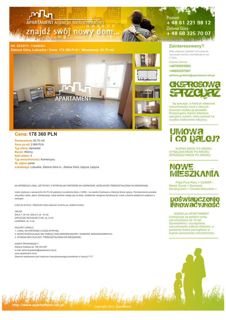 NR. OFERTY: 118490301 Zielona Góra, Lubuskie / Cena: 178 360 PLN / Mieszkanie: 63.70 m2 Zainteresowany? Żeby obejrzeć zadzwoń lub wyślij do nas swoje namiary skontaktujemy sie z Tobą. Grabska Adriana +48785053003 +48683257007 [email protected] Są sytuacje, w których właściciel nieruchomości musi z różnych przyczyn szybko ją sprzedać. Proponujemy Swoim Klientom specjalny system, który pozwoli na szybkie znalezienie nabywcy. Cena: 178 360 PLN Powierzchnia: 63.70 m2 Cena za m2: 2 800 PLN Typ oferty: Sprzedaż Rynek: Wtórny Ilość pieter: 3 Typ nieruchomości: Komercyjny Nr. piętra: parter Lokalizacja: Lubuskie, Zielona Góra m., Zielona Góra, Łężyca, Łężyca NA SPRZEDAŻ LOKAL UŻYTKOWY Z WITRYNĄ NA PARTERZE NA CZARKOWIE. MOŻLIWOŚĆ PRZEKSZTAŁCENIA NA MIESZKANIE. KUPNO KROK PO KROKU WYNAJEM KROK PO KROKU SPRZEDAŻ KROK PO KROKU Piąta Pora Roku > GUMAR Marek Guner > Bachalski Development > Osiedle Mazurskie > Lokal użytkowy o powierzchni 63.70 m2 położony na parterze bloku z 2008 r. na osiedlu Czarkowo w Zielonej Górze Łężycy. Pomieszczenie posiada wszystkie media, alarm, klimatyzacja. Lokal świetnie nadaje się na sklep, działalność usługowo-handlową itp. Lokal z dwoma odrębnymi wejściem z zewnątrz. Lokal do remontu. Właściciel może wykonać remontu po ustaleniu kwoty. UKŁAD: SALA 1: 24 m2, SALA 2: ok. 10 m2, ZAPLECZE SOCJALNE Z WC: ok. 6 m2 ŁAZIENKA: ok. 4 m2 WALORY LOKALU: 1. LOKAL NA PARTERZE Z DUŻĄ WITRYNĄ. 2. NOWO ROZWIJAJĄCE SIĘ OSIEDLE WIELOMIESZKANIOWE I DOMKÓW JEDNORODZINNYCH. 3. WYDANA DECYZJA DOT. PRZEKSZTAŁCENIA NA MIESZKANIE. AGENT PROWADZĄCY: Adriana Grabska tel. 785 053 003 e-mail: [email protected], www.apartament.net.pl Zlecenie realizowane pod nadzorem licencjonowanego pośrednika nr licencji 1717 http://www.apartament.net.pl AGENCJA APARTAMENT funkcjonuje na polskim rynku nieruchomości od 15 lat! Sprzedaliśmy i wynajęliśmy nieruchomości setkom Klientów, a podobnej liczbie pomogliśmy w kupnie wymarzonej nieruchomości.