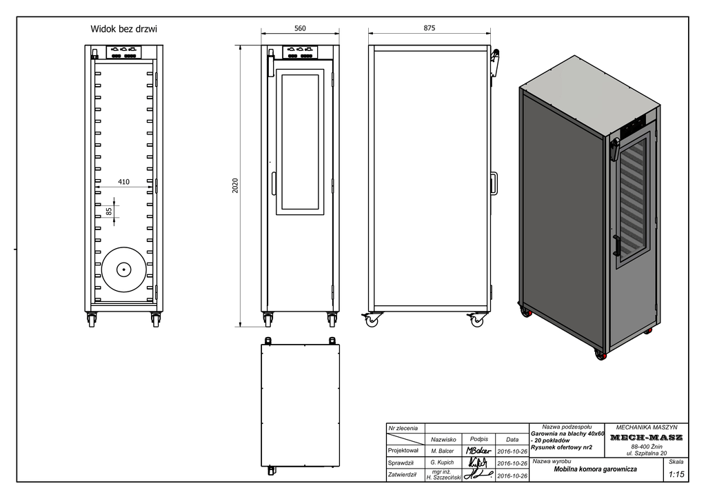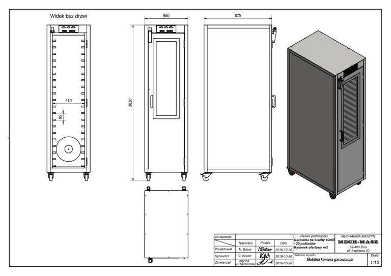 Widok bez drzwi 2020 85 410 875 560 Nr zlecenia Nazwisko Podpis Data Nazwa podzespo u Garownia na blachy 40x60 - 20 pok ad w Rysunek ofertowy nr2 MECHANIKA MASZYN MECH-MASZ 88-400 nin ul. Szpitalna 20 Projektowa M. Balcer 2016-10-26 Sprawdzi G. Kupich 2016-10-26 Nazwa wyrobu Skala Zatwierdzi mgr in . H. Szczeci ski 2016-10-26 1:15 Mobilna komora garownicza