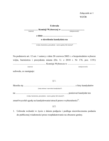 Załącznik nr 1 WZÓR Uchwała ....................... Komisji Wyborczej w ....................................... (nazwa) (miejscowość) z dnia ………………………………. o skreśleniu kandydata na ............................................................................ (wójta, burmistrza, prezydenta - nazwa gminy lub miasta)* Na podstawie art. 12 ust. 1 ustawy z dnia 20 czerwca 2002 r. o bezpośrednim wyborze wójta, burmistrza i prezydenta miasta (Dz. U. z 2010 r. Nr 176, poz. 1191) ....................................................... Komisja Wyborcza w ............................................... (nazwa) (miejscowość) uchwala, co następuje: § 1. Skreśla się ……………………………………..………………… z listy kandydatów (imię-imiona i nazwisko kandydata)*) na ......................................................................................., ponieważ kandydat ten (wójta, burmistrza, prezydenta - nazwa gminy lub miasta)*) zmarł/wycofał zgodę na kandydowanie/utracił prawo wybieralności*). § 2. 1. Uchwała wchodzi w życie z dniem podjęcia i podlega niezwłocznemu podaniu do publicznej wiadomości przez rozplakatowanie na obszarze gminy. 2 2. Druk i rozplakatowanie uchwały zapewni ............................................................. (wójt, burmistrz, prezydent - nazwa gminy lub miasta)*) (pieczęć Komisji) Przewodniczący Komisji: …………………………………… (imię i nazwisko) Zastępca Przewodniczącego: …………………………………… (imię i nazwisko) Członkowie: …………………………………… (imię i nazwisko) …………………………………… (imię i nazwisko) …………………………………… (imię i nazwisko) …………………………………… (imię i nazwisko) …………………………………… (imię i nazwisko) …………………………………… (imię i nazwisko) …………………………………… (imię i nazwisko) _________ *) Wpisać odpowiednio. ………………………………….…. (podpis) ……………………………….……. (podpis) ……………………………….……. (podpis) ……………………………….……. (podpis) ……………………………….……. (podpis) ……………………………….……. (podpis) ……………………………….……. (podpis) ……………………………….……. (podpis) ……………………………….……. (podpis) 3 Załącznik nr 2 WZÓR Uchwała Obwodowej Komisji Wyborczej Nr … w ....................................... (miejscowość) z dnia ……………………………….. w sprawie zakończenia głosowania i nieustalenia wyniku ponownego głosowania w wyborach ………………………………………………… (wójta, burmistrza, prezydenta miasta - nazwa gminy lub miasta)* Na podstawie art. 14 pkt 3 ustawy z dnia 20 czerwca 2002 r. o bezpośrednim wyborze wójta, burmistrza, prezydenta miasta (Dz. U. z 2010 r. Nr 176, poz. 1191), w związku z pkt 1 wytycznych dla gminnych i obwodowych komisji wyborczych, dotyczących sposobu postępowania w wyborach wójta, burmistrza i prezydenta miasta w sytuacji, gdy w ponownym głosowaniu wystąpią przesłanki do skreślenia kandydata w dniu głosowania, stanowiących załącznik do uchwały Państwowej Komisji Wyborczej z dnia 25 października 2010 r. (M. P. Nr …., poz. ….) Obwodowa Komisja Wyborcza Nr …… w ................................ uchwala, co następuje: (miejscowość) § 1. W związku z uchwałą ………..……………………………..…. Komisji Wyborczej (nazwa) w ………………………. o przeprowadzeniu w dniu ……………..… ponownego (miejscowość) głosowania w wyborach ………………….............................................................. (wójta, burmistrza, prezydenta - nazwa gminy lub miasta)* 1) głosowanie w dniu ……………………… ulega zakończeniu; 2) postanawia się o nieustaleniu wyników głosowania, o którym mowa w pkt 1. 4 § 2. Uchwała wchodzi w życie z dniem podjęcia i podlega podaniu do publicznej wiadomości w lokalu wyborczym. Przewodniczący Obwodowej Komisji Wyborczej Nr … w ............................... (miejscowość) (pieczęć Komisji) ................................... (imię i nazwisko) _________ *) Wpisać odpowiednio. 5 Załącznik nr 3 WZÓR Uchwała ....................... Komisji Wyborczej w ....................................... (nazwa) (miejscowość) z dnia 5 grudnia 2010 r. o skreśleniu kandydata na ............................................................................ (wójta, burmistrza, prezydenta - nazwa gminy lub miasta)*) Na podstawie art. 11 ust. 2 i 6 oraz art. 12 ust. 1 ustawy z dnia 20 czerwca 2002 r. o bezpośrednim wyborze wójta, burmistrza i prezydenta miasta (Dz. U. z 2010 r. Nr 176, poz. 1191) ................................ Komisja Wyborcza w ...................................... (nazwa) (miejscowość) uchwala, co następuje: § 1. Skreśla się ……………………………………..………………… z listy kandydatów (imię-imiona i nazwisko kandydata)*) na ..............................................................................................., ponieważ kandydat ten (wójta, burmistrza, prezydenta - nazwa gminy lub miasta)*) zmarł/wycofał zgodę na kandydowanie/utracił prawo wybieralności*). § 2. W związku z brakiem zarejestrowanych kandydatów w wyborach bezpośrednich, wyboru ……………………………………………………….………. dokona Rada (wójta, burmistrza, prezydenta - nazwa gminy lub miasta)*) ……………………… (miasta, gminy) 6 § 3. 1. Uchwała wchodzi w życie z dniem podjęcia i podlega niezwłocznemu podaniu do publicznej wiadomości przez rozplakatowanie na obszarze gminy. 2. Druk i rozplakatowanie uchwały zapewni ..........