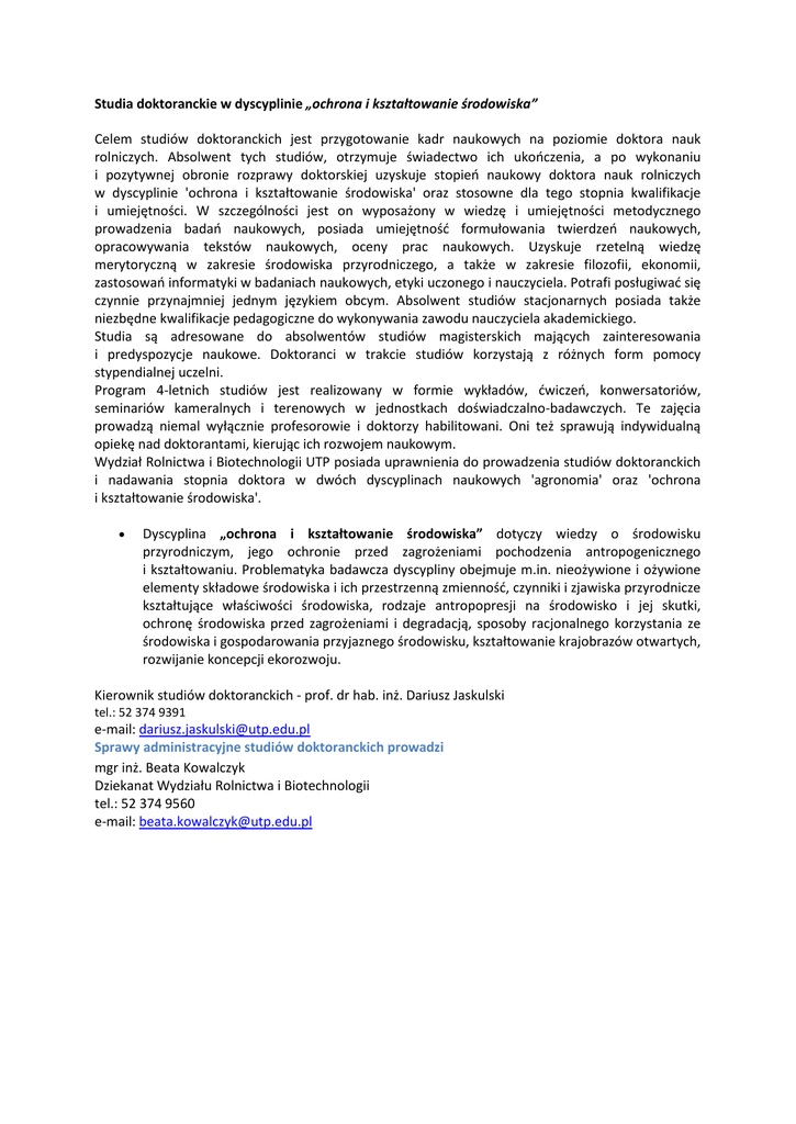 Studia doktoranckie w dyscyplinie „ochrona i kształtowanie środowiska” Celem studiów doktoranckich jest przygotowanie kadr naukowych na poziomie doktora nauk rolniczych. Absolwent tych studiów, otrzymuje świadectwo ich ukończenia, a po wykonaniu i pozytywnej obronie rozprawy doktorskiej uzyskuje stopień naukowy doktora nauk rolniczych w dyscyplinie 'ochrona i kształtowanie środowiska' oraz stosowne dla tego stopnia kwalifikacje i umiejętności. W szczególności jest on wyposażony w wiedzę i umiejętności metodycznego prowadzenia badań naukowych, posiada umiejętność formułowania twierdzeń naukowych, opracowywania tekstów naukowych, oceny prac naukowych. Uzyskuje rzetelną wiedzę merytoryczną w zakresie środowiska przyrodniczego, a także w zakresie filozofii, ekonomii, zastosowań informatyki w badaniach naukowych, etyki uczonego i nauczyciela. Potrafi posługiwać się czynnie przynajmniej jednym językiem obcym. Absolwent studiów stacjonarnych posiada także niezbędne kwalifikacje pedagogiczne do wykonywania zawodu nauczyciela akademickiego. Studia są adresowane do absolwentów studiów magisterskich mających zainteresowania i predyspozycje naukowe. Doktoranci w trakcie studiów korzystają z różnych form pomocy stypendialnej uczelni. Program 4-letnich studiów jest realizowany w formie wykładów, ćwiczeń, konwersatoriów, seminariów kameralnych i terenowych w jednostkach doświadczalno-badawczych. Te zajęcia prowadzą niemal wyłącznie profesorowie i doktorzy habilitowani. Oni też sprawują indywidualną opiekę nad doktorantami, kierując ich rozwojem naukowym. Wydział Rolnictwa i Biotechnologii UTP posiada uprawnienia do prowadzenia studiów doktoranckich i nadawania stopnia doktora w dwóch dyscyplinach naukowych 'agronomia' oraz 'ochrona i kształtowanie środowiska'. • Dyscyplina „ochrona i kształtowanie środowiska” dotyczy wiedzy o środowisku przyrodniczym, jego ochronie przed zagrożeniami pochodzenia antropogenicznego i kształtowaniu. Problematyka badawcza dyscypliny obejmuje m.in. nieożywione i ożywione elementy składowe środowiska i ich przestrzenną zmienność, czynniki i zjawiska przyrodnicze kształtujące właściwości środowiska, rodzaje antropopresji na środowisko i jej skutki, ochronę środowiska przed zagrożeniami i degradacją, sposoby racjonalnego korzystania ze środowiska i gospodarowania przyjaznego środowisku, kształtowanie krajobrazów otwartych, rozwijanie koncepcji ekorozwoju. Kierownik studiów doktoranckich - prof. dr hab. inż. Dariusz Jaskulski tel.: 52 374 9391 e-mail: [email protected] Sprawy administracyjne studiów doktoranckich prowadzi mgr inż. Beata Kowalczyk Dziekanat Wydziału Rolnictwa i Biotechnologii tel.: 52 374 9560 e-mail: [email protected]
