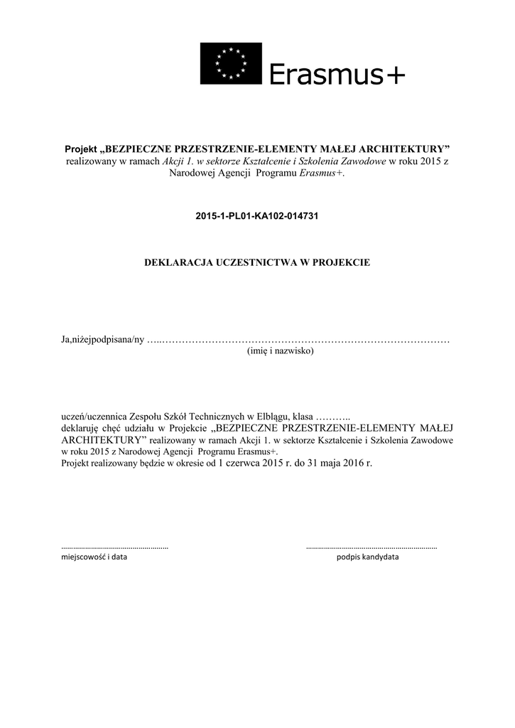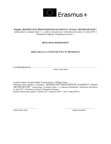 Projekt „BEZPIECZNE PRZESTRZENIE-ELEMENTY MAŁEJ ARCHITEKTURY” realizowany w ramach Akcji 1. w sektorze Kształcenie i Szkolenia Zawodowe w roku 2015 z Narodowej Agencji Programu Erasmus+. 2015-1-PL01-KA102-014731 DEKLARACJA UCZESTNICTWA W PROJEKCIE Ja,niżejpodpisana/ny …..…………………………………………………………………………… (imię i nazwisko) uczeń/uczennica Zespołu Szkół Technicznych w Elblągu, klasa ……….. deklaruję chęć udziału w Projekcie „BEZPIECZNE PRZESTRZENIE-ELEMENTY MAŁEJ ARCHITEKTURY” realizowany w ramach Akcji 1. w sektorze Kształcenie i Szkolenia Zawodowe w roku 2015 z Narodowej Agencji Programu Erasmus+. Projekt realizowany będzie w okresie od 1 czerwca 2015 r. do 31 maja 2016 r. ……………………………………………… miejscowość i data ………………………………………………………… podpis kandydata