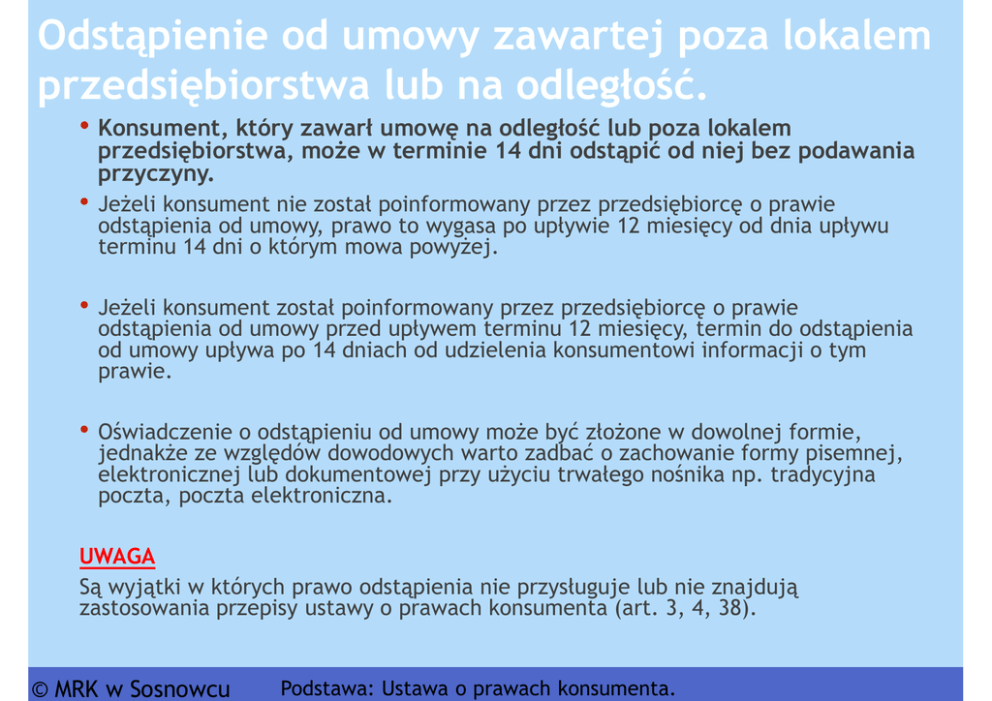 Odstąpienie od umowy zawartej poza lokalem przedsiębiorstwa lub na odległość. • Konsument, który zawarł umowę na odległość lub poza lokalem przedsiębiorstwa, może w terminie 14 dni odstąpić od niej bez podawania przyczyny. • Jeżeli konsument nie został poinformowany przez przedsiębiorcę o prawie odstąpienia od umowy, prawo to wygasa po upływie 12 miesięcy od dnia upływu terminu 14 dni o którym mowa powyżej. • Jeżeli konsument został poinformowany przez przedsiębiorcę o prawie odstąpienia od umowy przed upływem terminu 12 miesięcy, termin do odstąpienia od umowy upływa po 14 dniach od udzielenia konsumentowi informacji o tym prawie. • Oświadczenie o odstąpieniu od umowy może być złożone w dowolnej formie, jednakże ze względów dowodowych warto zadbać o zachowanie formy pisemnej, elektronicznej lub dokumentowej przy użyciu trwałego nośnika np. tradycyjna poczta, poczta elektroniczna. UWAGA Są wyjątki w których prawo odstąpienia nie przysługuje lub nie znajdują zastosowania przepisy ustawy o prawach konsumenta (art. 3, 4, 38). © MRK w Sosnowcu Podstawa: Ustawa o prawach konsumenta.