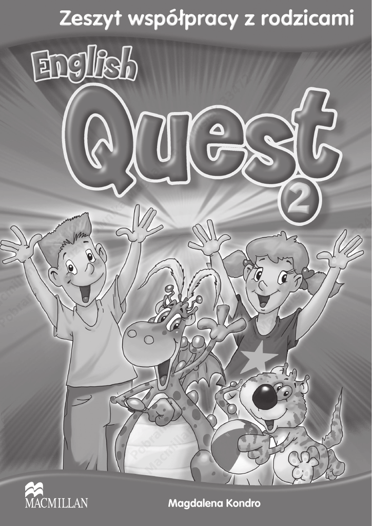 M b ac ran o m p ill an rze Ed z u uc ży at tk ow io n Po a ni k da l ag M en a Za w k la iś 33 4 Po acm br il an la o nE pr d ze uc z at uż io yt n ko w ni ka M da le na ag Za w iś l ak 33 47 2 Zeszyt współpracy z rodzicami Magdalena Kondro M b ac ran o m p ill an rze Ed z u uc ży at tk ow io n Po a ni k da l ag M en a Za w k la iś 33 4 Po acm br il an la o nE pr d ze uc z at uż io yt n ko w ni ka M da le na ag Za w iś l ak 33 47 2 Wstep ak 33 47 2 Zeszyt współpracy z rodzicami został stworzony po to, aby ułatwić rodzicom i opiekunom czynne uczestnictwo w nauce dziecka oraz pomóc im zachęcić dziecko do kontaktu z językiem angielskim w życiu codziennym. Im częściej dziecko ma kontakt z językiem obcym, tym szybsze są jego postępy w nauce. M ag da le na Za w iś l Dzieci najłatwiej przyswajają i utrwalają wiedzę poprzez zabawę, dlatego Zeszyt zawiera propozycje różnego rodzaju gier i zabaw, które rodzic może z łatwością, bez specjalnego przygotowania organizować w domu. Ponadto Zeszyt zawiera listę słów i zwrotów, treści historyjek i teksty piosenek, które uczeń poznaje na lekcji. Dzięki temu rodzic wie, jaki materiał został wprowadzony w trakcie zajęć i co może wykorzystywać we wspólnych zabawach z dzieckiem. 33 4 k M Po b ac ran o m p ill an rze Ed z u uc ży at tk ow io n ni k a M ag da l en a Za w iś la Po acm br il an la o nE pr d ze uc z at uż io yt n ko w ni ka Rodzic może skutecznie pomagać dziecku w nauce języka angielskiego, nawet jeśli sam nim nie włada. W zabawach to przede wszystkim dziecko ma posługiwać się językiem obcym. Wsparcie stanowią płyty dołączone do Książki ucznia: płyta z piosenkami, które dziecko poznaje na lekcji, oraz CD-ROM, na którym zamieszczone są historyjki z podręcznika w wersji animowanej i rozmaite gry językowe. Warto także wspólnie z dzieckiem przeglądać Zeszyt ćwiczeń English Quest 2, w którym wszystkie polecenia są podane w języku polskim, co ułatwia sprawdzanie wykonania zadań. 3 Struktura Książki ucznia English Quest 2 M Po b ac ran o m p ill an rze Ed z u uc ży at tk ow io n ni k a M ag da l en a Za w 4 33 4 k iś la Po acm br il an la o nE pr d ze uc z at uż io yt n ko w ni ka M ag da le na Za w iś l ak 33 47 2 Książka ucznia składa się z sześciu głównych rozdziałów, rozdziału wstępnego Hello again!, lekcji powtórzeniowych Techna Zone, lekcji świątecznych, ćwiczeń na dodatkowe słownictwo związane z tematyką rozdziałów, słowniczka obrazkowego oraz miniprzedstawienia. Każdy z sześciu rozdziałów jest podzielony na osiem lekcji i ma podobną strukturę: Lekcja 1 – uczeń poznaje tematykę rozdziału i nowe słowa, śpiewa piosenkę oraz uczestniczy w grze językowej Techna’s Bridge; Lekcja 2 –uczeń śpiewa piosenkę, wykonuje karty obrazkowe i wykorzystuje je w grach językowych; Lekcja 3 –uczeń słucha historyjki i wykonuje zadania związane z jej fabułą; Lekcja 4 –uczeń poznaje wymowę poszczególnych dźwięków języka angielskiego, powtarza rymowankę i odgrywa scenki dialogowe; Lekcja 5 –uczeń poznaje nowe słowa/zwroty, łączące tematykę rozdziału z innymi przedmiotami szkolnymi; Lekcja 6 –uczeń śpiewa piosenkę i poznaje jeden z aspektów kultury Wielkiej Brytanii, związany z tematyką rozdziału; Lekcja 7 – uczeń wykonuje zadania i uczestniczy w grach powtarzających materiał z całego rozdziału; Lekcja 8 –uczeń przykleja naklejki i uzupełnia zdania w słowniczku obrazkowym. Gry i zabawy iś l ak 33 47 2 Przedstawione poniżej gry i zabawy mogą być stosowane z każdym zestawem słownictwa w rozdziałach 1–6 podręcznika. Każdorazowo poprawność odpowiedzi dziecka można sprawdzać, korzystając z tabeli ze słownictwem i zwrotami zamieszczonej na początku każdego rozdziału w Zeszycie. Gry oznaczone symbolem * wymagają od rodzica podstawowej znajomości języka angielskiego. Za w Pokazywanie na migi 33 4 k en a Za w iś Ty i dziecko w myślach wybierzcie trzy słowa z danego rozdziału i je zapiszcie lub zilustrujcie, nie pokazując sobie nawzajem, jakie słowa wybraliście. Spróbujcie je odgadnąć, na zmianę wymieniając kolejno po jednym słowie. Wygrywa osoba, która pierwsza odgadnie trzy słowa wybrane przez przeciwnika. la Po acm br il an la o nE pr d ze uc z at uż io yt n ko w ni Telepatia * ka M ag da le na Przygotuj minutnik i otwórzcie podręcznik na Lekcji 1 wybranego rozdziału. Zademonstruj za pomocą gestów 8 słów. Dziecko odgaduje, które słowo pokazujesz. Sprawdźcie, czy uda się wam pokazać i odgadnąć wszystkie słowa w ciągu 2 minut. Powtórzcie zabawę, każdorazowo demonstrując słowa w innej kolejności i skracając limit czasowy. ag da l Pisanie palcem b ac ran o m p ill an rze Ed z u uc ży at tk ow io n ni k a M Napisz palcem w powietrzu lub na plecach dziecka wybrane słowo z danego rozdziału. Dziecko zgaduje, jaki wyraz piszesz. Następnie zamieńcie się rolami. Druga ręka * M Po Jeśli jesteś praworęczny, weź ołówek w lewą rękę, jeśli leworęczny – w prawą. Zilustruj na kartce wybrane słowo z danego rozdziału. Dziecko zgaduje, co narysowałeś. Następnie zamieńcie się rolami. Dziecko rysuje ręką, której normalnie nie używa do rysowania. Zgadnij, co przedstawia rysunek. Po kilku rundach powtórzcie zabawę, pisząc wyrazy. Wszystkie rysunki i wyrazy powinny być na oddzielnych kartkach. Na końcu przemieszajcie kartki, a następnie powiedzcie, co jest narysowane lub napisane na każdej z nich. 5 Znikające karteczki da le na Za w iś l ak 33 47 2 Przygotuj karteczki i na części z nich napisz z dzieckiem wyrazy z danego rozdziału. Na drugiej części zróbcie odpowiadające wyrazom ilustracje. Ułóż karteczki z rysunkami w rzędzie, w dowolnej kolejności, obrazkami do góry. Poproś dziecko, aby wskazywało kolejno na karteczki i mówiło, co przedstawiają rysunki. Następnie dziecko powtarza słowa od początku 