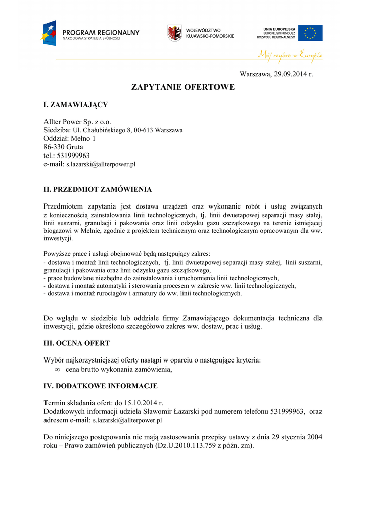 Warszawa, 29.09.2014 r. ZAPYTANIE OFERTOWE I. ZAMAWIAJĄCY Allter Power Sp. z o.o. Siedziba: Ul. Chałubińskiego 8, 00-613 Warszawa Oddział: Mełno 1 86-330 Gruta tel.: 531999963 e-mail: [email protected] II. PRZEDMIOT ZAMÓWIENIA Przedmiotem zapytania jest dostawa urządzeń oraz wykonanie robót i usług związanych z koniecznością zainstalowania linii technologicznych , tj. linii dwuetapowej separacji masy stałej, linii suszarni, granulacji i pakowania oraz linii odzysku gazu szczątkowego na terenie istniejącej biogazowi w Mełnie, zgodnie z projektem technicznym oraz technologicznym opracowanym dla ww. inwestycji. Powyższe prace i usługi obejmować będą następujący zakres: - dostawa i montaż linii technologicznych, tj. linii dwuetapowej separacji masy stałej, linii suszarni, granulacji i pakowania oraz linii odzysku gazu szczątkowego, - prace budowlane niezbędne do zainstalowania i uruchomienia linii technologicznych, - dostawa i montaż automatyki i sterowania procesem w zakresie ww. linii technologicznych, - dostawa i montaż rurociągów i armatury do ww. linii technologicznych. Do wglądu w siedzibie lub oddziale firmy Zamawiającego dokumentacja techniczna dla inwestycji, gdzie określono szczegółowo zakres ww. dostaw, prac i usług. III. OCENA OFERT Wybór najkorzystniejszej oferty nastąpi w oparciu o następujące kryteria: • cena brutto wykonania zamówienia, IV. DODATKOWE INFORMACJE Termin składania ofert: do 15.10.2014 r. Dodatkowych informacji udziela Sławomir Łazarski pod numerem telefonu 531999963, oraz adresem e-mail: [email protected] Do niniejszego postępowania nie mają zastosowania przepisy ustawy z dnia 29 stycznia 2004 roku – Prawo zamówień publicznych (Dz.U.2010.113.759 z późn. zm). Inwestycja realizowana jest w ramach projektu pn. „Optymalizacja energetyczna biogazowni”. Projekt jest współfinansowany ze środków Europejskiego Funduszu Rozwoju Regionalnego w ramach Regionalnego Programu Operacyjnego Województwa KujawskoPomorskiego na lata 2007-2013 oraz ze środków budżetu państwa.