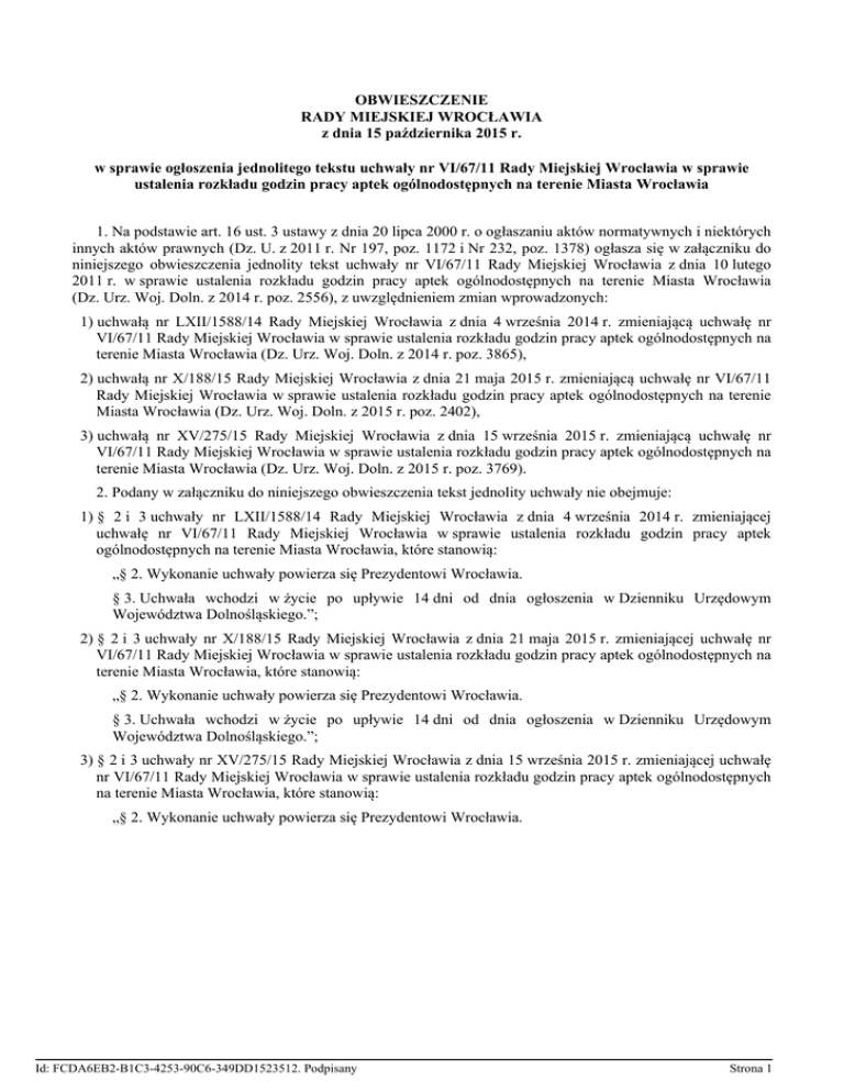 OBWIESZCZENIE RADY MIEJSKIEJ WROCŁAWIA z dnia 15 października 2015 r. w sprawie ogłoszenia jednolitego tekstu uchwały nr VI/67/11 Rady Miejskiej Wrocławia w sprawie ustalenia rozkładu godzin pracy aptek ogólnodostępnych na terenie Miasta Wrocławia 1. Na podstawie art. 16 ust. 3 ustawy z dnia 20 lipca 2000 r. o ogłaszaniu aktów normatywnych i niektórych innych aktów prawnych (Dz. U. z 2011 r. Nr 197, poz. 1172 i Nr 232, poz. 1378) ogłasza się w załączniku do niniejszego obwieszczenia jednolity tekst uchwały nr VI/67/11 Rady Miejskiej Wrocławia z dnia 10 lutego 2011 r. w sprawie ustalenia rozkładu godzin pracy aptek ogólnodostępnych na terenie Miasta Wrocławia (Dz. Urz. Woj. Doln. z 2014 r. poz. 2556), z uwzględnieniem zmian wprowadzonych: 1) uchwałą nr LXII/1588/14 Rady Miejskiej Wrocławia z dnia 4 września 2014 r. zmieniającą uchwałę nr VI/67/11 Rady Miejskiej Wrocławia w sprawie ustalenia rozkładu godzin pracy aptek ogólnodostępnych na terenie Miasta Wrocławia (Dz. Urz. Woj. Doln. z 2014 r. poz. 3865), 2) uchwałą nr X/188/15 Rady Miejskiej Wrocławia z dnia 21 maja 2015 r. zmieniającą uchwałę nr VI/67/11 Rady Miejskiej Wrocławia w sprawie ustalenia rozkładu godzin pracy aptek ogólnodostępnych na terenie Miasta Wrocławia (Dz. Urz. Woj. Doln. z 2015 r. poz. 2402), 3) uchwałą nr XV/275/15 Rady Miejskiej Wrocławia z dnia 15 września 2015 r. zmieniającą uchwałę nr VI/67/11 Rady Miejskiej Wrocławia w sprawie ustalenia rozkładu godzin pracy aptek ogólnodostępnych na terenie Miasta Wrocławia (Dz. Urz. Woj. Doln. z 2015 r. poz. 3769). 2. Podany w załączniku do niniejszego obwieszczenia tekst jednolity uchwały nie obejmuje: 1) § 2 i 3 uchwały nr LXII/1588/14 Rady Miejskiej Wrocławia z dnia 4 września 2014 r. zmieniającej uchwałę nr VI/67/11 Rady Miejskiej Wrocławia w sprawie ustalenia rozkładu godzin pracy aptek ogólnodostępnych na terenie Miasta Wrocławia, które stanowią: „§ 2. Wykonanie uchwały powierza się Prezydentowi Wrocławia. § 3. Uchwała wchodzi w życie po upływie 14 dni od dnia ogłoszenia w Dzienniku Urzędowym Województwa Dolnośląskiego.”; 2) § 2 i 3 uchwały nr X/188/15 Rady Miejskiej Wrocławia z dnia 21 maja 2015 r. zmieniającej uchwałę nr VI/67/11 Rady Miejskiej Wrocławia w sprawie ustalenia rozkładu godzin pracy aptek ogólnodostępnych na terenie Miasta Wrocławia, które stanowią: „§ 2. Wykonanie uchwały powierza się Prezydentowi Wrocławia. § 3. Uchwała wchodzi w życie po upływie 14 dni od dnia ogłoszenia w Dzienniku Urzędowym Województwa Dolnośląskiego.”; 3) § 2 i 3 uchwały nr XV/275/15 Rady Miejskiej Wrocławia z dnia 15 września 2015 r. zmieniającej uchwałę nr VI/67/11 Rady Miejskiej Wrocławia w sprawie ustalenia rozkładu godzin pracy aptek ogólnodostępnych na terenie Miasta Wrocławia, które stanowią: „§ 2. Wykonanie uchwały powierza się Prezydentowi Wrocławia. Id: FCDA6EB2-B1C3-4253-90C6-349DD1523512. Podpisany Strona 1 § 3. Uchwała wchodzi w życie po upływie 14 dni od dnia ogłoszenia w Dzienniku Urzędowym Województwa Dolnośląskiego.”. Przewodniczący Rady Miejskiej Wrocławia Jacek Ossowski Id: FCDA6EB2-B1C3-4253-90C6-349DD1523512. Podpisany Strona 2 Załącznik do Obwieszczenia Rady Miejskiej Wrocławia z dnia 15 października 2015 r. Uchwała nr VI/67/11 Rady Miejskiej Wrocławia z dnia 10 lutego 2011 r. w sprawie ustalenia rozkładu godzin pracy aptek ogólnodostępnych na terenie Miasta Wrocławia Na podstawie art. 12 pkt 11 oraz art. 92 ust. 1 pkt 1 ustawy z dnia 5 czerwca 1998 r. o samorządzie powiatowym (Dz. U. z 2013 r. poz. 595, z późn. zm.1)) w związku z art. 94 ust. 1 i ust. 2 ustawy z dnia 6 września 2001 r. - Prawo farmaceutyczne (Dz. U. z 2008 r. Nr 45, poz. 271, z późn. zm.2)), po zasięgnięciu opinii Dolnośląskiej Izby Aptekarskiej, Rada Miejska Wrocławia uchwala, co następuje: § 1. 1. W celu zapewnienia mieszkańcom Wrocławia dostępności do usług farmaceutycznych świadczonych przez apteki w każdym czasie, ustala się następujący rozkład godzin pracy aptek ogólnodostępnych na terenie Miasta Wrocławia: 1) w dni robocze od poniedziałku do piątku w godzinach pracy ustalonych dla aptek, w przedziale określonym od godz. 700 do godz. 2200; 2) w soboty w godzinach pracy ustalonych dla aptek, w przedziale określonym od godz. 800 do godz. 2200; 3) w niedziele i święta w godzinach pracy ustalonych dla aptek, w przedziale określonym od godz. 800 do godz. 2100; 4) pracujących w systemie całotygodniowym oraz w porze nocnej, których wykaz stanowi załącznik do niniejszej uchwały. 2. Poprzez system całotygodniowy rozumie się pracę apteki od poniedziałku do niedzieli, w święta i inne dni wolne od pracy przez 24 godziny na dobę. § 2. Apteki są zobowiązane umieścić w swojej siedzibie, w miejscu widocznym, informację o godzinach swojej pracy. § 3. Traci moc uchwała nr LIII/1512/10 Rady Miejskiej Wrocławia z dnia 8 lipca 2010 r. w sprawie ustalenia rozkładu godzin pracy aptek ogólnodostępnych na terenie Miasta Wrocławia (Dz. Urz. Woj. Doln. Nr 150, poz. 2352, z późn. zm.3)). § 4. Wykonanie uchwały powierza się Prezydentowi Wrocławia. § 5. Uchwała wchodzi w życie po upływie 14 dni od dnia ogłoszenia w Dzienniku Urzędowym Województwa Dolnośląskiego.4) 1) Zmiany tekstu jednolitego wymienionej ustawy zostały ogłoszone w Dz. U. z 2013 r. poz. 645, z 2014 r. poz. 379 i 1072 oraz z 2015 r. poz. 871. 2) Zmiany tekstu jednolitego wymienionej ustawy zostały ogłoszone w Dz. U. z 2008 r. Nr 227, poz. 1505 i Nr 234, poz. 1570, z 2009 r. Nr 18, poz. 97, Nr 31, poz. 206, Nr 92, poz. 753, Nr 95, poz. 788 i Nr 98, poz. 817, z 2010 r. Nr 78, poz. 513 i Nr 107, poz. 679, z 2011 r. Nr 63, poz. 322, Nr 82, poz. 451, Nr 106, poz. 622, Nr 112, poz. 654, Nr 113, poz. 657 i Nr 122, poz. 696, z 2012 r. poz. 1342 i 1544, z 2013 r. poz. 1245 oraz z 2014 r. poz. 822 i 1491 oraz z 2015 r.