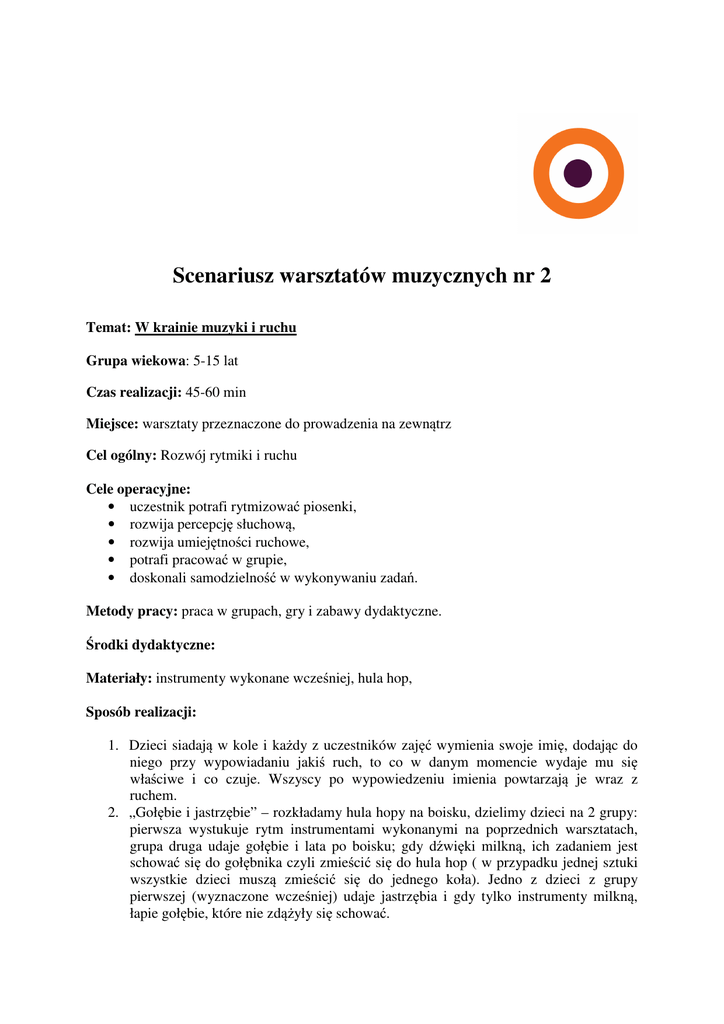 Scenariusz warsztatów muzycznych nr 2 Temat: W krainie muzyki i ruchu Grupa wiekowa: 5-15 lat Czas realizacji: 45-60 min Miejsce: warsztaty przeznaczone do prowadzenia na zewnątrz Cel ogólny: Rozwój rytmiki i ruchu Cele operacyjne: • uczestnik potrafi rytmizować piosenki, • rozwija percepcję słuchową, • rozwija umiejętności ruchowe, • potrafi pracować w grupie, • doskonali samodzielność w wykonywaniu zadań. Metody pracy: praca w grupach, gry i zabawy dydaktyczne. Środki dydaktyczne: Materiały: instrumenty wykonane wcześniej, hula hop, Sposób realizacji: 1. Dzieci siadają w kole i każdy z uczestników zajęć wymienia swoje imię, dodając do niego przy wypowiadaniu jakiś ruch, to co w danym momencie wydaje mu się właściwe i co czuje. Wszyscy po wypowiedzeniu imienia powtarzają je wraz z ruchem. 2. „Gołębie i jastrzębie” – rozkładamy hula hopy na boisku, dzielimy dzieci na 2 grupy: pierwsza wystukuje rytm instrumentami wykonanymi na poprzednich warsztatach, grupa druga udaje gołębie i lata po boisku; gdy dźwięki milkną, ich zadaniem jest schować się do gołębnika czyli zmieścić się do hula hop ( w przypadku jednej sztuki wszystkie dzieci muszą zmieścić się do jednego koła). Jedno z dzieci z grupy pierwszej (wyznaczone wcześniej) udaje jastrzębia i gdy tylko instrumenty milkną, łapie gołębie, które nie zdążyły się schować. 3. Gra „Dyrygent” - dzieci stoją w kole. Jedno dziecko na ochotnika oddala się od grupy w wyznaczone miejsce, w tym czasie pozostali wybierają pośród siebie dyrygenta, który będzie pokazywał, jak gra się na różnorodnych instrumentach. Pozostałe dzieci mają za zadanie naśladować dyrygenta, który co chwilę zmienia pokazywany instrument. Zadaniem dziecka zgadującego jest odgadnięcie, kto jest dyrygentem grupy. Jeśli dziecko nie odgadnie, wówczas ponownie zgaduje. 4. „Muzyczna pogoda” – naśladowanie zjawisk atmosferycznych poprzez dźwięki. Każde dziecko trzyma w ręku instrument wykonany na poprzednich zajęciach, na znak wyznaczonej osoby (najlepiej streetworkera) dzieci mają za zadanie naśladować dźwiękiem pogodę (burza - gwałtowne potrząsanie, uderzanie w odstępach czasowych; wiatr - delikatne przechylanie grzechotek; słońce – bez dźwięku; deszcz naturalne potrząsanie instrumentem). 5. Zakończenie i podsumowanie warsztatów. Scenariusz opracowany przez Fundację Nowe Centrum http://nowecentrum.org Materiał został przygotowany w ramach programu Akademia Orange prowadzonego przez Fundację Orange. Materiał jest dostępny na licencji Creative Commons Uznanie autorstwa 3.0 Polska (licencja dostępna pod adresem: creativecommons.org/licenses/by/3.0/pl)
