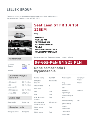 LELLEK GROUP Źródło: http://portal.lellek.pl/lel/komis/auto14316,Seat.pdf?grupa=2 Wygenerowano: Środa, 8 marca 2017, 06:31 Seat Leon ST FR 1.4 TSI 125KM Nowy ROK2016 MOC125 KM PRZEBIEG5 KM NADWOZIEKOMBI POJ.1.4 TYP SILNIKABENZYNA KOLORBIAŁY METALIK kupiony w polsce bezwypadkowy Handlowiec Tomasz Nowos +48 32 33 59 230 zapytaj mobile Charakterystyka spalania 97 652 PLN 84 925 PLN Dane samochodu i wyposażenie Numer oferty 027784 cykl miejski 6.8 l/100km Skrzynia biegów manualna cykl pozamiejski 4.5 l/100km Ilość miejsc 5 cykl mieszany 5.3 l/100km Poduszki 7 emisja CO2 124 g/km ABS Tak ESP Tak ASR (kontrola trakcji) Tak Klimatyzacja automatyczna Climatronic Elektryczne szyby Tak Elektryczne Tak Gwarancja Gwarancja dostępna Ubezpieczenie Ubezpieczenie dostępne nowy z salonu Pochodzenie kupiony w Polsce Kraj pochodzenia Polska VIN Pierwsza rejestracja 00-0000 serwisowany w aso bezwypadkowy garażowany książka serwisowa I właściciel kupiony w Tak lusterka Kredyt Kredyt dostępny Zeskanuj kod, aby zobaczyć ofertę online salonie Wspomaganie kierownicy Tak Komputer Tak Radioodtwarza cz Tak Immobilizer Tak Centralny zamek Tak Światła przeciwmgieln e Tak Czujnik deszczu Tak Kierownica wielofunkcyjna Tak Tempomat Tak Asystent pasa ruchu Tak Kamera cofania Tak Bluetooth Tak Światła LED Tak Alufelgi 17" Miejsce postoju Gliwice ul. Portowa 2 tunning homologacja stan idealny właściciel niepalący Opis dodatkowy Samochód fabrycznie NOWY Samochód dealera LELLEK GLIWICE, nr: 027784 Pojazd dostępny fizycznie w salonie Seat Auto Centrum Gliwice przy ul. Portowej 2 Pojazd posiada 4 letnią gwarancję fabryczną. SEAT LEON 1.4 TSI 125 KM FR (Formula Racing) Wybrane elementy standardowego wyposażenia: - 7 poduszek powietrznych - System automatycznego hamowania po kolizji - ASR + ABS + ESC i system kontroli ciśnienia powietrza w oponach - XDS i Asystent Podjazdu - 17-calowe felgi aluminiowe typu Dynamic 30/2 - Zawieszenie typu FR - Przyciemniane szyby cz. tylnej - Pełne światła LED2 + światła dzienne LED + światło tylne LED - Elektrycznie sterowane szyby boczne z przodu i z tyłu - Elektryczne, podgrzewane i składane lusterka boczne - Komputer pokładowy - Centralny zamek ze zdalnym sterowaniem, dwa składane kluczyki - Tempomat - 3,5-calowy monochromatyczny wyświetlacz komputera - Zestaw Media System Colour z 5-calowym, kolorowym ekranem dotykowym: MP3/WMA, Złącza:USB/karta SD/Bluetooth®/CD/AUX-in z 8 głośnikami - Automatyczna klimatyzacja dwustrefowa (Climatronic) - SEAT Drive Profile: 4 profile jazdy - Fotel kierowcy i pasażera z regulacją podparcia odcinka lędźwiowego i wysokości - Sportowe przednie fotele z obiciem z tkaniny i skóry - Składane i dzielone oparcie tylnej kanapy - Kierownica wielofunkcyjna i rączka hamulca ręcznego obszyte skórą Dodatkowo Pakiet Techno+ zawierający: - Media System Plus z dotykowym ekranem kolorowym 6,5 cala, MP3/WMA, Złącza:USB/karta SD/Bluetooth® (strumieniowe przesyłanie muzyki i prowadzenie rozmów telefonicznych)/CD/AUX-in z 8 głośnikami, funkcja rozpoznawania mowy i sterowania głosem; - Kamera cofania - Pakiet praktyczny: Czujnik deszczu, Czujnik zmierzchu (automatyczne światła), Automatyczna funkcja opóźnionego wyłączania świateł Coming and Leaving Home, Automatycznie ściemniające się lusterko wsteczne - Pakiet wspomagania jazdy: Asystent świateł drogowych oraz Asystent pasa ruchu. Dodatkowo Pakiet Comfort+:- Czujniki parkowania z przodu i z tyłuAktywny tempomat z Systemem kontroli odstępu- Pakiet zimowy: podgrzewane przednie fotele, spryskiwacze reflektorów z podgrzewaniem płynu w spryskiwaczach CENA KATALOGOWA: 97 652 PLN PLN KORZYŚĆ: 12 727 PLN PLN CENA PROMOCYJNA: 84 925 PLN DOSTĘPNE FORMY FINANSOWANIA ZAKUPU: KREDYT 3,99% LEASING 101,99% PRZYJMUJEMY W ROZLICZENIU AUTA UŻYWANE WSZYSTKICH MAREK W RAZIE PYTAŃ PROSIMY O KONTAKT Z DZIAŁEM HANDLOWYM 32 335 92 31 wew. 0233 * ZDJĘCIA POGLĄDOWE Nota prawna Informacja nie stanowi oferty w rozumieniu art. 66 Kodeksu Cywilnego. Podane dane mają charakter wyłącznie informacyjny. Pełna informacja dostępna jest u handlowca. Sprzedający nie odpowiada za ewentualne błędy lub nieaktualność ogłoszenia.