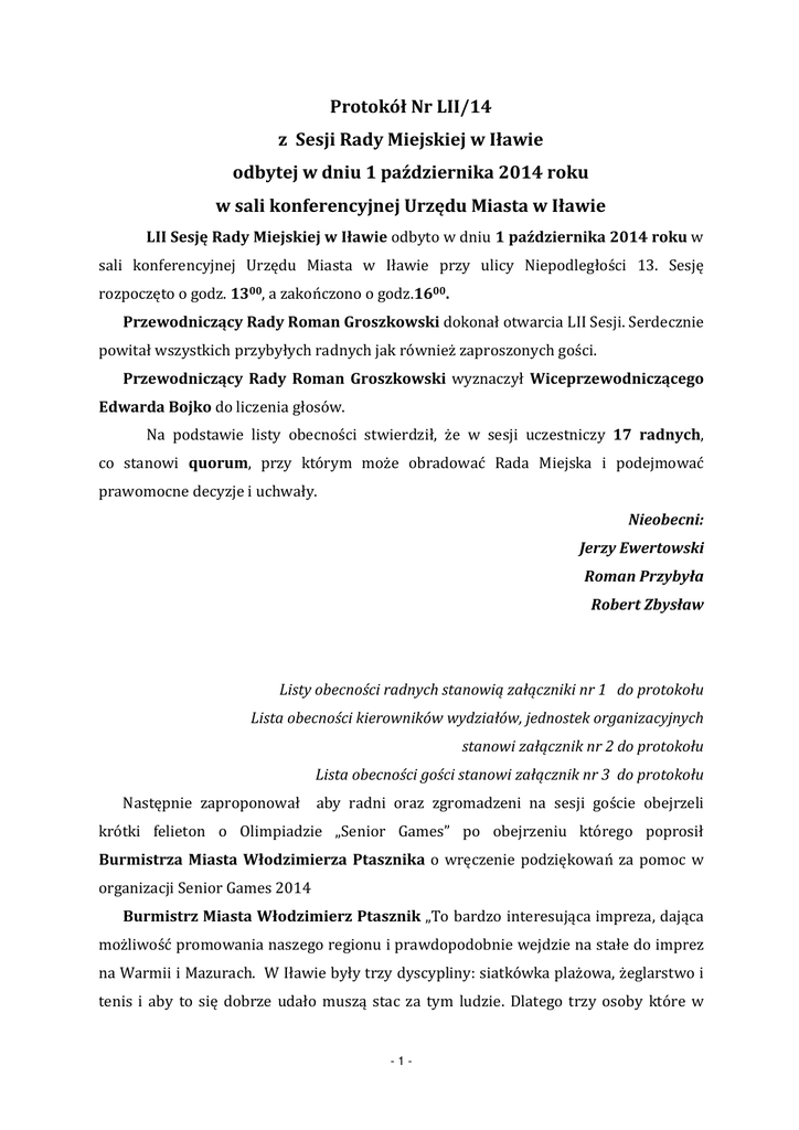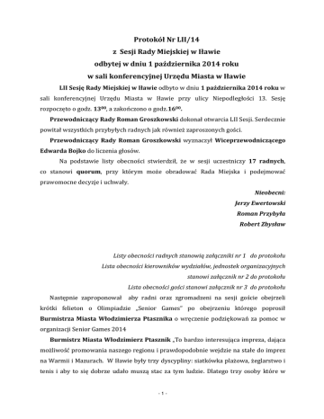 Protokół Nr LII/14 z Sesji Rady Miejskiej w Iławie odbytej w dniu 1