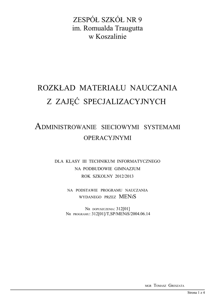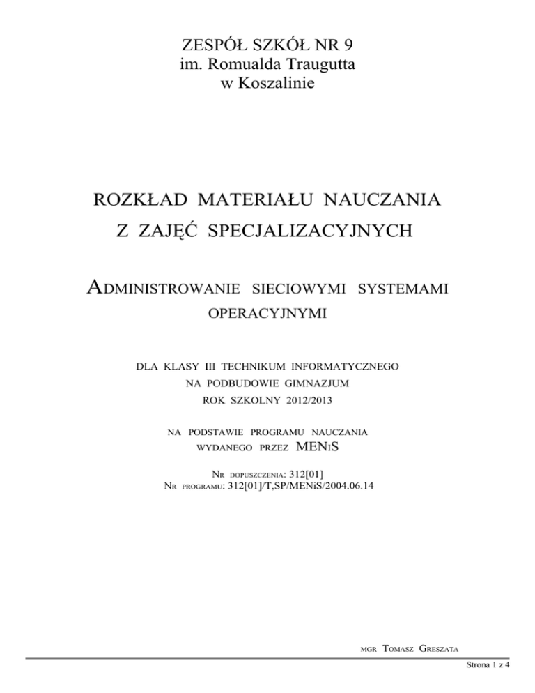 ZESPÓŁ SZKÓŁ NR 9 im. Romualda Traugutta w Koszalinie ROZKŁAD MATERIAŁU NAUCZANIA Z ZAJĘĆ SPECJALIZACYJNYCH ADMINISTROWANIE SIECIOWYMI SYSTEMAMI OPERACYJNYMI DLA KLASY III TECHNIKUM INFORMATYCZNEGO NA PODBUDOWIE GIMNAZJUM ROK SZKOLNY 2012/2013 NA PODSTAWIE PROGRAMU NAUCZANIA WYDANEGO PRZEZ NR NR PROGRAMU: MENIS DOPUSZCZENIA: 312[01] 312[01]/T,SP/MENiS/2004.06.14 MGR TOMASZ GRESZATA Strona 1 z 4 Dział Wprowadzenie Wprowadzenie do sieci Windows Administrowanie systemem Windows opartym na technologii NT Bezpieczeństwo sieci Windows Zarządzanie danymi i dostępem do zasobów w sieci Windows L.p. 1. 2. 3. 4. 5. 6. 7. 8. 9. 10. 11. 12. 13. 14. 15. 16. 17. 18. 19. 20. 21. 22. 23. 24. 25. 26. 27. 28. 29. 30. 31. 32. 33. 34. 35. 36. 37. 38. 39. 40. 41. 42. 43. 44. 45. 46. 47. 48. 49. 50. 51. Temat zajęć Regulamin pracowni komputerowej. Przepisy BHP. Przedmiotowy system oceniania. Rodziny systemów operacyjnych Windows opartych na technologii NT. Właściwości serwerów Windows. Usługi terminalowe, instalacja zdalna, instalacja nienadzorowana. Logowanie do Windows. Cechy grupy roboczej i domeny. Domena, drzewo domen, las domen. Uwierzytelnianie użytkowników i komputerów. Kontrolowany dostęp. Centralne zarządzanie. Jednostki organizacyjne. Lokalizowanie informacji. Skalowalność. Podsumowanie modułu. Sprawdzian wiadomości. Pomoc w Windows. Rutynowe zadania administracyjne. Narzędzia administracyjne. Harmonogram zadań. Dziennik zdarzeń. Menedżer zadań. Monitor systemu. Optymalizacja wydajności. Zasady zabezpieczeń. Podsumowanie modułu. Sprawdzian wiadomości. Konta użytkowników: lokalne, domenowe. Grupy użytkowników. Prawa użytkowników. Uprawnienia NTFS. Uprawnienia do drukarek i innych obiektów. Zasady tworzenia nowych kont użytkowników. Zarządzanie kontami lokalnymi i domenowymi. Profile użytkownika. Zasady zabezpieczeń GPO dla domeny i jednostki organizacyjnej. Szablony zabezpieczeń. Inspekcja dostępu do zasobów systemowych. Funkcjonowanie grup użytkowników w systemach Windows. Grupy użytkowników w środowisku grupy roboczej. Grupy lokalne i domenowe. Typy i zasięg grup domenowych. Wbudowane i predefiniowane domenowe grupy lokalne i globalne. Podsumowanie modułu. Sprawdzian wiadomości. Lista kontroli dostępu ACL. Uprawnienia NTFS do folderów. Uprawnienia NTFS do plików. Uprawnienia specjalne NTFS. Kompresja danych na partycjach NTFS. Przydziały dyskowe. Zabezpieczanie danych przy użyciu EFS (Encrypting File System). Uprawnienia do udostępnionych folderów. Kombinacja uprawnień NTFS z uprawnieniami do udostępnionych folderów. Udziały administratorskie. Publikowanie udostępnionych folderów w usłudze Active Directory. System DFS (Distributed File System). Podsumowanie modułu. Sprawdzian wiadomości. Uwagi 1 1 1 1 1 1 2 1 1 1 1 1 1 2 (14) 1 1 1 1 1 1 1 2 (9) 1 1 2 1 1 2 2 2 1 2 1 1 2 1 2 2 (29) 2 1 1 2 2 2 2 2 2 2 2 2 2 (24) Strona 2 z 4 Zarządzanie dyskami i wdrażanie odporności na uszkodzenia w systemie Windows Usługi w sieci Windows Instalacja i konfiguracja serwera Windows Instalacja i konfiguracja systemu Unix/Linux 52. 53. 54. 55. 56. 57. 58. 59. 60. 61. 62. 63. 64. 65. 66. 67. 68. 69. 70. 71. 72. 73. 74. 75. 76. 77. 78. 79. 80. 81. 82. 83. 84. 85. 86. 87. 88. 89. 90. 91. 92. 93. 94. 95. 96. 97. 98. 99. 100. 101. 102. 103. 104. Typy dysków w systemie Windows opartym na technologii NT. Partycje na dyskach podstawowych. Woluminy na dyskach dynamicznych. Podstawowe zadania związane z zarządzaniem dyskami. Zagadnienia ochrony przed awariami. Zasilacze UPS. Wdrażanie odporności na uszkodzenia przy pomocy systemów RAID. Archiwizacja i odtwarzanie danych. Typy kopii zapasowych. Narzędzia do odzyskiwania systemu. Podsumowanie modułu. Sprawdzian wiadomości. Usługa drukowania w systemie Windows. Uprawnienia do drukarek. Drukowanie w Internecie. Wprowadzenie do usług terminalowych. Licencje terminalowe. Planowanie instalacji usług terminalowych. Rodzaje usług internetowych. Przyłączanie do Internetu. Translacja adresów. Serwery proxy. Zapory (Firewalls). Serwery Web. Podsumowanie modułu. Sprawdzian wiadomości. Przygotowanie instalacji. Ręczna instalacja systemu Windows z płyty CDROM. Aktualizacja wersji systemu Windows. Ręczna instalacja sieciowa. Nienadzorowana instalacja z wykorzystaniem kreatora Setup Manager. Instalacja z wykorzystaniem powielania obrazu dysku. Zdalna instalacja z wykorzystaniem usługi RIS. Serwer plików. Serwer wydruku. Serwer aplikacji. Serwer sieci Web. Kontroler domeny. Serwer DNS. Serwer WINS. Serwer DHCP. Podsumowanie modułu. Sprawdzian wiadomości. Przypomnienie podstawowych informacji o systemie Unix/Linux. Operacje na plikach i katalogach. Nadzorowanie uprawnień plików. Praca w sieci. Podstawowe czynności administracyjne. Przygotowanie dysku twardego. Partycje i systemy plików. Interfejs programu instalacyjnego. Przebieg instalacji. Wybór sposobu startowania systemu. Konfiguracja karty sieciowej. Ustawienia protokołu TCP/IP. Moduły jądra. Konfiguracja i kompilacja jądra. 1 2 1 1 1 1 2 2 2 2 2 (17) 1 1 1 1 1 2 2 2 2 2 2 2 2 (21) 1 1 1 2 1 1 1 1 1 1 2 2 2 2 2 2 (23) 1 1 1 1 1 1 1 1 1 1 1 1 2 Strona 3 z 4 Usługi sieciowe systemu Unix/Linux Bezpieczeństwo danych w systemie Unix/Linux 105. 106. 107. 108. 109. 110. 111. 112. 113. 114. 115. 116. 117. 118. 119. 120. 121. 122. 123. 124. 125. 126. 127. 128. 129. 130. 131. 132. 133. 134. 135. 136. 137. 138. 139. Instalowanie łat. Sprawdzanie systemu plików (fsck, e2fsck). Instalacja, aktualizacja, deinstalacja pakietów. Weryfikacja zainstalowanych pakietów. Instalacja z kompilacją. Podsumowanie modułu. Sprawdzian wiadomości. Demony sieciowe. Telnet - zdalny dostęp do serwera. FTP (File Transfer Protocol). Finger - informacje o użytkownikach. SMTP – dostarczanie i odbieranie poczty. Usługa POP - poczta kurierska. Sshd. HTTP. Identd - identyfikacja użytkownika. Kontrola dostępu do usług inetd. DNS. Samba - współpraca 