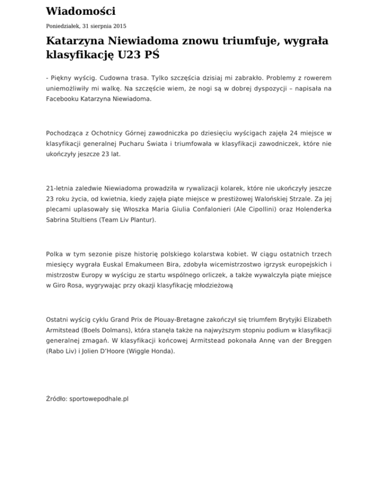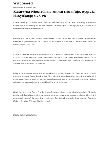 Wiadomości Poniedziałek, 31 sierpnia 2015 Katarzyna Niewiadoma znowu triumfuje, wygrała klasyfikację U23 PŚ - Piękny wyścig. Cudowna trasa. Tylko szczęścia dzisiaj mi zabrakło. Problemy z rowerem uniemożliwiły mi walkę. Na szczęście wiem, że nogi są w dobrej dyspozycji – napisała na Facebooku Katarzyna Niewiadoma. Pochodząca z Ochotnicy Górnej zawodniczka po dziesięciu wyścigach zajęła 24 miejsce w klasyfikacji generalnej Pucharu Świata i triumfowała w klasyfikacji zawodniczek, które nie ukończyły jeszcze 23 lat. 21-letnia zaledwie Niewiadoma prowadziła w rywalizacji kolarek, które nie ukończyły jeszcze 23 roku życia, od kwietnia, kiedy zajęła piąte miejsce w prestiżowej Walońskiej Strzale. Za jej plecami uplasowały się Włoszka Maria Giulia Confalonieri (Ale Cipollini) oraz Holenderka Sabrina Stultiens (Team Liv Plantur). Polka w tym sezonie pisze historię polskiego kolarstwa kobiet. W ciągu ostatnich trzech miesięcy wygrała Euskal Emakumeen Bira, zdobyła wicemistrzostwo igrzysk europejskich i mistrzostw Europy w wyścigu ze startu wspólnego orliczek, a także wywalczyła piąte miejsce w Giro Rosa, wygrywając przy okazji klasyfikację młodzieżową Ostatni wyścig cyklu Grand Prix de Plouay-Bretagne zakończył się triumfem Brytyjki Elizabeth Armitstead (Boels Dolmans), która stanęła także na najwyższym stopniu podium w klasyfikacji generalnej zmagań. W klasyfikacji końcowej Armitstead pokonała Annę van der Breggen (Rabo Liv) i Jolien D’Hoore (Wiggle Honda). Żródło: sportowepodhale.pl