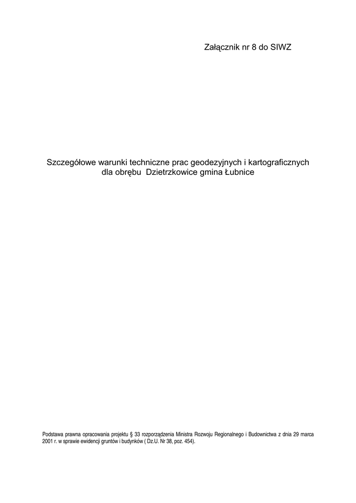 Załącznik nr 8 do SIWZ Szczegółowe warunki techniczne prac geodezyjnych i kartograficznych dla obrębu Dzietrzkowice gmina Łubnice Podstawa prawna opracowania projektu § 33 rozporządzenia Ministra Rozwoju Regionalnego i Budownictwa z dnia 29 marca 2001 r. w sprawie ewidencji gruntów i budynków ( Dz.U. Nr 38, poz. 454). I. Ogólne wymagania techniczne wykonania prac 1. 2. 3. 4. 5. 6. 7. 8. 9. 10. 11. 12. 13. 14. 15. Wykonawca przeprowadzi prace w sposób zgodny z przepisami rozporządzenia Ministra Rozwoju Regionalnego i Budownictwa z dnia 29 marca 2001 r. w sprawie ewidencji gruntów i budynków (Dz. U. Nr 38, poz. 454) zwanym dalej rozporządzeniem, innymi obowiązującymi przepisami, instrukcjami technicznymi i wytycznymi technicznymi, oraz postanowieniami niniejszych Warunków Technicznych. Podanie do publicznej wiadomości informacji o rozpoczęciu prac geodezyjnych związanych z modernizacją ewidencji gruntów i budynków. Przeprowadzenie niezbędnych modyfikacji istniejących danych ewidencyjnych do wymagań określonych w rozporządzeniu. Zebranie informacji do baz danych ewidencyjnych pozwalających na utworzenie podstawowych raportów, o których mowa w § 22 rozporządzenia tj. rejestr gruntów, rejestr budynków, rejestr lokali, kartoteka budynków, kartoteka lokali. Utworzenie operatu ewidencyjnego, który zgodnie z § 20 rozporządzenia składa się z części geodezyjno-prawnej i opisowo-kartograficznej. Kontrola techniczna operatu ewidencyjnego przez Ośrodek Dokumentacji Geodezyjnej i Kartograficznej w Wieruszowie. Wyłożenie operatu opisowo-kartograficznego do wglądu osób fizycznych, osób prawnych i jednostek organizacyjnych nieposiadających osobowości prawnej, rozpatrzenie uwag przy udziale pracownika Starostwa Powiatowego w Wieruszowie posiadającego uprawnienia, o których mowa a art. 43 pkt 2 ustawy Prawo geodezyjne i kartograficzne do danych ewidencyjnych przedstawionych w projekcie operatu opisowo - kartograficznego oraz poinformowanie zgłaszającego uwagi o sposobie rozpatrzenia uwag. Operat ewidencyjny, składający się z części geodezyjno - prawnej oraz opisowo - kartograficznej, Wykonawca jest zobowiązany skompletować zgodnie z obowiązującymi przepisami. Przyjęcie operatu do ewidencji gruntów i budynków i jego wdrożenie Obiekty przestrzenne wektorowej mapy ewidencyjnej przedstawione zostaną w układzie „2000" w odpowiednich pasach odwzorowania. Powiat wieruszowski przyporządkowany jest do strefy „6” i pasa odwzorowania nr „18”. Efektem końcowym wykonania umowy są pliki w formacie programu EWMAPA dla części kartograficznej oraz EWOPIS dla części opisowej, zawierające dane ewidencyjne o, których mowa w §22 rozporządzenia oraz pliki w formacie SWDE. Do opracowania zostaną wykorzystane wszystkie materiały geodezyjne i kartograficzne wydane Wykonawcy przez Ośrodek Dokumentacji Geodezyjnej i Kartograficznej w Wieruszowie. Wymagania dotyczące topologii obiektów obszarowych ewidencji gruntów i budynków zostaną sprawdzone przez programy komputerowe udostępnione przez GUGiK i stanowić będą podstawę weryfikacji rezultatów prac wykonanych przez Wykonawcę w ramach niniejszego zamówienia. Wykonawca zapewni ładowanie danych do systemu EWOPIS w celu uruchamiania obsługi bazy danych ewidencyjnych (§ 43 punkt 3 rozporządzenia). Opisane wyżej przenoszenie danych Wykonawca przeprowadzi niezwłocznie po ogłoszeniu projektu w dzienniku urzędowym województwa, w terminie niezależnym od terminu obowiązywania umowy na wykonanie przedmiotowych prac. Wszelkie wątpliwości wykonawca uzgadnia w PODGiK Wymagania dotyczące konturów użytków 1) Źródłem danych dotyczących konturów użytków gruntowych jest mapa ewidencyjna. W ramach zamówienia Wykonawca zweryfikuje kontury użytków gruntowych, polegającej na porównaniu przebiegu konturów użytków gruntowych wykazywanych na rastrze mapy ewidencyjnej z obrazem tych użytków przedstawionych w bazie numerycznej. Weryfikacja, o której mowa wyżej powinna dotyczyć w szczególności terenów zabudowanych. Do obowiązków Wykonawcy nie należy ustalenie klas gleboznawczych zmienionych użytków gruntowych. 2) Kontury klasyfikacyjne pozyskiwane są z mapy ewidencyjnej, a jeżeli brak jest danych o konturach klasyfikacyjnych na mapie ewidencyjnej należy przyjąć przebieg konturów z mapy klasyfikacyjnej. Przebieg konturów klasyfikacyjnych należy synchronizować z przebiegiem granic działek i konturami użytków gruntowych wykorzystując do tego analogowe mapy ewidencyjne i mapy klasyfikacyjne. 3) Wykonawca dokona badania wszystkich ksiąg wieczystych dotyczących zarówno nieruchomości gruntowych jak i nieruchomości budynkowych i lokalowych. Na tej podstawie dokona weryfikacji rejestru gruntów w zakresie prawidłowości prowadzenia jednostek rejestrowych jak i grup rejestrowych przyjmując zasady określone w §13 i 17 rozporządzenia oraz uzupełni dane ewidencyjne o informacje dotyczące rejestru zabytków i rejonów statystycznych. 4) Wykonawca zapewni zgodność wprowadzanych danych z danymi baz istniejących tj. kartoteki osobowe i PESEL, REGON (i ewentualnie dodatkowo NIP) oraz ADRES, odpowiednio dokumentując w formie raportu sprawdzenie tej zgodności. W przypadku zaistnienia rozbieżności niemożliwych do usunięcia przez Wykonawcę, jest on zobowiązany jedynie do pisemnego odnotowania przyczyny rozbieżności. 5) Dla zapewnienia zgodności danych EWOPIS-u z danymi kartotek osobowych i PESEL-a, o czym mowa w punkcie 7, Wykonawca jest zobowiązany uzupełnić braki i skorygować błędne wpisy w systemie EWOPIS. Powyższe korekty i uzupełnienia Wykonawca może ograniczyć do osób zameldowanych na terenie gminy Łubnice . 6) Dla zapewnienia zgodności danych EWOPIS-u z danymi REGON, o czym mowa w punkcie 7, Wykonawca jest zobowiązany uzupełnić braki i skorygować błędne wpisy w systemie EWOPIS. 7) Po dokonanej weryfikacji Wykonawca sporz