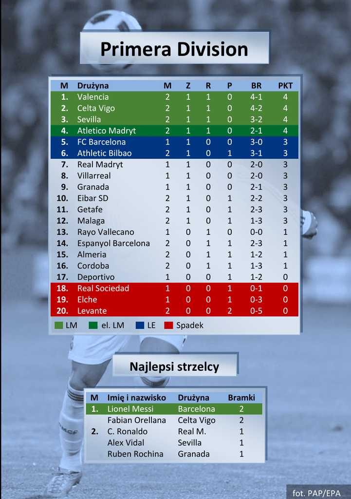 Primera Division M 1. 2. 3. 4. 5. 6. 7. 8. 9. 10. 11. 12. 13. 14. 15. 16. 17. 18. 19. 20. Drużyna Valencia Celta Vigo Sevilla Atletico Madryt FC Barcelona Athletic Bilbao Real Madryt Villarreal Granada Eibar SD Getafe Malaga Rayo Vallecano Espanyol Barcelona Almeria Cordoba Deportivo Real Sociedad Elche Levante LM el. LM M 2 2 2 2 1 2 1 1 1 2 2 2 1 2 2 2 1 1 1 2 LE Z 1 1 1 1 1 1 1 1 1 1 1 1 0 0 0 0 0 0 0 0 R 1 1 1 1 0 0 0 0 0 0 0 0 1 1 1 1 0 0 0 0 P 0 0 0 0 0 1 0 0 0 1 1 1 0 1 1 1 1 1 1 2 BR 4-1 4-2 3-2 2-1 3-0 3-1 2-0 2-0 2-1 2-2 2-3 1-3 0-0 2-3 1-2 1-3 1-2 0-1 0-3 0-5 PKT 4 4 4 4 3 3 3 3 3 3 3 3 1 1 1 1 0 0 0 0 Spadek Najlepsi strzelcy M Imię i nazwisko 1. Lionel Messi Fabian Orellana 2. C. Ronaldo Alex Vidal Ruben Rochina Drużyna Barcelona Celta Vigo Real M. Sevilla Granada Bramki 2 2 1 1 1 fot. PAP/EPA