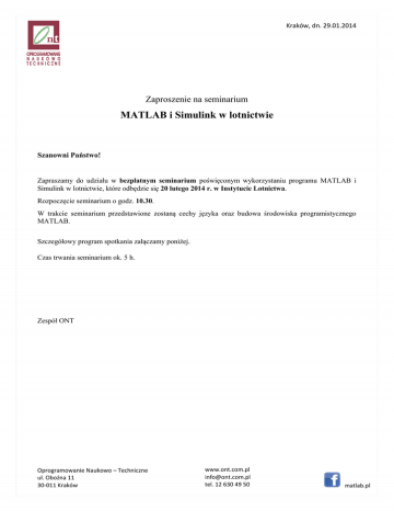 Kraków, dn. 29.01.2014 Zaproszenie na seminarium MATLAB i Simulink w lotnictwie Szanowni Państwo! Zapraszamy do udziału w bezpłatnym seminarium poświęconym wykorzystaniu programu MATLAB i Simulink w lotnictwie, które odbędzie się 20 lutego 2014 r. w Instytucie Lotnictwa. Rozpoczęcie seminarium o godz. 10.30. W trakcie seminarium przedstawione zostaną cechy języka oraz budowa środowiska programistycznego MATLAB. Szczegółowy program spotkania załączamy poniżej. Czas trwania seminarium ok. 5 h. Zespół ONT Oprogramowanie Naukowo – Techniczne ul. Oboźna 11 30-011 Kraków www.ont.com.pl [email protected] tel. 12 630 49 50 matlab.pl Kraków, dn. 29.01.2014 Szczegółowy program seminarium 10:30 Rozpoczęcie 10:30 – 11:05 Wprowadzenie do Matlaba Matlab jako jezyk programowania Prezentacja Toolboxów Prezentacja dema związanego z przetwarzaniem obrazu 11:05 – 11:35 Wprowadzenie do Simulinka Modelowanie systemów dynamicznych Prezentacja idei Model-Based Design 11:35 – 11:45 Przerwa 11:45 – 12:30 Modelowanie fizyczne Simscape language Omówienie toolboxów wchodzących w skład Simscape Prezentacja przykładu wykorzystania modelowania fizycznego 12:30 – 13:15 Przerwa 13:15 – 14:00 Przetwarzanie sygnałów Analiza sygnałów pomiarowych (analiza widma,fft, itp.) Projektowanie filtrów cyfrowych Prezentacja dema Simulinkowego dot. przetwarzania sygnałów 14:00 – 15:05 Automatyczna generacja kodu 15:05 – 15:30 Po co generujemy kod? Prezentacja dema z generacją kodu i uruchomieniem na zewnętrznej platformie (Raspberry Pi) Przykład generacji kodu dla modelu estymatora z uwzględnieniem procesu testowania Certyfikacja w lotnictwie Prezentacja o wsparciu dla certyfikacji w zakresie norm DO-178C, DO-254, Common Criteria 15:30 Zakończenie Oprogramowanie Naukowo – Techniczne ul. Oboźna 11 30-011 Kraków www.ont.com.pl [email protected] tel. 12 630 49 50 matlab.pl