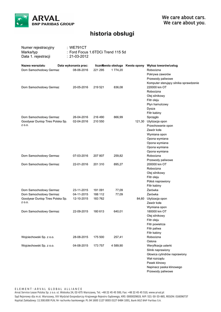 We care about cars. We care about you. historia obsługi Numer rejestracyjny Marka/typ Data 1. rejestracji : WE791CT : Ford Focus 1.6TDCi Trend 115 5d : 21-03-2012 Nazwa warsztatu Data wykonania prac: Dom Samochodowy Germaz 08-06-2016 Dom Samochodowy Germaz 20-05-2016 Dom Samochodowy Germaz Goodyear Dunlop Tires Polska Sp. z o.o. 26-04-2016 02-04-2016 Dom Samochodowy Germaz 07-03-2016 Dom Samochodowy Germaz 22-01-2016 Dom Samochodowy Germaz Dom Samochodowy Germaz Goodyear Dunlop Tires Polska Sp. z o.o. 23-11-2015 04-11-2015 12-10-2015 Dom Samochodowy Germaz 22-09-2015 Wojciechowski Sp. z o.o. 28-08-2015 Wojciechowski Sp. z o.o. 04-08-2015 ELEMENT-ARVAL GLOBAL ALLIANCE licznik Kwota obsługa Kwota opony Wykaz towarów/usług 221 295 1 774,20 Robocizna Pokrywa zaworów Przewody paliwowe Komputer sterujący silnika sprawdzenie 219 521 836,08 220000 km OT Robocizna Olej silnikowy Filtr oleju Płyn hamulcowy Dysza Filtr kabiny 216 490 866,99 Sprzęgło 210 550 121,30 Utylizacja opon Przechowanie opon Zawór koła Wymiana opon Opona wymiana Opona wymiana Opona wymiana Opona wymiana 207 807 259,82 Robocizna Przewody paliwowe 201 310 895,27 200000 km OT Robocizna Olej silnikowy Filtr oleju Półoś naprawiony Filtr kabiny 191 091 77,09 Żarówka 188 112 77,09 Żarówka 183 762 84,60 Utylizacja opon Zawór koła Wymiana opon 180 613 640,01 180000 km OT Olej silnikowy Filtr oleju Filtr powietrza Filtr paliwa Filtr kabiny 175 500 257,41 Robocizna Osłona 173 757 4 589,90 Weryfikacja usterki Silnik naprawiony Głowica cylindrów naprawiony Wał rozrządu Pasek klinowy Napinacz paska klinowego Przewody paliwowe Arval Service Lease Polska Sp. z o.o. ul. Wołoska 24, 02-675 Warszawa, Tel. +48 22 45 45 500, Fax: +48 22 45 45 510, www.arval.pl Sąd Rejonowy dla m.st. Warszawy, XIII Wydział Gospodarczy Krajowego Rejestru Sądowego, KRS: 0000029819, NIP: 521-30-33-865, REGON: 016096737 Kapitał Zakładowy: 11.500.000 PLN; Nr rachunku bankowego: PL 04 1600 1127 0003 0127 6484 1001, Bank BGŻ BNP Paribas S.A. Nazwa warsztatu Data wykonania prac: Dom Samochodowy Germaz 22-07-2015 Dom Samochodowy Germaz 07-05-2015 Goodyear Dunlop Tires Polska Sp. z o.o. Goodyear Dunlop Tires Polska Sp. z o.o. P.U.H. MASA Sp. z o.o. Dom Samochodowy Germaz 21-04-2015 licznik Kwota obsługa Kwota opony Wykaz towarów/usług 173 757 666,90 Weryfikacja usterki Pasek rozrządu sprawdzenie 159 500 833,32 160000 km OT Robocizna Olej silnikowy Filtr oleju Klocki hamulcowe tył Filtr kabiny 155 988 57,50 Naprawa opony 21-04-2015 153 989 19-03-2015 30-12-2014 149 500 139 833 Goodyear Dunlop Tires Polska Sp. z o.o. 09-12-2014 134 600 Goodyear Dunlop Tires Polska Sp. z o.o. 25-11-2014 134 600 Dom Samochodowy Germaz Dom Samochodowy Germaz 20-11-2014 03-09-2014 132 542 120 423 77,09 1 590,90 Dom Samochodowy Germaz 07-08-2014 115 309 539,69 Dom Samochodowy Germaz 16-05-2014 99 343 387,75 Goodyear Dunlop Tires Polska Sp. z o.o. 03-04-2014 93 533 Dom Samochodowy Germaz 08-01-2014 79 812 158,00 Montaż (lato) + przechowanie 80,67 1 340,30 589,28 Badanie Techniczne 140000 km OT Robocizna Olej silnikowy Filtr oleju Tarcze hamulcowe przód Klocki hamulcowe przód 0,01 Felga naprawiony Felga naprawiony Felga naprawiony 1 200,80 Montaż (zima) + przechowanie Opona Opona Opona Opona Żarówka 120000 km OT Robocizna Olej silnikowy Filtr oleju Tarcze hamulcowe tył Klocki hamulcowe tył Filtr powietrza Filtr paliwa Filtr kabiny Klocki hamulcowe przód Wiązka elektryczna naprawiony Żarówka Światła sprawdzenie 100000 km OT Robocizna Materiały drobne Olej silnikowy Filtr oleju 893,96 Montaż (lato) + przechowanie Utylizacja opon Opona Opona Opona Opona 80000 km OT Pióra wycieraczek szyby przód Filtr kabiny Nazwa warsztatu Data wykonania prac: Goodyear Dunlop Tires Polska 10-12-2013 Dom Samochodowy Germaz Continental Opony Polska SP. Z O.O. Dom Samochodowy Germaz 06-12-2013 21-11-2013 licznik Kwota obsługa Kwota opony Wykaz towarów/usług 55 168 124,60 Utylizacja opon Wymiana opon 74 353 77,09 Żarówka 71 300 50,00 Relokacja opon 14-11-2013 69 723 631,80 Dom Samochodowy Germaz 03-09-2013 59 178 759,62 Continental Opony Polska Sp. z o.o. Bemo Motors Sp. z o.o. Dom Samochodowy Germaz Goodyear Dunlop Tires Polska Wocar Bis Maciej Słojewski 05-07-2013 26 800 03-07-2013 07-06-2013 24-04-2013 23-04-2013 40 980 44 224 33 114 39 886 94,90 67,50 0,01 989,00 Autologic Sp. z o.o. Goodyear Dunlop Tires Polska Goodyear Dunlop Tires Polska Sp. z o.o. 23-04-2013 02-04-2013 14-11-2012 32 606 21 000 19 415 578,50 Euro-Car Sp. z o.o. 14-11-2012 20 207 417,65 Klocki hamulcowe przód Klocki hamulcowe tył 60000 km OT Pompa wspomagania układu kierowniczego Filtr powietrza Filtr paliwa Filtr kabiny 142,00 Montaż (lato) + przechowanie Żarówka Klocki hamulcowe tył czyszczenie Relokacja opon 40000 km OT Olej silnikowy Klocki hamulcowe przód Klocki hamulcowe tył Filtr powietrza Door to door 40,00 Relokacja opon wykonany 1 268,20 Montaż (zima) + przechowanie Zawór koła 1 Opona zimowa Przegląd Robocizna Olej silnikowy Filtr oleju Płyn chłodzący Przegląd powłoki lakierniczej