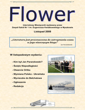 aa Internetowy Miesięcznik wydawany przez Zespół Szkół Nr 1 im. Eugeniusza Kwiatkowskiego w Myszkowie Listopad 2008 „Literatura jest przeznaczona do zatrzymania czasu w jego niszczącym biegu” Jan Parandowski W listopadowym wydaniu: - Kim był Jan Parandowski? - Święto Niepodległości - Otwarcie Orlika - Wymiana Polsko - Ukraińska - Wycieczka do Bełchatowa - Ogłoszenie - Redakcja Kim był Jan Parandowski? Jan Parandowski – urodził się 11 maja 1895 roku we Lwowie, a zmarł 26 września 1978 roku w Warszawie – polski pisarz, eseista i tłumacz. Ukończył IV Gimnazjum Klasyczne im. Jana Długosza w rodzinnym Lwowie. W 1923 r. uzyskał magisterium z filologii klasycznej i archeologii. Był kierownikiem literackim w wydawnictwie Alfreda Altenberga. Zorganizował tam serię przekładów z literatur klasycznych oraz serię Wielcy pisarze. W latach 1924 - 1926 podróżował do Grecji, Francji i Włoch. W 1937 roku otrzymał Złoty Wawrzyn Polskiej Akademii Literatury za wybitną twórczość literacką. Po wybuchu II wojny światowej uczestniczył w konspiracyjnym życiu kulturalnym. W latach 1945 - 1950 objął katedrę kultury antycznej, a następnie literatury porównawczej na Katolickim Uniwersytecie Lubelskim (KUL). W 1948 roku przygotowywał Światowy Kongres Intelektualistów we Wrocławiu, wtedy też ponownie zamieszkał w Warszawie. Był członkiem Stowarzyszenia Kultury Europejskiej. Jan Parandowski został uhonorowany w 1975 roku za całokształt twórczości przez Radio Wolna Europa. W 1976 roku otrzymał tytuł doktora honoris causa Wydziału Filozofii Chrześcijańskiej KUL. Parandowski znany jest przede wszystkim ze swojej twórczości związanej z kulturą antyczną. Jako literat debiutował już w roku 1913 szkicem literacko - filozoficznym Rousseau. Był wybornym znawcą i popularyzatorem kultury i literatury starożytnej. Wielką popularność przyniosła mu wielokrotnie wznawiana Mitologia (1924). Pozycja ta była wielce znacząca w popularyzacji podstaw kultury antycznej w Polsce ze względu na różne ważne cechy: piękno i prostotę stylistyczną oraz na wierne, lecz pozbawione kontrowersji obyczajowych opisanie najważniejszych mitów greckich. Takie ujęcie Mitologii pozwoliło na korzystanie z niej w edukacji szkolne. Niektóre, inne dzieła Jana Parandowskiego: - Dysk olimpijski (1933) - Zegar słoneczny (1953) - Wojna trojańska (1927) - Mój Rzym (1959) - Powrót do życia (1961) - Akacja (1967) 90. Rocznica Odzyskania Niepodległości W przeddzień rozpoczęcia długiego, listopadowego weekendu, w Zespole Szkół Nr 1 odbyła się symboliczna akademia upamiętniająca odzyskanie niepodległości po 123 latach nieobecności Polski na mapie Europy. Uczniowie klas technikum pod kierunkiem prof. Małgorzaty Piskorskiej – Hepner oraz prof. Krystyny Słabosz przygotowali przedstawienie, w którym wspominali wydarzenia z historii naszej Ojczyzny. Cała akademia upiększona została ślicznymi pieśniami patriotycznymi, w których szeregu znalazły się m.in. Rota, Biały krzyż, Rozkwitały pąki białych róż. Orlik 2012 wybudowany! 14 listopada bieżącego roku zostało oficjalnie otwarte świeżo wybudowane boisko na terenie Zespołu Szkół Nr 1. Czekaliśmy na tę chwilę dwa miesiące i doczekaliśmy się wreszcie. Dzień otwarcia Orlika rozpoczęto od turnieju piłki nożnej szkół średnich naszego powiatu, w którym trzecie miejsce zajął Zespół Szkół Nr 2 z Myszkowa oraz Zespół Szkół Nr 1. Na drugim miejscu znalazł się Zespół Szkół z Żarek, natomiast puchar Marszałka Województwa Śląskiego Pana Mariusza Kleszczewskiego trafił do drużyny Liceum Ogólnokształcącego z Myszkowa. Następnie rozegrano zawody w siatkówce szkół gimnazjalnych o puchar Starosty Myszkowskiego Pana Mariana Wróbla. Pierwsze miejsce zdobyło Gimnazjum Nr 5 z Myszkowa, drugą pozycję zajęło gimnazjum z Koziegłów, a trzecią Gimnazjum Nr 4 z Myszkowa. Uroczystość otwarcia kompleksu sportowego Moje Boisko – Orlik 2012 zaczęła się punktualnie o 13:30. To szczególny dzień w powiecie myszkowskim – tymi słowami starosta rozpoczął swoje przemówienie, w którym wyraził dumę i podziękowania z racji wybudowania boiska w stosunkowo krótkim czasie. Następnie przywitano zaproszonych gości: Minister Rozwoju Regionalnego Panią Elżbietę Bieńkowską, Wiceministra Sportu Pana Tomasza Półgrabskiego, Senatora RP Pana Andrzeja Szewińskiego, Wojewodę Śląskiego Pana Zygmunta Łukaszczyka, Wicemarszałka Województwa Śląskiego Pana Mariusza Kleszczewskiego, Pana Grzegorza Sztolcmana, księdza Stefana Jachimczaka, Przewodniczącego Rady Powiatu w Myszkowie Pana Janusza Jakubca, Wicestarostę Pana Jana Kierasa oraz przedstawicieli administracji gmin powiatu myszkowskiego. Pan Marian Wróbel kończąc swoje przemówienie wezwał wszystkich zaproszonych do symbolicznego przecięcia biało-czerwonej wstęgi. Na znak Pani Elżbiety Bieńkowskiej oficjalnie otwarto kompleks sportowo-rekreacyjny. Później proboszcz parafii, na której terenie znajduje się boisko, ksiądz kanonik Jarosław Koczur poświęcił obiekt używając słów – Bóg błogosławi czas wolny, jaki przeznaczamy na duchową rozrywkę i ćwiczenia naszego ciała. Po błogosławieństwie księdza proboszcza Starosta Myszkowski wraz z Radą Powiatu przekazali akt przekazania w użytkowanie kompleksu sportowego Moje Boisko – Orlik 2012 na ręce Dyrektora Zespołu Szkół Nr 1 w Myszkowie Pana Eugeniusza Bugaja, który serdecznie podziękował w imieniu młodzieży za obiekt, na którym uczniowie będą mogli rozwijać się fizycznie. Po zakończeniu oficjalnej części uroczystości rozpoczęła się część artystyczna, w której mogliśmy usłyszeć piosenki związane ze sportem, śmieszne relacje reporterów sportowych oraz wiersze o tematyce sportowej. Uczniowie ZS Nr 1 za granicą Unii Europejskiej W dniach 3 – 09.11.2008r. uczniowie Zespołu Szkół Nr 1 