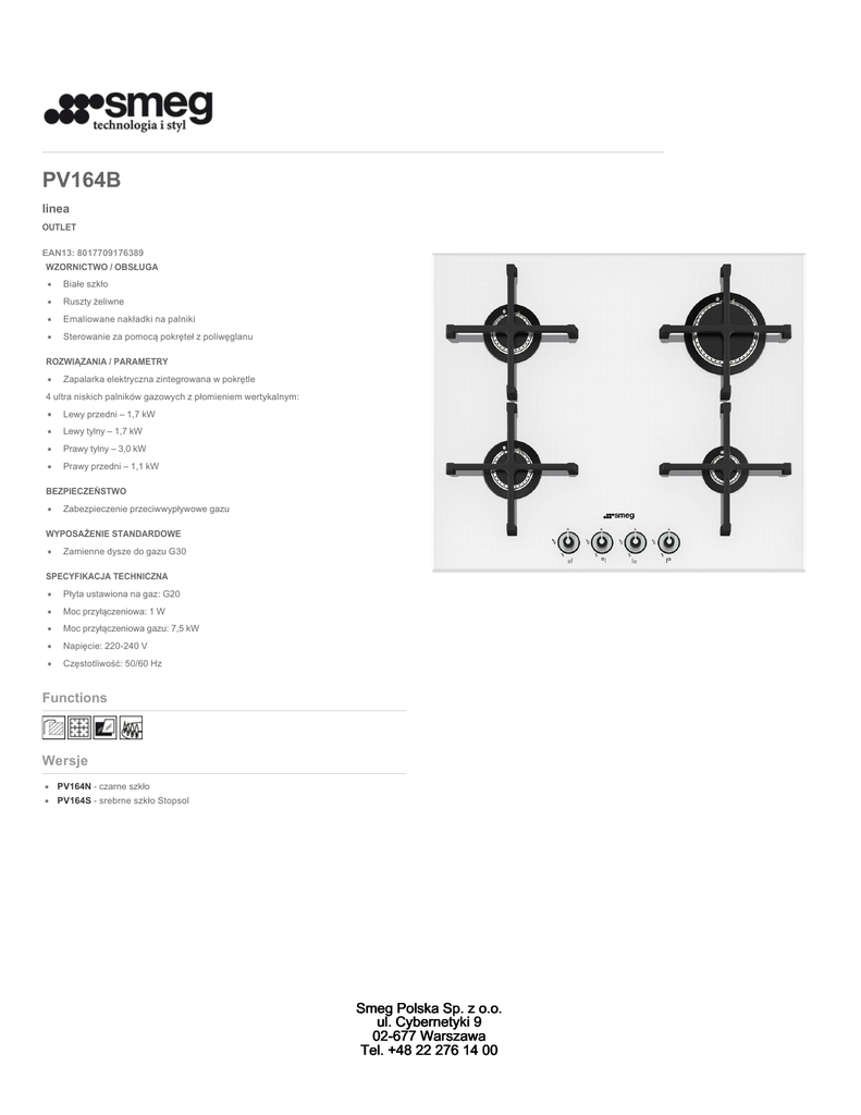 PV164B linea OUTLET EAN13: 8017709176389 WZORNICTWO / OBSŁUGA Białe szkło Ruszty żeliwne Emaliowane nakładki na palniki Sterowanie za pomocą pokręteł z poliwęglanu ROZWIĄZANIA / PARAMETRY Zapalarka elektryczna zintegrowana w pokrętle 4 ultra niskich palników gazowych z płomieniem wertykalnym: Lewy przedni – 1,7 kW Lewy tylny – 1,7 kW Prawy tylny – 3,0 kW Prawy przedni – 1,1 kW BEZPIECZEŃSTWO Zabezpieczenie przeciwwypływowe gazu WYPOSAŻENIE STANDARDOWE Zamienne dysze do gazu G30 SPECYFIKACJA TECHNICZNA Płyta ustawiona na gaz: G20 Moc przyłączeniowa: 1 W Moc przyłączeniowa gazu: 7,5 kW Napięcie: 220-240 V Częstotliwość: 50/60 Hz Functions Wersje PV164N - czarne szkło PV164S - srebrne szkło Stopsol Smeg Polska Sp. z o.o. ul. Cybernetyki 9 02-677 Warszawa Tel. +48 22 276 14 00 PV164B linea 60 cm białe szkło szlifowana krawędź gazowe INSTALACJA STANDARDOWA: Tradycyjna instalacja nad blatem. RUSZT KOMPLETNY: Szeroka struktura, która pokrywa całą płytę gazową, dzięki czemu łatwo przesuwać po niej naczynia. GAZ NA SZKLE: Płyty typu gaz na szkle są łatwe w utrzymaniu w czystości i bardzo bezpieczne, gdyż pod szkłem znajduje się cienka warstwa stali nierdzewnej, która jest w stanie utrzymać strukturę nawet w przypadku uderzenia. PALNIK O ZWIĘKSZONEJ MOCY: Palniki o zwiększonej mocy dają płomień wertykalny, co zapobiega utratom ciepła i szybko działa na dno naczynia. Smeg Polska Sp. z o.o. ul. Cybernetyki 9 02-677 Warszawa Tel. +48 22 276 14 00 PV164B linea 60 cm białe szkło szlifowana krawędź gazowe Smeg Polska Sp. z o.o. ul. Cybernetyki 9 02-677 Warszawa Tel. +48 22 276 14 00