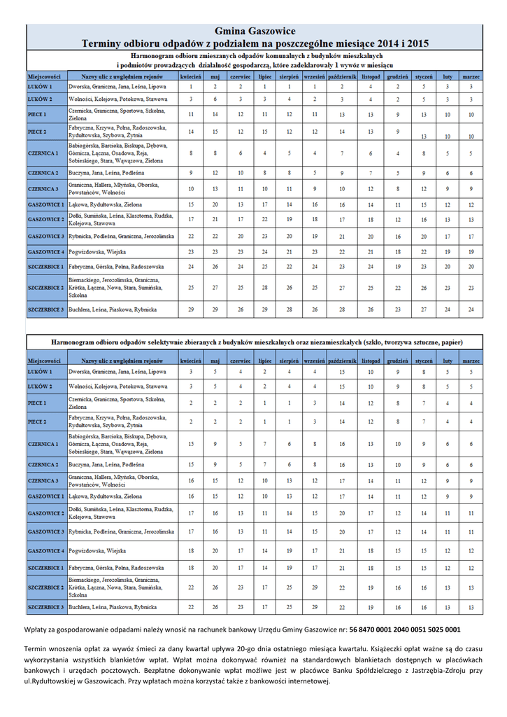 Wpłaty za gospodarowanie odpadami należy wnosić na rachunek bankowy Urzędu Gminy Gaszowice nr: 56 8470 0001 2040 0051 5025 0001 Termin wnoszenia opłat za wywóz śmieci za dany kwartał upływa 20-go dnia ostatniego miesiąca kwartału. Książeczki opłat ważne są do czasu wykorzystania wszystkich blankietów wpłat. Wpłat można dokonywać również na standardowych blankietach dostępnych w placówkach bankowych i urzędach pocztowych. Bezpłatne dokonywanie wpłat możliwe jest w placówce Banku Spółdzielczego z Jastrzębia-Zdroju przy ul.Rydułtowskiej w Gaszowicach. Przy wpłatach można korzystać także z bankowości internetowej. Odpady wielkogabarytowe: - meble ( w tym drewniane, tapicerowane) dywany, wykładziny, wózki dziecięce, rowery, zabawki dużych rozmiarów, itp. Odpady wielkogabarytowe wymagają czynności demontażowych, które pozwolą na wydzielenie z nich części przydatnych do recyklingu oraz usunięcie elementów niebezpiecznych. Podczas demontażu następuje również zmniejszenie objętości odpadów przed ich składowaniem na składowisku odpadów. Do odpadów wielkogabarytowych nie należą: wszelkiego rodzaju części budowlane i sanitarne takie jak deski drewniane, belki, panele, ramy okienne, drzwi, płoty, wanny, umywalki, muszle toaletowe lub spłuczki, grzejniki, płytki, rolety, jak również części samochodowe, motorowery, kosiarki spalinowe, odpady remontowe, odpady ogrodowe, worki na śmieci lub kartony z odpadami domowymi. Odpady budowlane, rozbiórkowe: - deski drewniane, belki, panele, ramy okienne, drzwi, płoty, wanny, umywalki, muszle toaletowe lub spłuczki, grzejniki, płytki, rolety, gruz ceglany, tynkarski, betonowy, drewno z rozbiórki, płyty kartonowo-gipsowe, szkło okienne, drzwiowe, stolarka okienna i drzwiowa, , odpady instalacyjne oraz wszystkie inne frakcje odpadowe powstałe w trakcie prac remontowych, budowlanych czy rozbiórkowych. Do w/w odpadów nie zaliczamy odpadów niebezpiecznych lub odpadów zawierających substancje niebezpieczne.