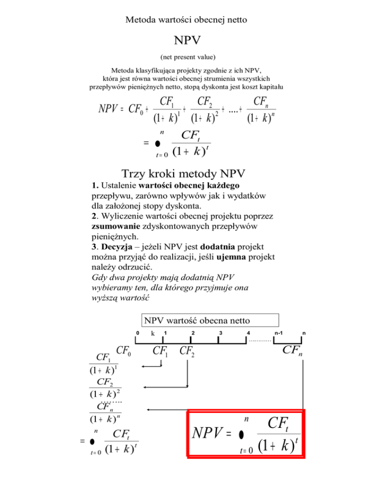 Metoda wartości obecnej netto NPV (net present value) Metoda klasyfikująca projekty zgodnie z ich NPV, która jest równa wartości obecnej strumienia wszystkich przepływów pieniężnych netto, stopą dyskonta jest koszt kapitału CF1 CF2 CFn + + .... + (1 + k )1 (1 + k ) 2 (1 + k ) n n CFt = ∑ t ( 1 + k ) t= 0 NPV = CF0 + Trzy kroki metody NPV 1. Ustalenie wartości obecnej każdego przepływu, zarówno wpływów jak i wydatków dla założonej stopy dyskonta. 2. Wyliczenie wartości obecnej projektu poprzez zsumowanie zdyskontowanych przepływów pieniężnych. 3. Decyzja – jeżeli NPV jest dodatnia projekt można przyjąć do realizacji, jeśli ujemna projekt należy odrzucić. Gdy dwa projekty mają dodatnią NPV wybieramy ten, dla którego przyjmuje ona wyższą wartość NPV wartość obecna netto 0 CF0 CF1 (1 + k )1 CF2 (1 + k ) 2 …….. CFn (1 + k ) n = n ∑ t= 0 CFt (1 + k ) t k 1 2 3 4 n-1 ………… n CFn CF1 CF2 n CFt NPV = ∑ t t = 0 (1 + k ) Przykł Przykład 1 Przykł Przykład 4 Rozważamy zakup papieru wartościowego z terminem wykupu za 3 lata (kwota wypłaty = 10 000 zł). Czy cena w chwili obecnej na poziomie 7 000 zł jest do zaakceptowania, jeżeli dyskonto przyjmujemy na poziomie 10% Rozważmy projekt inwestycyjny, którego nakład wynosi 20 mln zł, a spodziewane przepływy pieniężne są następujące [w mln zł]: t 0 1 2 3 4 CF -20 13 6 6 2 a)Zbadaj, czy przy dyskoncie 10% projekt można zaakceptować b) Zbadaj projekt stosując następujące poziomy dyskonta , (k= 0 ; 0,05; 0,10; 0,15; 0,18; 020)- korzystaj z tablic (1+k)^n c) Narysuj krzywą NPV Przykł Przykład 2 Przykł Przykład 5 Pan X rozważa zakup mieszkania, które następnie ma zamiar sprzedać „z zyskiem”. Pan X płaci za mieszkanie 100 000 zł a kupujący od Pana X zapłaci za nie w 5-ciu równych ratach po 25 000 zł, płatnych na koniec kolejnych 5-ciu lat. Czy przy stopie dyskonta 10% operacja jest opłacalna? Na podstawie projekcji cash flow porównaj dwa projekty inwestycyjne A i B Przykł Przykład 2 cd A inwestycja PAT amortyzacja zmiana ko CF 0 -30,0 B inwestycja PAT amortyzacja zmiana ko CF 0 -35,0 1 2 3 4 5 6 7,0 2,0 0,5 8,0 2,0 0,5 8,0 1,5 0,0 8,0 1,5 0,0 8,0 1,5 0,0 8,0 1,5 0,0 1 2 3 4 5 6 8,0 2,0 0,5 9,0 2,0 0,5 9,0 2,0 0,0 9,0 2,0 0,0 9,0 1,5 0,0 9,0 1,5 0,0 Przykł Przykład 5cd Rozwiązując zadanie użyj wzoru na sumę zdyskontowantych przepływów, oraz na wartość obecną renty. a) Porównaj NPV obu projektów – korzystaj z tablic b) Narysuj krzywe NPV c) Dla jakiej wartości dyskonta oba projekty mają takie same NPV d) Co można powiedzieć o wartości dyskonta z przecięcia krzywej NPV z osią OX? 1 − (1 + k ) − n PVAn = PMT ⋅ k Przykł Przykład 3 Wyemitowano obligacje w trzech seriach A, B, C (nominał akcji 5 tys. zł). Termin ich wykupu (po cenie nominalnej) wynosi odpowiednio: dla serii A – 3 lata, B- 5 lat, C - 10lat. Ustal czy cena 100 tys zł za pakiet obligacji 10szt A, 15szt B, 7 szt C, przy dyskoncie 9% jest do przyjęcia. Ilość obligacji której serii można obniżyć o 1 by zachować opłacalność projektu, przy niezmienionych pozostałych warunkach. Tablica (1+k)^n n k 0 1 2 3 0.0% 1.0000 1.0000 1.0000 1.0000 5.0% 1.0000 1.0500 1.1025 10.0% 1.0000 1.1000 15.0% 1.0000 18.0% 4 5 6 1.0000 1.0000 1.0000 1.1576 1.2155 1.2763 1.3401 1.2100 1.3310 1.4641 1.6105 1.7716 1.1500 1.3225 1.5209 1.7490 2.0114 2.3131 1.0000 1.1800 1.3924 1.6430 1.9388 2.2878 2.6996 20.0% 1.0000 1.2000 1.4400 1.7280 2.0736 2.4883 2.9860 25.0% 1.0000 1.2500 1.5625 1.9531 2.4414 3.0518 3.8147