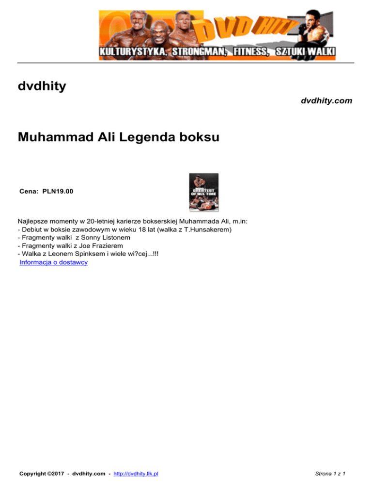 dvdhity dvdhity.com Muhammad Ali Legenda boksu Cena: PLN19.00 Najlepsze momenty w 20-letniej karierze bokserskiej Muhammada Ali, m.in: - Debiut w boksie zawodowym w wieku 18 lat (walka z T.Hunsakerem) - Fragmenty walki z Sonny Listonem - Fragmenty walki z Joe Frazierem - Walka z Leonem Spinksem i wiele wi?cej...!!! Informacja o dostawcy Copyright ©2017 - dvdhity.com - http://dvdhity.llk.pl Strona 1 z 1