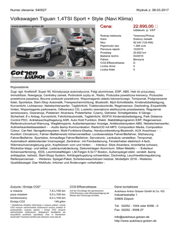 Numer zlecenia: 540527 Wydruk z: 08.03.2017 Volkswagen Tiguan 1,4TSI Sport + Style (Navi Klima) Cena: 22.890,00 Rodzaj nadwozia Kolor Moc Pojemność sko. Pierwsza rejestr. Przebieg Badanie techni. Paliwo CO2-Effizenzklasse Liczba drzwi Liczba foteli Terenowy/Pickup Srebrny metalik 92 kW (125 KM) 1.395 ccm 10/2015 20.602 km 03/2019 Benzyna D 5 5 Udokum. p. VAT Wyposażenie Zugr.-lgd. Kraftstoff: Super 95, Klimatyzacja automatyczna, Felgi aluminiowe, ESP, ABS, Hak do przyczepy, Immobilizer, Nawigacja, Centralny zamek, Podnośnik szyby el., Radio, Poduszka powietrzna kierowcy, Poduszka powietrzna pasażera, Boczne poduszki powietrzne, Wspomaganie układu kierowniczego, Tempomat, Podgrzewanie foteli, Sportsitze, Start-/Stop Automatik, Freisprecheinrichtung, Bluetooth, Mp3-Schnittstelle, Kindersitzbefestigung, Kurvenlicht, Lichtsensor, Nebelscheinwerfer, Tagfahrlicht, Traktionskontrolle, Regensensor, Dachreling, Einparkhilfe hinten, Wspomaganie parkowania, Odtwarzacz CD, Lusterko zewnętrzne elektrycznie przestawiane, Regularnie serwisowany, Gwarancja, Polsterart: Alcantara, Polsterfarbe: Czarny, Getriebe: Schaltgetriebe, 6 Gänge - Sicherheit: 8 x Airbag, Kurvenlicht, Fahrlichtautomatik, Tagfahrlicht, ISOFIX Kindersitzbefestigung, Park Distance Control PDC, Antriebsschlupfregelung ASR, Auto Hold Funktion, Elektr. Stabilitätsprogramm ESP, Regensensor, Reifendruckverlust-Warnung, Wegfahrsperre, Außentemperatur Anzeige, Antiblockiersystem ABS, Nebelscheinwerfer, Aufmerksamkeitsassistent - - Audio & Kommunikation: Radio/CD mit MP3: Composition Media, Composition Colour, Car-Net, Navigationssystem, Multi-Funktions-Display, Handyvorbereitung Bluetooth, AUX Anschluss - Komfort: Climatronic, Fahrer-/Beifahrersitz höhenverstellbar, Lordosenstütze Fahrer/Beifahrer, Sitzheizung Fahrer/Beifahrer, Sportsitze, Armauflage Fahrer/Beifahrer, Servotronic, Lenksäule verstellbar, Tempomat, Automatisch abblendender Innenspiegel, Zentralver. mit Fernbedienung, Fensterheber elektrisch 4-fach, Wärmeschutzverglasung grün, Kopfstützen vorn und hinten - - Interieur: Sitze Alcantara, Innenfarbe schwarz, Rücksitze klapp- und teilbar, Laderaumabdeckung, Dekoreinlagen Aluminium: Silber-Metallic - - Exterieur: Scheinwerferreinig., EDS, Leichtmetallfelgen: LM-Felgen 6.5x17 Boston, Außenspiegel elekt. verstell- & anklappbar, beheizt, Start-Stopp System, Anhängerkupplung schwenkbar, Dachreling, Leuchtweitenregulierung, Reifenpannenset - - Weiteres: Spiegel-Paket, Scheibenwaschdüsen heizbar, Modelljahr 2016 - Weiteres: Qualitätssiegel: Das WeltAuto, Irrtümer und Änderungen vorbehalten - Zużycie / Emisja CO2* w mieście poza miastem kombinowany Emisja CO2 7,8 L/100 km 5,5 L/100 km 6,4 L/100 km 149 g/km * Dodatkowe oficjalne informacje o zużyciu paliwa i emisji CO2 nowych samochodów osobowych można znaleźć w przewodniku zużycia paliwa i emisji CO2 nowych samochodów osobowych, dostępnym bezpłatnie we wszystkich punktach sprzedaży oraz w Deutschen Automobil Treuhand GmbH pod adresem www.dat.de CO2-Effizenzklasse Dane kontaktowe Auf der Grundlage der gemessenen CO2-Emission unter Berücksichtigung der Masse des Fahrzeugs ermittelt. Autohaus Anton Gotzen GmbH & Co. KG Industriestraße 1 53909 Zülpich Tel. 02252 - 1044 oder 8358 - 0 Fax 02252 - 8358 27 [email protected] http://www.autohaus-gotzen.de Numer zlecenia: 540527 Volkswagen Tiguan 1,4TSI Sport + Style (Navi Klima) Wydruk z: 08.03.2017 Numer zlecenia: 540527 Volkswagen Tiguan 1,4TSI Sport + Style (Navi Klima) Wydruk z: 08.03.2017