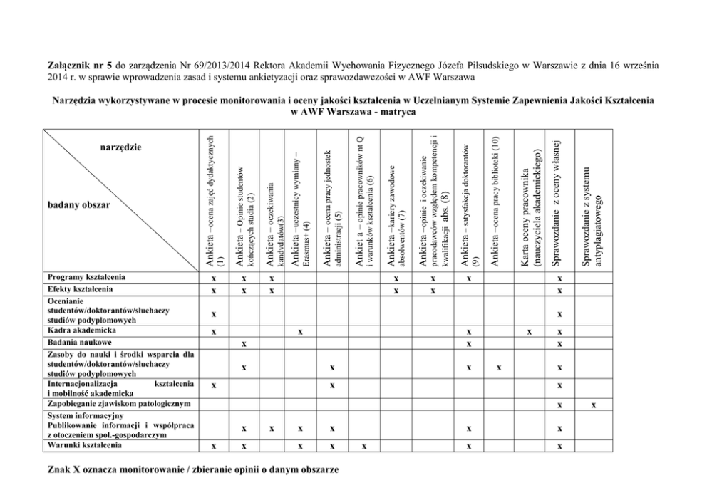 Załącznik nr 5 do zarządzenia Nr 69/2013/2014 Rektora Akademii Wychowania Fizycznego Józefa Piłsudskiego w Warszawie z dnia 16 września 2014 r. w sprawie wprowadzenia zasad i systemu ankietyzacji oraz sprawozdawczości w AWF Warszawa Programy kształcenia Efekty kształcenia Ocenianie studentów/doktorantów/słuchaczy studiów podyplomowych Kadra akademicka Badania naukowe Zasoby do nauki i środki wsparcia dla studentów/doktorantów/słuchaczy studiów podyplomowych Internacjonalizacja kształcenia i mobilność akademicka Zapobieganie zjawiskom patologicznym System informacyjny Publikowanie informacji i współpraca z otoczeniem społ.-gospodarczym Warunki kształcenia x x x x x x x x x x x x x x x x x x x x x x x x x x x x x x x x x x Sprawozdanie z systemu antyplagiatowego Sprawozdanie z oceny własnej Karta oceny pracownika (nauczyciela akademickiego) Ankieta –ocena pracy biblioteki (10) (9) Ankieta – satysfakcja doktorantów pracodawców względem kompetencji i kwalifikacji abs. (8) Ankieta –opinie i oczekiwanie absolwentów (7) Ankieta –kariery zawodowe i warunków kształcenia (6) Ankiet a – opinie pracowników nt Q administracji (5) Ankieta – ocena pracy jednostek Erasmus+ (4) Ankieta –uczestnicy wymiany – kandydatów(3) Ankieta – oczekiwania kończących studia (2) Ankieta – Opinie studentów badany obszar (1) narzędzie Ankieta –ocena zajęć dydaktycznych Narzędzia wykorzystywane w procesie monitorowania i oceny jakości kształcenia w Uczelnianym Systemie Zapewnienia Jakości Kształcenia w AWF Warszawa - matryca x x x x x x Znak X oznacza monitorowanie / zbieranie opinii o danym obszarze x x x x x x