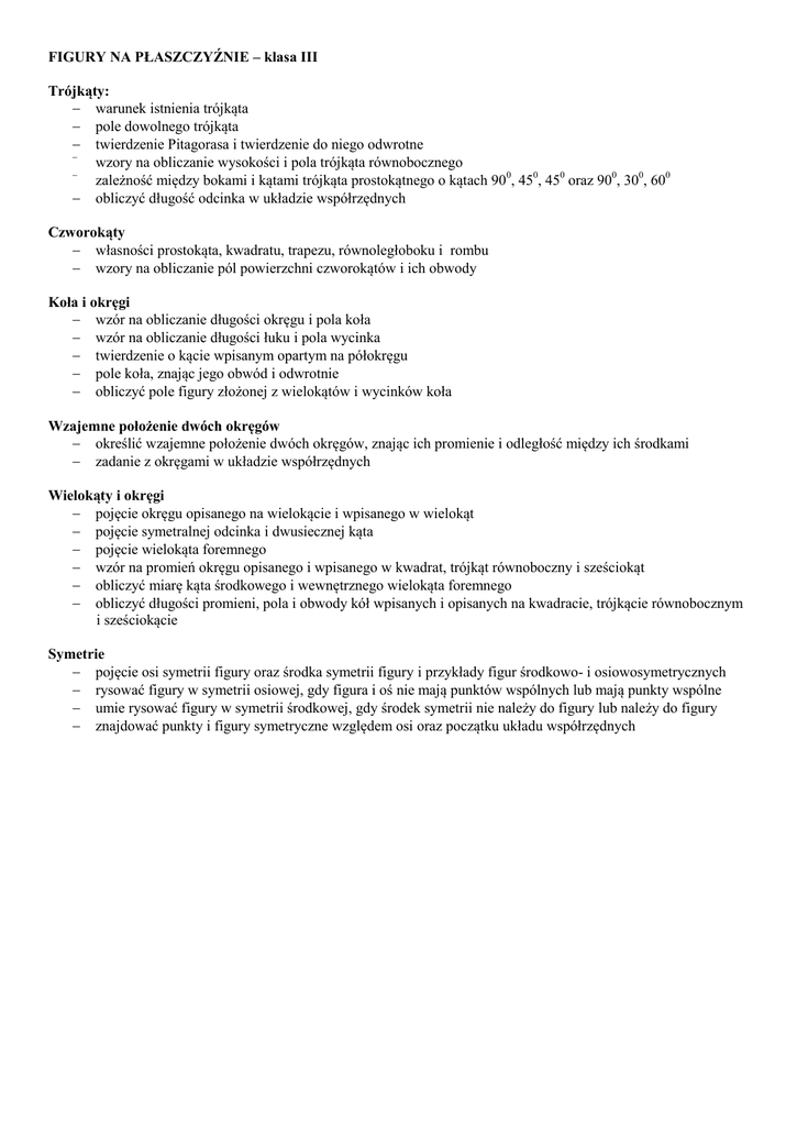 FIGURY NA PŁASZCZYŹNIE – klasa III Trójkąty: warunek istnienia trójkąta pole dowolnego trójkąta twierdzenie Pitagorasa i twierdzenie do niego odwrotne wzory na obliczanie wysokości i pola trójkąta równobocznego zależność między bokami i kątami trójkąta prostokątnego o kątach 900, 450, 450 oraz 900, 300, 600 obliczyć długość odcinka w układzie współrzędnych Czworokąty własności prostokąta, kwadratu, trapezu, równoległoboku i rombu wzory na obliczanie pól powierzchni czworokątów i ich obwody Koła i okręgi wzór na obliczanie długości okręgu i pola koła wzór na obliczanie długości łuku i pola wycinka twierdzenie o kącie wpisanym opartym na półokręgu pole koła, znając jego obwód i odwrotnie obliczyć pole figury złożonej z wielokątów i wycinków koła Wzajemne położenie dwóch okręgów określić wzajemne położenie dwóch okręgów, znając ich promienie i odległość między ich środkami zadanie z okręgami w układzie współrzędnych Wielokąty i okręgi pojęcie okręgu opisanego na wielokącie i wpisanego w wielokąt pojęcie symetralnej odcinka i dwusiecznej kąta pojęcie wielokąta foremnego wzór na promień okręgu opisanego i wpisanego w kwadrat, trójkąt równoboczny i sześciokąt obliczyć miarę kąta środkowego i wewnętrznego wielokąta foremnego obliczyć długości promieni, pola i obwody kół wpisanych i opisanych na kwadracie, trójkącie równobocznym i sześciokącie Symetrie pojęcie osi symetrii figury oraz środka symetrii figury i przykłady figur środkowo- i osiowosymetrycznych rysować figury w symetrii osiowej, gdy figura i oś nie mają punktów wspólnych lub mają punkty wspólne umie rysować figury w symetrii środkowej, gdy środek symetrii nie należy do figury lub należy do figury znajdować punkty i figury symetryczne względem osi oraz początku układu współrzędnych
