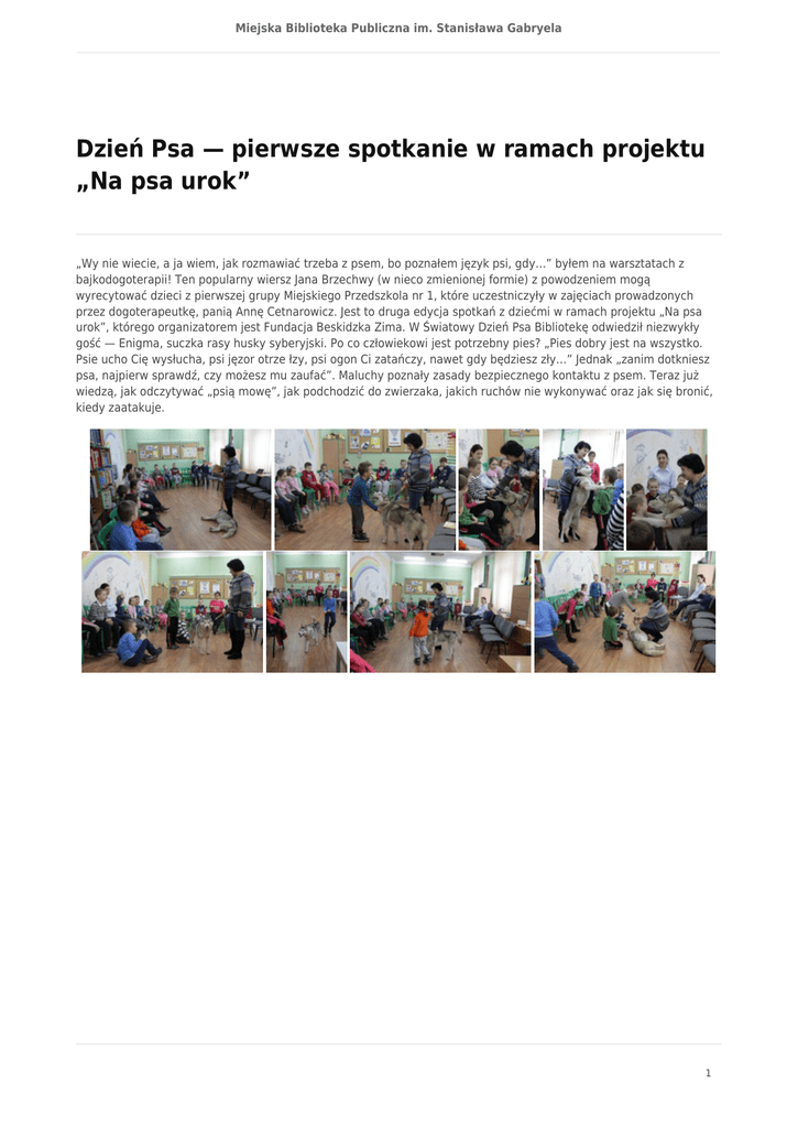 Miejska Biblioteka Publiczna im. Stanisława Gabryela Dzień Psa — pierwsze spotkanie w ramach projektu „Na psa urok” „Wy nie wiecie, a ja wiem, jak rozmawiać trzeba z psem, bo poznałem język psi, gdy…” byłem na warsztatach z bajkodogoterapii! Ten popularny wiersz Jana Brzechwy (w nieco zmienionej formie) z powodzeniem mogą wyrecytować dzieci z pierwszej grupy Miejskiego Przedszkola nr 1, które uczestniczyły w zajęciach prowadzonych przez dogoterapeutkę, panią Annę Cetnarowicz. Jest to druga edycja spotkań z dziećmi w ramach projektu „Na psa urok”, którego organizatorem jest Fundacja Beskidzka Zima. W Światowy Dzień Psa Bibliotekę odwiedził niezwykły gość — Enigma, suczka rasy husky syberyjski. Po co człowiekowi jest potrzebny pies? „Pies dobry jest na wszystko. Psie ucho Cię wysłucha, psi jęzor otrze łzy, psi ogon Ci zatańczy, nawet gdy będziesz zły…” Jednak „zanim dotkniesz psa, najpierw sprawdź, czy możesz mu zaufać”. Maluchy poznały zasady bezpiecznego kontaktu z psem. Teraz już wiedzą, jak odczytywać „psią mowę”, jak podchodzić do zwierzaka, jakich ruchów nie wykonywać oraz jak się bronić, kiedy zaatakuje. 1