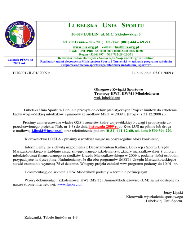 LUBELSKA UNIA SPORTU 20-029 LUBLIN ul. M.C. Skłodowskiej 5 Tel. (081) 444 – 69 - 90 ; Tel./Fax. (081) 444 – 69 -91 www.lus.org.pl e-mail: [email protected] Członek PFSM od 2005 roku Bank BPH PBK 56 1060 0076 0000 3300 0027 8038 Regon 432661997 NIP 712-28-02-371 Realizator zadań zleconych z Samorządu Wojewódzkiego w Lublinie Realizator zadań zleconych z Ministerstwa Sportu i Turystyki w zakresie programu szkolenia i współzawodnictwa sportowego młodzieży uzdolnionej sportowo LUS/ 01 /JL/01/ 2009 r. Lublin, dnia 05.01.2009 r. Okręgowe Związki Sportowe Trenerzy KWJ, KWM i Młodzieżowca woj. lubelskiego Lubelska Unia Sportu w Lublinie przesyła do celów planistycznych Projekt limitów do szkolenia kadry wojewódzkiej młodzików i juniorów ze środków MSiT w 2009 r. (Projekt z 31.12.2008 r.) Prosimy zainteresowane władze OZS i trenerów kadry wojewódzkiej o uwagi i propozycje do przedstawionego projektu (Tab. nr 1-3) do dnia 9 stycznia 2009 r. do Kws LUS na piśmie lub drogą e-mailową: [email protected] oraz telefonicznie pod nr: (0-81) 441-12-60, tel. kom 0 509 394 220. Kierownictwo LOZLA - prosimy o rozdział miejsc na poszczególne bloki konkurencji. Informujemy, ze z chwilą uzgodnienia z Departamentem Kultury, Edukacji i Sportu Urzędu Marszałkowskiego w Lublinie zasad zintegrowanego szkolenia tzw. „kadry marszałkowskiej (juniora i młodzieżowca) finansowanego ze środków Urzędu Marszałkowskiego w 2009 r. podamy ilości osobodni przypadające na dyscyplinę. Nadmieniamy, że dla obu programów (MSiT i Urzędu Marszałkowskiego) stawki osobodnia wynoszą 75 zł dziennie. Wstępny projekt założeń w/w programu podamy do 10.01. br. Dokumentację do szkolenia KW Młodzików podamy w terminie późniejszym. Wzory dokumentacji szkoleniowej KWJ (MSiT) i Junior/Młodzieżowiec (UM) są już dostępne na naszej stronie internetowej: www.lus.org.pl Jerzy Lipski Kierownik wyszkolenia sportowego Lubelskiej Unii Sportu. Załączniki; Tabele limitów nr 1-3 Tab. nr 1. Projekt limitów do szkolenia kadry wojewódzkiej młodzików i juniorów w dyscyplinach indywidualnych ze środków MSiT w 2009 r. 1. 2. 3. 4. 5. 6. 7. 8. 9. 10. 11. 12. 13. 14. 15. 16. 17. 18. 19. 20. Limity KWJ i KWM - 2009 (Projekt na 31.12.2008) Dyscypliny indywidualne KWJ KWM akrobatyka 2 8 badminton 9 18 bieg na orientację 0 10 gimnastyka sportowa K 0 8 jeździectwo 4 0 kajakarstwo 4 6 kolarstwo 11 12 koszykówka K 10 14 koszykówka M 10 14 lekka atletyka 53 68 łucznictwo 6 12 narciarstwo klasyczne 8 16 pięciobój nowoczesny 8 12 pływanie 25 27 podnoszenie ciężarów 36 20 strzelectwo 10 6 szachy 0 8 wrotkarstwo 0 10 tenis 4 0 tenis stołowy 10 14 RAZEM 210 283 Uwaga w szkoleniu kadry wojewódzkiej (młodzieżowca ) w dyscyplinach indywidualnych ze środków Urzędu Marszałkowskiego przewiduje się podobny jak w 2008 r. rozdział osobodni na szkolenie w w/w dyscyplinach+ biegi przełajowe-przygotowania do OOM-MPJ. Tab. nr 2. Projekt limitów do szkolenia kadry wojewódzkiej młodzików i juniorów w grach sportowych ze środków MSiT w 2009 r. 1. 2. 3. 4. 5. 6. 7. 8. 9. 10. 11 12. Limity KWJ i KWM - 2009 (Projekt na 31.12.2008) Gry Sportowe KWJ KWM kajak polo 2 14 koszykówka K 10 14 koszykówka M 10 14 piłka nożna K 8 12 piłka nożna M 0 18 piłka ręczna K 14 14 piłka ręczna M 14 14 piłka siatkowa K 12 12 piłka siatkowa M 12 12 piłka siatkowa plażowa K 6 0 piłka siatkowa plażowa M 2 0 rugby 17 20 RAZEM 107 144 Uwaga w szkoleniu kadry wojewódzkiej (juniora ) ze środków Urzędu Marszałkowskiego przewiduje się podobny jak w 2008 r. rozdział osobodni na szkolenie w w/w dyscyplinach + przygotowania reprezentacji klubowych i wojewódzkich do OOM ,klubowych do MPJ + szkolenie zintegrowane z KWJ (MSiT). Tab. nr 3. Projekt limitów do szkolenia kadry wojewódzkiej młodzików i juniorów w sportach walki ze środków MSiT w 2009 r. Limity KWJ i KWM - 2009 (Projekt na 31.12.2008) Sporty walki KWJ KWM 1. boks 8 10 2. judo K 4 12 3. judo M 4 12 4. karate kyokushin 2 14 5. karate tradycyjne 7 22 6. sumo 2 10 7. taekwondo ITF 15 22 8. taekwondo olimpijskie 12 14 9. zapasy klasyczne 19 22 10. zapasy kobiet 41 26 11. zapasy wolne 28 36 RAZEM 142 200 Uwaga w szkoleniu kadry wojewódzkiej (młodzieżowca ) w sportach walki ze środków Urzędu Marszałkowskiego przewiduje się podobny jak w 2008 r. rozdział osobodni na szkolenie w w/w dyscyplinach + kick-boxing (junior-młodzieżowiec)