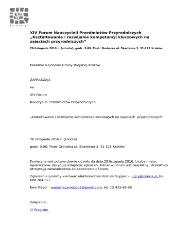 XIV Forum Nauczycieli Przedmiotów Przyrodniczych „Kształtowanie i rozwijanie kompetencji kluczowych na zajęciach przyrodniczych” 26 listopada 2016 r. (sobota), godz. 9.00, Teatr Groteska ul. Skarbowa 2, 31-121 Kraków Poradnie Rejonowe Gminy Miejskiej Kraków ZAPRASZAJĄ na XIV Forum Nauczycieli Przedmiotów Przyrodniczych „Kształtowanie i rozwijanie kompetencji kluczowych na zajęciach przyrodniczych” 26 listopada 2016 r. (sobota) godz. 9.00, Teatr Groteska ul. Skarbowa 2, 31-121 Kraków Konieczne jest potwierdzenie udziału do dnia 20 listopada 2016. Liczba miejsc ograniczona, decyduje kolejność zgłoszeń. Udział w Forum jest bezpłatny. Uczestnicy otrzymują zaświadczenia po zakończeniu Forum. Zgłoszenia prosimy kierować elektronicznie Urszula Grygier – [email protected], tel. 608 284 527 Ewa Mayer - [email protected], tel. 12 415-69-68 Załączniki: 1) Program Powered by TCPDF (www.tcpdf.org)