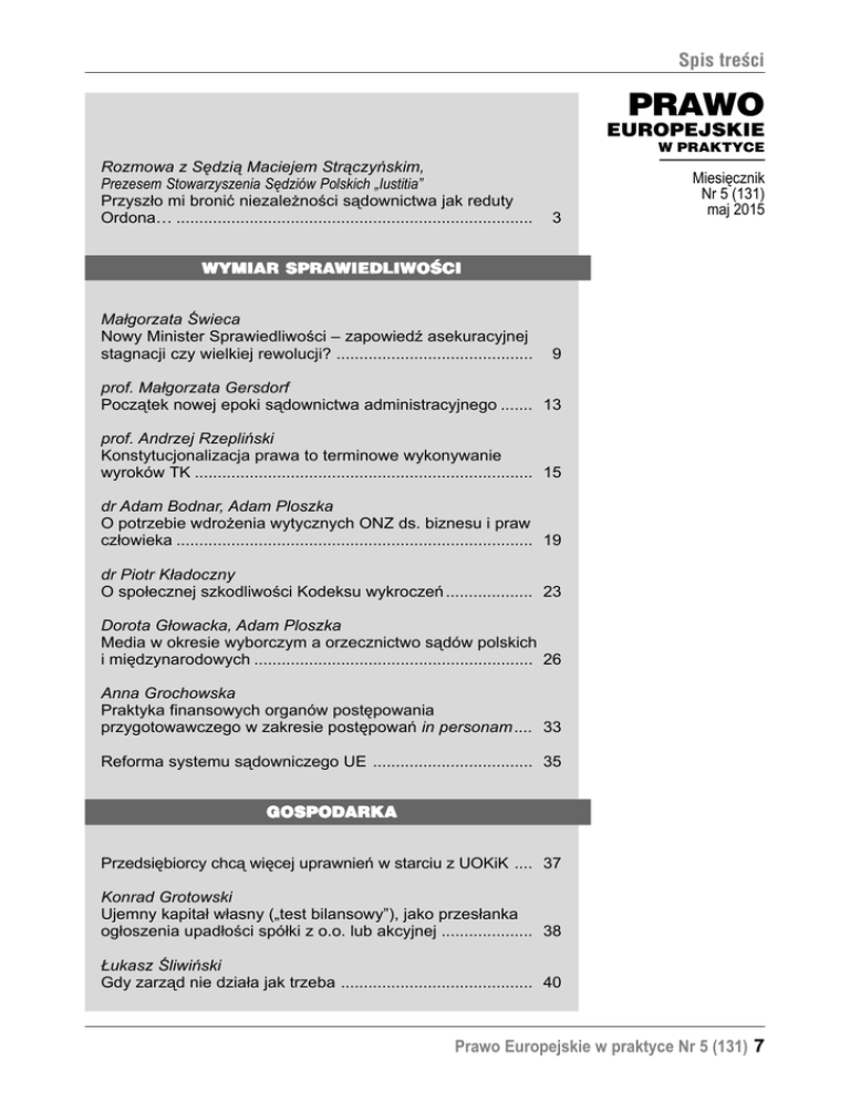 Spis treœci PRAWO EUROPEJSKIE W PRAKTYCE Rozmowa z Sêdzi¹ Maciejem Str¹czyñskim, Prezesem Stowarzyszenia Sędziów Polskich „Iustitia” Przysz³o mi broniæ niezale¿noœci s¹downictwa jak reduty Ordona… .............................................................................. 3 Miesięcznik Nr 5 (131) maj 2015 WYMIAR SPRA SPRAWIEDLIWOŒCI WIEDLIWOŒCI Ma³gorzata Œwieca Nowy Minister Sprawiedliwoœci – zapowiedŸ asekuracyjnej stagnacji czy wielkiej rewolucji? ........................................... 9 prof. Ma³gorzata Gersdorf Pocz¹tek nowej epoki s¹downictwa administracyjnego ....... 13 prof. Andrzej Rzepliñski Konstytucjonalizacja prawa to terminowe wykonywanie wyroków TK .......................................................................... 15 dr Adam Bodnar, Adam Ploszka O potrzebie wdro¿enia wytycznych ONZ ds. biznesu i praw cz³owieka .............................................................................. 19 dr Piotr K³adoczny O spo³ecznej szkodliwoœci Kodeksu wykroczeñ ................... 23 Dorota G³owacka, Adam Ploszka Media w okresie wyborczym a orzecznictwo s¹dów polskich i miêdzynarodowych ............................................................. 26 Anna Grochowska Praktyka finansowych organów postêpowania przygotowawczego w zakresie postêpowañ in personam .... 33 Reforma systemu s¹downiczego UE ................................... 35 GOSPODARKA Przedsiêbiorcy chc¹ wiêcej uprawnieñ w starciu z UOKiK .... 37 Konrad Grotowski Ujemny kapita³ w³asny („test bilansowy”), jako przes³anka og³oszenia upad³oœci spó³ki z o.o. lub akcyjnej .................... 38 £ukasz Œliwiñski Gdy zarz¹d nie dzia³a jak trzeba .......................................... 40 Prawo Europejskie w praktyce Nr 5 (131) 7 Spis treœci PRAWO EUROPEJSKIE W PRAKTYCE Miesięcznik Nr 5 (131) maj 2015 Janusz Tomczak Postêpowania wewnêtrzne – alternatywa dla organów œcigania? .............................................................................. 43 Krzysztof Libiszewski Restrukturyzacja du¿ych przedsiêbiorców w Polsce ............ 45 Orzecznictwo Jednolity system ochrony patentowej bez zmian ...................... 48 INICJATYWY TYWY EUROPEJSKIE INICJA Dominika Jêdrzejczyk Zakres zastosowania i s¹dowa interpretacja kanadyjskiej Charter of Rights and Freedoms oraz jej porównanie z Kart¹ Praw Podstawowych UE .......................................... 51 Europejska agenda bezpieczeñstwa: pytania i odpowiedzi .......................................................................... 60 Procedura nadmiernego deficytu dla Polski zamkniêta ........ 65 PRA WO FINANSOWE PRAWO Rozmowa z Monik¹ Jakubczyk, Partnerem w dziale Audytu Deloitte i Iren¹ Pichol¹, Partnerem, Liderem zespołu Sustainability Consulting Central Europe Deloitte Raportowanie zintegrowane ma wielk¹ przysz³oœæ .............. 67 Alicja Gaca Opodatkowanie zmian umów spó³ek komndytowo-akcyjnych podatkiem od czynnoœci cywilnoprawnych.............................. 70 Orzecznictwo Niedopuszczalność skargi na decyzje EBC utrzymana w mocy ..... 74 OPINIE, EKSPER TYZY EKSPERTYZY TYZY,, RECENZJE Jaros³aw Duœ Od kiedy system prawa zna pojêcie ludobójstwa? ............... 75 dr Tomasz Kalita Wezwanie do usuniêcia braków formalnych wniosku o przyznanie p³atnoœci bezpoœrednich ................................. 83 8 www.pewp.pl