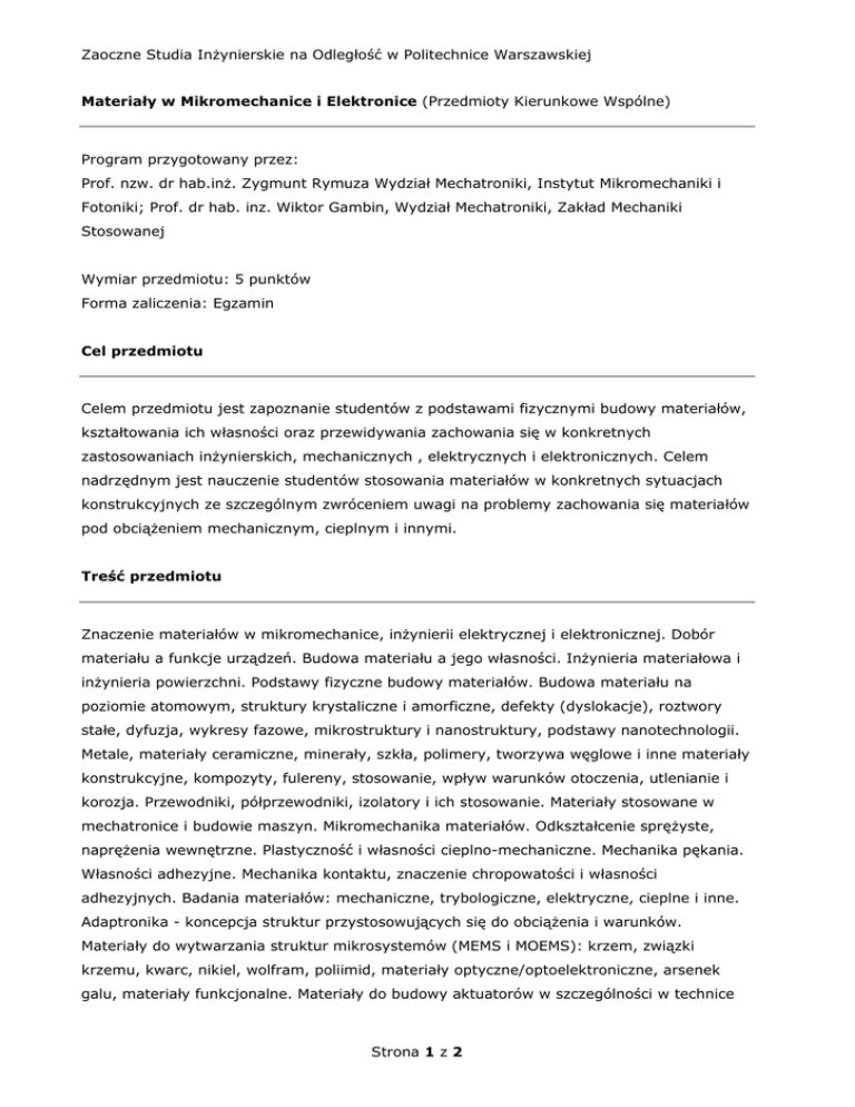 Zaoczne Studia Inżynierskie na Odległość w Politechnice Warszawskiej Materiały w Mikromechanice i Elektronice (Przedmioty Kierunkowe Wspólne) Program przygotowany przez: Prof. nzw. dr hab.inż. Zygmunt Rymuza Wydział Mechatroniki, Instytut Mikromechaniki i Fotoniki; Prof. dr hab. inz. Wiktor Gambin, Wydział Mechatroniki, Zakład Mechaniki Stosowanej Wymiar przedmiotu: 5 punktów Forma zaliczenia: Egzamin Cel przedmiotu Celem przedmiotu jest zapoznanie studentów z podstawami fizycznymi budowy materiałów, kształtowania ich własności oraz przewidywania zachowania się w konkretnych zastosowaniach inżynierskich, mechanicznych , elektrycznych i elektronicznych. Celem nadrzędnym jest nauczenie studentów stosowania materiałów w konkretnych sytuacjach konstrukcyjnych ze szczególnym zwróceniem uwagi na problemy zachowania się materiałów pod obciążeniem mechanicznym, cieplnym i innymi. Treść przedmiotu Znaczenie materiałów w mikromechanice, inżynierii elektrycznej i elektronicznej. Dobór materiału a funkcje urządzeń. Budowa materiału a jego własności. Inżynieria materiałowa i inżynieria powierzchni. Podstawy fizyczne budowy materiałów. Budowa materiału na poziomie atomowym, struktury krystaliczne i amorficzne, defekty (dyslokacje), roztwory stałe, dyfuzja, wykresy fazowe, mikrostruktury i nanostruktury, podstawy nanotechnologii. Metale, materiały ceramiczne, minerały, szkła, polimery, tworzywa węglowe i inne materiały konstrukcyjne, kompozyty, fulereny, stosowanie, wpływ warunków otoczenia, utlenianie i korozja. Przewodniki, półprzewodniki, izolatory i ich stosowanie. Materiały stosowane w mechatronice i budowie maszyn. Mikromechanika materiałów. Odkształcenie sprężyste, naprężenia wewnętrzne. Plastyczność i własności cieplno-mechaniczne. Mechanika pękania. Własności adhezyjne. Mechanika kontaktu, znaczenie chropowatości i własności adhezyjnych. Badania materiałów: mechaniczne, trybologiczne, elektryczne, cieplne i inne. Adaptronika - koncepcja struktur przystosowujących się do obciążenia i warunków. Materiały do wytwarzania struktur mikrosystemów (MEMS i MOEMS): krzem, związki krzemu, kwarc, nikiel, wolfram, poliimid, materiały optyczne/optoelektroniczne, arsenek galu, materiały funkcjonalne. Materiały do budowy aktuatorów w szczególności w technice Strona 1 z 2 Zaoczne Studia Inżynierskie na Odległość w Politechnice Warszawskiej mikrosystemów (MEMS). Kształtowanie warstwy wierzchniej materiałów - powłoki. Inżynieria powierzchni. Nowoczesne techniki modyfikacji warstwy wierzchniej i nanoszenia powłok. Powłoki ultra cienkie, implantacja jonów, mieszanie jonowe. Zastosowania w szczególności w elektronice, optyce, mikromechanice, technice MEMS, technice zapisu magnetycznego (twarde dyski). Bibliografia • Ashby M.F., Jones D.R.H. Materiały inżynierskie, WNT, Warszawa 1995 • Haddad Y.M. Mechanical Behaviour of Engineering Materials, Kluwer Academic Press, Dordrecht 2000 • Ashby M.F. Materials Selection in Mechanical Design. Butterworth Heineman, Oxford 2000 Strona 2 z 2
