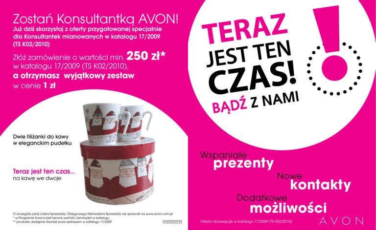 Zostań Konsultantką AVON! Już dziś skorzystaj z oferty przygotowanej specjalnie dla Konsultantek mianowanych w katalogu 17/2009 (TS K02/2010) 250 zł* Złóż zamówienie o wartości min. w katalogu 17/2009 (TS K02/2010), a otrzymasz wyjątkowy zestaw w cenie 1 zł Dwie filiżanki do kawy w eleganckim pudełku Wspaniałe prezenty Teraz jest ten czas… na kawę we dwoje Nowe kontakty Dodatkowe O szczegóły pytaj Lidera Sprzedaży, Okręgowego Menedżera Sprzedaży lub sprawdź na www.avon.com.pl * w Programie liczona jest łączna wartość zamówień w katalogu PL 9 9 9 2 ** produkty dostępne również poza zestawem w katalogu 17/2009 możliwości 2 7 9 Oferta obowiązuje w katalogu 17/2009 (TS K02/2010) Prosty sposób Zachęć przyjaciółkę, aby dołączyła do AVON na złożenie zamówienia o wartości min. 250 zł! Jeżeli w katalogu 17/2009 polecona przez Ciebie Konsultantka złoży zamówienie o wartości min. 250 zł*, otrzymasz wyjątkowy zestaw w cenie 1 zł kod zestawu 7396 5 Zamów proponowany zestaw produktów** z katalogu 17/2009 w cenie 262,30 zł Zestaw dostępny w K17/2009 (TS K02/2010) Dwie filiżanki do kawy w eleganckim pudełku Teraz jest ten czas… na kawę we dwoje