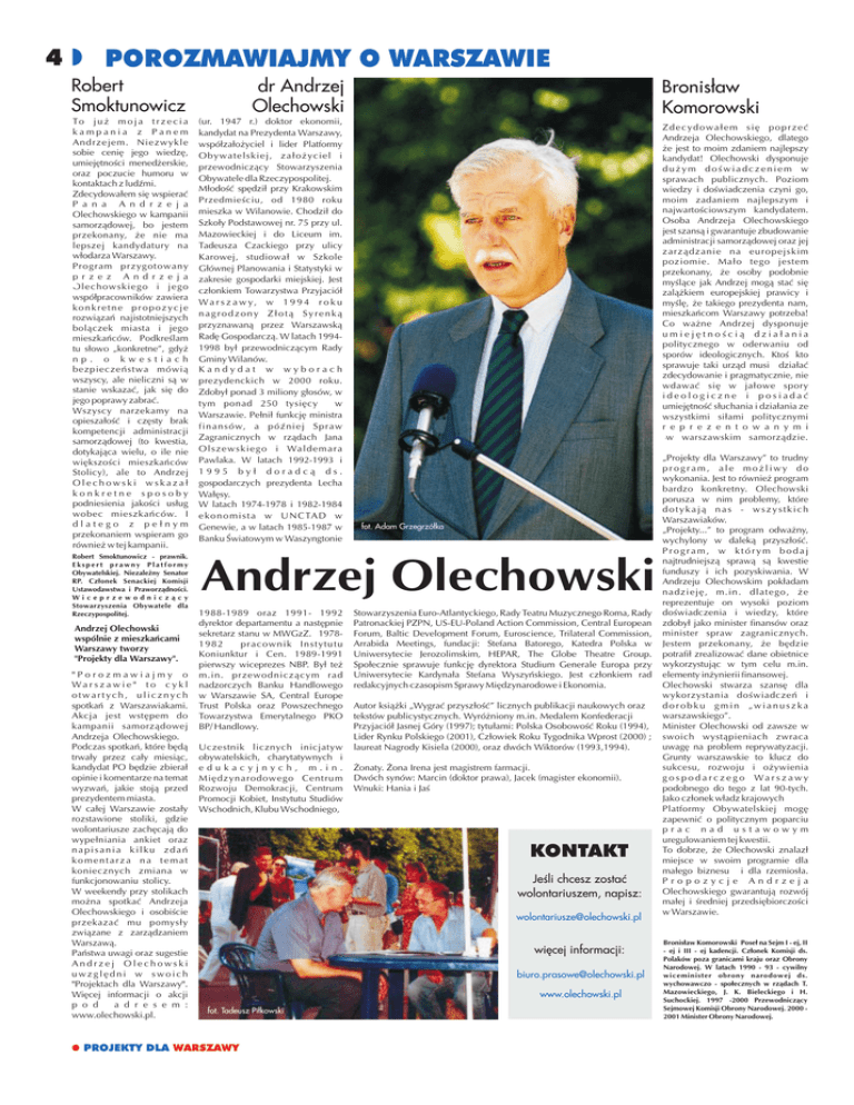 4 POROZMAWIAJMY O WARSZAWIEwww.olechowski.pl Robert Smoktunowicz To j u ¿ m o j a t r z e c i a kampania z Panem Andrzejem. Niezwykle sobie ceniê jego wiedzê, umiejêtnoœci mened¿erskie, oraz poczucie humoru w kontaktach z ludŸmi. Zdecydowa³em siê wspieraæ P a n a A n d r z e j a Olechowskiego w kampanii samorz¹dowej, bo jestem przekonany, ¿e nie ma lepszej kandydatury na w³odarza Warszawy. Program przygotowany p r z e z A n d r z e j a O l e c how sk i e g o i j e g o wspó³pracowników zawiera konkretne propozycje rozwi¹zañ najistotniejszych bol¹czek miasta i jego mieszkañców. Podkreœlam tu s³owo „konkretne”, gdy¿ np. o kwestiach bezpieczeñstwa mówi¹ wszyscy, ale nieliczni s¹ w stanie wskazaæ, jak siê do jego poprawy zabraæ. Wszyscy narzekamy na opiesza³oœæ i czêsty brak kompetencji administracji samorz¹dowej (to kwestia, dotykaj¹ca wielu, o ile nie wiêkszoœci mieszkañców Stolicy), ale to Andrzej Olechowski wskaza³ konkretne sposoby podniesienia jakoœci us³ug wobec mieszkañców. I dlatego z pe³nym przekonaniem wspieram go równie¿ w tej kampanii. Robert Smoktunowicz - prawnik. Ekspert prawny Platformy Obywatelskiej. Niezale¿ny Senator RP. Cz³onek Senackiej Komisji Ustawodawstwa i Praworz¹dnoœci. Wiceprzewodnicz¹cy Stowarzyszenia Obywatele dla Rzeczypospolitej. Andrzej Olechowski wspólnie z mieszkañcami Warszawy tworzy "Projekty dla Warszawy". "Porozmawiajmy o Warszawie" to cykl otwartych, ulicznych spotkañ z Warszawiakami. Akcja jest wstêpem do kampanii samorz¹dowej Andrzeja Olechowskiego. Podczas spotkañ, które bêd¹ trwa³y przez ca³y miesi¹c, kandydat PO bêdzie zbiera³ opinie i komentarze na temat wyzwañ, jakie stoj¹ przed prezydentem miasta. W ca³ej Warszawie zosta³y rozstawione stoliki, gdzie wolontariusze zachêcaj¹ do wype³niania ankiet oraz napisania kilku zdañ komentarza na temat koniecznych zmiana w funkcjonowaniu stolicy. W weekendy przy stolikach mo¿na spotkaæ Andrzeja Olechowskiego i osobiœcie przekazaæ mu pomys³y zwi¹zane z zarz¹dzaniem Warszaw¹. Pañstwa uwagi oraz sugestie Andrzej Olechowski uwzglêdni w swoich "Projektach dla Warszawy". Wiêcej informacji o akcji p o d a d r e s e m : www.olechowski.pl. dr Andrzej Olechowski (ur. 1947 r.) doktor ekonomii, kandydat na Prezydenta Warszawy, wspó³za³o¿yciel i lider Platformy Obywatelskiej, za³o¿yciel i przewodnicz¹cy Stowarzyszenia Obywatele dla Rzeczypospolitej. M³odoœæ spêdzi³ przy Krakowskim Przedmieœciu, od 1980 roku mieszka w Wilanowie. Chodzi³ do Szko³y Podstawowej nr. 75 przy ul. Mazowieckiej i do Liceum im. Tadeusza Czackiego przy ulicy Karowej, studiowa³ w Szkole G³ównej Planowania i Statystyki w zakresie gospodarki miejskiej. Jest cz³onkiem Towarzystwa Przyjació³ Wa r s z a w y, w 1 9 9 4 r o k u nagrodzony Z³ot¹ Syrenk¹ przyznawan¹ przez Warszawsk¹ Radê Gospodarcz¹. W latach 19941998 by³ przewodnicz¹cym Rady Gminy Wilanów. Kandydat w wyborach prezydenckich w 2000 roku. Zdoby³ ponad 3 miliony g³osów, w tym ponad 250 tysiêcy w Warszawie. Pe³ni³ funkcjê ministra f i n a n s ó w, a p ó Ÿ n i e j S p r a w Zagranicznych w rz¹dach Jana O l s z e w s k i e g o i Wa l d e m a r a Pawlaka. W latach 1992-1993 i 1995 by³ doradc¹ ds. gospodarczych prezydenta Lecha Wa³êsy. W latach 1974-1978 i 1982-1984 e k o n o m i s t a w U N C TA D w Genewie, a w latach 1985-1987 w Banku Œwiatowym w Waszyngtonie Bronis³aw Komorowski Zdecydowa³em siê poprzeæ Andrzeja Olechowskiego, dlatego ¿e jest to moim zdaniem najlepszy kandydat! Olechowski dysponuje du¿ym doœwiadczeniem w sprawach publicznych. Poziom wiedzy i doœwiadczenia czyni go, moim zadaniem najlepszym i najwartoœciowszym kandydatem. Osoba Andrzeja Olechowskiego jest szans¹ i gwarantuje zbudowanie administracji samorz¹dowej oraz jej zarz¹dzanie na europejskim poziomie. Ma³o tego jestem przekonany, ¿e osoby podobnie myœl¹ce jak Andrzej mog¹ staæ siê zal¹¿kiem europejskiej prawicy i myœlê, ¿e takiego prezydenta nam, mieszkañcom Warszawy potrzeba! Co wa¿ne Andrzej dysponuje umiejêtnoœci¹ dzia³ania politycznego w oderwaniu od sporów ideologicznych. Ktoœ kto sprawuje taki urz¹d musi dzia³aæ zdecydowanie i pragmatycznie, nie wdawaæ siê w ja³owe spory ideologiczne i posiadaæ umiejêtnoœæ s³uchania i dzia³ania ze wszystkimi si³ami politycznymi r e p r e z e n t o w a n y m i !w warszawskim samorz¹dzie. fot. Adam Grzegrzó³ka Andrzej Olechowski 1988-1989 oraz 1991- 1992 dyrektor departamentu a nastêpnie sekretarz stanu w MWGzZ. 19781982 pracownik Instytutu Koniunktur i Cen. 1989-1991 pierwszy wiceprezes NBP. By³ te¿ m.in. przewodnicz¹cym rad nadzorczych Banku Handlowego w Warszawie SA, Central Europe Trust Polska oraz Powszechnego Towarzystwa Emerytalnego PKO BP/ Handlowy. Uczestnik licznych inicjatyw obywatelskich, charytatywnych i edukacyjnych, m.in. Miêdzynarodowego Centrum Rozwoju Demokracji, Centrum Promocji Kobiet, Instytutu Studiów Wschodnich, Klubu Wschodniego, Stowarzyszenia Euro-Atlantyckiego, Rady Teatru Muzycznego Roma, Rady Patronackiej PZPN, US-EU-Poland Action Commission, Central European Forum, Baltic Development Forum, Euroscience, Trilateral Commission, Arrabida Meetings, fundacji: Stefana Batorego, Katedra Polska w Uniwersytecie Jerozolimskim, HEPAR, The Globe Theatre Group. Spo³ecznie sprawuje funkcjê dyrektora Studium Generale Europa przy Uniwersytecie Kardyna³a Stefana Wyszyñskiego. Jest cz³onkiem rad redakcyjnych czasopism Sprawy Miêdzynarodowe i Ekonomia. Autor ksi¹¿ki „Wygraæ przysz³oœæ” licznych publikacji naukowych oraz tekstów publicystycznych. Wyró¿niony m.in. Medalem Konfederacji Przyjació³ Jasnej Góry (1997); tytu³ami: Polska Osobowoœæ Roku (1994), Lider Rynku Polskiego (2001), Cz³owiek Roku Tygodnika Wprost (2000) ; laureat Nagrody Kisiela (2000), oraz dwóch Wiktorów (1993,1994). ¯onaty. ¯ona Irena jest magistrem farmacji. Dwóch synów: Marcin (doktor