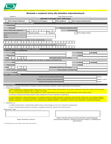 Załącznik nr 1 do Instrukcji wydawania i obsługi kart debetowych w Banku Spółdzielczym w Ostrowi Mazowieckiej Wniosek o wydanie karty dla klientów indywidualnych ……………. Oddział w ………………………………………………. Data złożenia wniosku …………………………………………….. WNIOSEK O WYDANIE KARTY DEBETOWEJ Visa Classic Debetowa Visa payWave MasterCard Paypass Visa niespersonalizowana DANE OSOBOWE POSIADACZA RACHUNKU Imię/imiona Nazwisko Nazwisko panieńskie matki Numer PESEL/data urodzenia* Dokument tożsamości: Obywatelstwo dowód osobisty paszport karta stałego pobytu Seria: Numer Numer rachunku bankowego, do którego ma być wydana karta: Imię i nazwisko do umieszczenia na karcie ( maks. 26 znaków razem ze spacjami) MIEJSCE ZAMIESZKANIA POSIADACZA RACHUNKU 1. Adres w miejscu zamieszkania ulica nr domu Miejscowość Poczta kod - nr lokalu kraj (podać, jeżeli inny niż Polska) 2. Adres korespondencyjny (podać jeżeli inny niż adres w miejscu zamieszkania) ulica nr domu Miejscowość Poczta kod - nr lokalu kraj (podać, jeżeli inny niż Polska) Numer telefonu stacjonarnego Numer telefonu komórkowego e-mail LIMITY TRANSAKCYJNE Dzienny limit transakcji gotówkowych Dzienny limit transakcji bezgotówkowych Dzienny limit transakcji internetowych złotych złotych, w tym złotych OŚWIADCZENIA 1. Oświadczam, że wszystkie dane zawarte w niniejszym wniosku są prawdziwe, kompletne i zostały podane przeze mnie dobrowolnie. 2. Przyjmuję do wiadomości: 1) iż Bank Spółdzielczy z siedzibą w Ostrowi Mazowieckiej, przy ul. 3 Maja 32 będzie administratorem moich danych osobowych w rozumieniu ustawy z dnia 29 sierpnia 1997 r. o ochronie danych osobowych (Dz. U. z 2014 r. poz. 1182); 2) iż dane te przetwarzane będą przez Bank Spółdzielczy w Ostrowi Mazowieckiej w celu wykonania czynności bankowych, których jestem stroną; 3) informację o dobrowolności podania danych, prawie dostępu do nich oraz o możliwości ich poprawiania. 4) iż Bank Spółdzielczy w Ostrowi Mazowieckiej w celu podjęcia niezbędnych działań związanych z zawarciem i wykonywaniem Umowy oraz w celu realizacji ustawowo określonych uprawnień i obowiązków związanych z wykonywaniem czynności bankowych, może przekazać dotyczące mnie dane osobowe do Związku Banków Polskich z siedzibą w Warszawie ul. Kruczkowskiego 8, który prowadzi system BANKOWY REJESTR, w przypadkach, zakresie i celach określonych w ustawie prawo bankowe. 3. Oświadczam, że: 1) zostałem poinformowany o dobrowolności podania danych, prawie dostępu do nich oraz o możliwości ich poprawiania; 2) znam i akceptuję zapisy Regulaminu otwierania i prowadzenia rachunków bankowych dla osób fizycznych. Miejscowość i data………………………………………………………………… Podpis Posiadacza rachunku * W przypadku braku numeru PESEL, należy wpisać datę urodzenia Podpis i stempel funkcyjny pracownika Banku potwierdzającego autentyczność podpisów i zgodność powyższych danych z przedłożonymi dokumentami