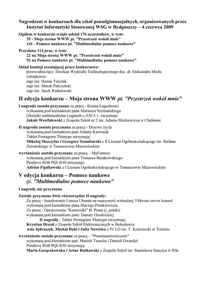Nagrodzeni w konkursach dla szkół ponadgimnazjalnych, organizowanych przez Instytut Informatyki Stosowanej WSG w Bydgoszczy – 4 czerwca 2009 Ogółem w konkursie wzięło udział 176 uczestników, w tym: 35 - Moja strona WWW pt. ”Przestrzeń wokół mnie” 141 - Pomoce naukowe pt. ”Multimedialne pomoce naukowe” Przysłano 114 prac, w tym: 22 na Moja strona WWW pt. ”Przestrzeń wokół mnie” 92 na Pomoce naukowe pt. ”Multimedialne pomoce naukowe” Skład komisji oceniającej prace konkursowe: przewodniczący: Dziekan Wydziału Technologicznego doc. dr Aleksandra Mreła członkowie: mgr inŜ. Hanna TuŜylak mgr inŜ. Marek Pałczyński mgr inŜ. Jacek Rudniewski II edycja konkursu – Moja strona WWW pt. ”Przestrzeń wokół mnie” I nagroda została przyznana za pracę - Kraina Łagodności wykonaną pod kierunkiem pana Mariusza Szymańskiego Głośniki multimedialne Logitech x-530 5.1, otrzymuje: Jakub Westfalewski z Zespołu Szkół nr 2 im. Adama Mickiewicza w Chełmnie II nagroda została przyznana za pracę - Drzewo Ŝycia wykonaną pod kierunkiem pani Jolanty Karwasik Tablet Pentagram Thintype otrzymują: Mikołaj Skoczylas i Grzegorz Szamburski z II Liceum Ogólnokształcącego im. Stefana śeromskiego w Tomaszowie Mazowieckim wyróŜnienie zostało przyznane za pracę – MyFantasy wykonaną pod kierunkiem pana Tomasza Burakowskiego Pendrive 8GB PQI i830 otrzymuje: Adrian Fijałkowski z I Liceum Ogólnokształcącego w Tomaszowie Mazowieckim V edycja konkursu – Pomoce naukowe pt. ”Multimedialne pomoce naukowe” I nagrody nie przyznano Zostały przyznane dwie równorzędne II nagrody: Za pracę - Instalowanie Linuxa Ubuntu na maszynerii wirtualnej VMware server konsol wykonaną pod kierunkiem pana Macieja Pronkiewicza Za pracę - Opracowanie "Kamizelki" B. Prusa (j. polski) wykonaną pod kierunkiem pani: Danuty Grodzickiej II nagrodę - Tablet Pentagram Thintype otrzymują: Krystian Drozd z Zespołu Szkół Elektronicznych w Bolesławcu Asia Jędraszek, Michał Dahl i Julia Nowicka z IV LO im. T. Kościuszki w Toruniu wyróŜnienie zostało przyznane za pracę – "Promieniotwórczość" wykonaną pod kierunkiem pań: Marioli Taracha i Danieli Gwardyś Pendrive 8GB PQI i830 otrzymują: Marta Gorączkowska i Artur Rutkowski z Zespołu Szkół im. Stanisława Staszica w Pile