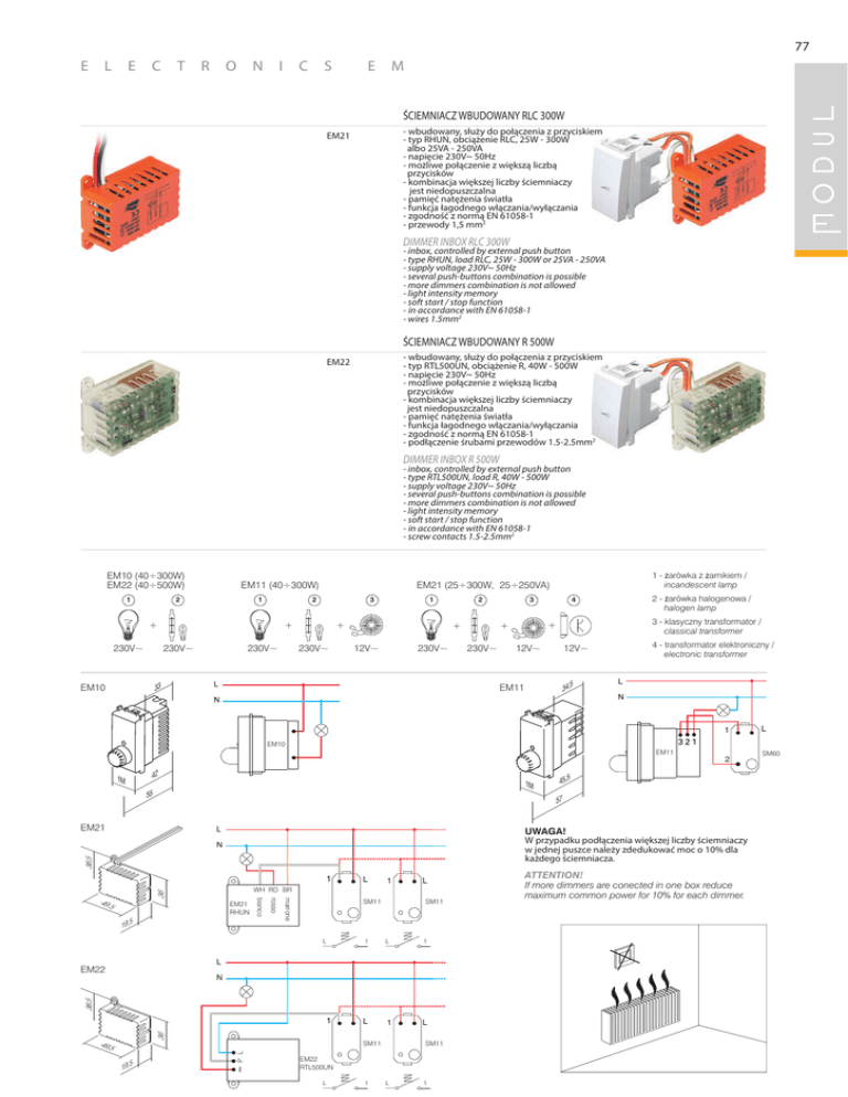 77 E L E C T R O N I C S E M ŚCIEMNIACZ WBUDOWANY RLC 300W - wbudowany, służy do połączenia z przyciskiem - typ RHUN, obciążenie RLC, 25W - 300W albo 25VA - 250VA - napięcie 230V~ 50Hz - możliwe połączenie z większą liczbą przycisków - kombinacja większej liczby ściemniaczy jest niedopuszczalna - pamięć natężenia światła - funkcja łagodnego włączania/wyłączania - zgodność z normą EN 61058-1 - przewody 1,5 mm2 EM21 DIMMER INBOX RLC 300W - inbox, controlled by external push button - type RHUN, load RLC, 25W - 300W or 25VA - 250VA - supply voltage 230V~ 50Hz - several push-buttons combination is possible - more dimmers combination is not allowed - light intensity memory - soft start / stop function - in accordance with EN 61058-1 - wires 1.5mm2 ŚCIEMNIACZ WBUDOWANY R 500W - wbudowany, służy do połączenia z przyciskiem - typ RTL500UN, obciążenie R, 40W - 500W - napięcie 230V~ 50Hz - możliwe połączenie z większą liczbą przycisków - kombinacja większej liczby ściemniaczy jest niedopuszczalna - pamięć natężenia światła - funkcja łagodnego włączania/wyłączania - zgodność z normą EN 61058-1 - podłączenie śrubami przewodów 1.5-2.5mm2 EM22 DIMMER INBOX R 500W - inbox, controlled by external push button - type RTL500UN, load R, 40W - 500W - supply voltage 230V~ 50Hz - several push-buttons combination is possible - more dimmers combination is not allowed - light intensity memory - soft start / stop function - in accordance with EN 61058-1 - screw contacts 1.5-2.5mm2 EM10 (40÷300W) EM22 (40÷500W) 2 1 1 2 230V~ 230V~ EM10 3 + + 230V~ 1 - żarówka z żarnikiem / incandescent lamp EM21 (25÷300W, 25÷250VA) EM11 (40÷300W) 1 + 230V~ + 12V~ 230V~ 3 2 12V~ 12V~ 4 - transformator elektroniczny / electronic transformer 5 34, EM11 33 2 - żarówka halogenowa / halogen lamp 3 - klasyczny transformator / classical transformer + + 230V~ 4 1 EM10 1M EM11 42 1M 55 2 5 45, 57 EM21 38,5 UWAGA! W przypadku podłączenia większej liczby ściemniaczy w jednej puszce należy zdedukować moc o 10% dla każdego ściemniacza. 1 1 36 SM11 marrone 5 19, rosso EM21 RHUN bianco 49,5 L L WH RD BR L SM11 1 L 1 L 1 L 38,5 EM22 36 1 5 19, SM11 ~ P L 49,5 SM11 EM22 RTL500UN L 1 L 1 ATTENTION! If more dimmers are conected in one box reduce maximum common power for 10% for each dimmer. L SM60