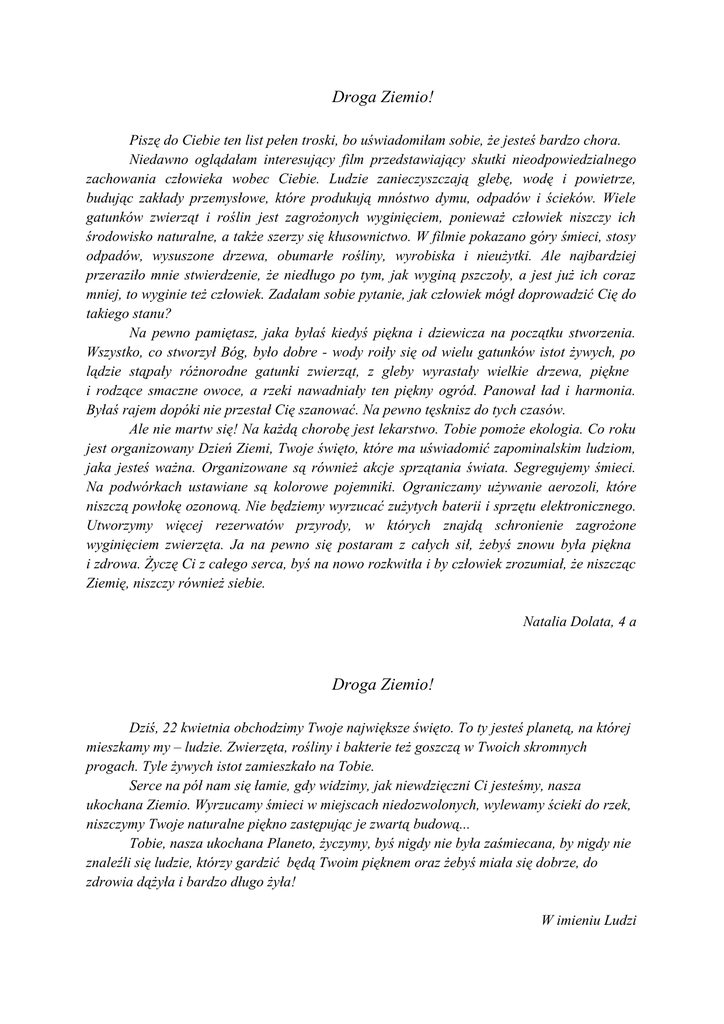 Droga Ziemio! Piszę do Ciebie ten list pełen troski, bo uświadomiłam sobie, że jesteś bardzo chora. Niedawno oglądałam interesujący film przedstawiający skutki nieodpowiedzialnego zachowania człowieka wobec Ciebie. Ludzie zanieczyszczają glebę, wodę i powietrze, budując zakłady przemysłowe, które produkują mnóstwo dymu, odpadów i ścieków. Wiele gatunków zwierząt i roślin jest zagrożonych wyginięciem, ponieważ człowiek niszczy ich środowisko naturalne, a także szerzy się kłusownictwo. W filmie pokazano góry śmieci, stosy odpadów, wysuszone drzewa, obumarłe rośliny, wyrobiska i nieużytki. Ale najbardziej przeraziło mnie stwierdzenie, że niedługo po tym, jak wyginą pszczoły, a jest już ich coraz mniej, to wyginie też człowiek. Zadałam sobie pytanie, jak człowiek mógł doprowadzić Cię do takiego stanu? Na pewno pamiętasz, jaka byłaś kiedyś piękna i dziewicza na początku stworzenia. Wszystko, co stworzył Bóg, było dobre - wody roiły się od wielu gatunków istot żywych, po lądzie stąpały różnorodne gatunki zwierząt, z gleby wyrastały wielkie drzewa, piękne i rodzące smaczne owoce, a rzeki nawadniały ten piękny ogród. Panował ład i harmonia. Byłaś rajem dopóki nie przestał Cię szanować. Na pewno tęsknisz do tych czasów. Ale nie martw się! Na każdą chorobę jest lekarstwo. Tobie pomoże ekologia. Co roku jest organizowany Dzień Ziemi, Twoje święto, które ma uświadomić zapominalskim ludziom, jaka jesteś ważna. Organizowane są również akcje sprzątania świata. Segregujemy śmieci. Na podwórkach ustawiane są kolorowe pojemniki. Ograniczamy używanie aerozoli, które niszczą powłokę ozonową. Nie będziemy wyrzucać zużytych baterii i sprzętu elektronicznego. Utworzymy więcej rezerwatów przyrody, w których znajdą schronienie zagrożone wyginięciem zwierzęta. Ja na pewno się postaram z całych sił, żebyś znowu była piękna i zdrowa. Życzę Ci z całego serca, byś na nowo rozkwitła i by człowiek zrozumiał, że niszcząc Ziemię, niszczy również siebie. Natalia Dolata, 4 a Droga Ziemio! Dziś, 22 kwietnia obchodzimy Twoje największe święto. To ty jesteś planetą, na której mieszkamy my – ludzie. Zwierzęta, rośliny i bakterie też goszczą w Twoich skromnych progach. Tyle żywych istot zamieszkało na Tobie. Serce na pół nam się łamie, gdy widzimy, jak niewdzięczni Ci jesteśmy, nasza ukochana Ziemio. Wyrzucamy śmieci w miejscach niedozwolonych, wylewamy ścieki do rzek, niszczymy Twoje naturalne piękno zastępując je zwartą budową... Tobie, nasza ukochana Planeto, życzymy, byś nigdy nie była zaśmiecana, by nigdy nie znaleźli się ludzie, którzy gardzić będą Twoim pięknem oraz żebyś miała się dobrze, do zdrowia dążyła i bardzo długo żyła! W imieniu Ludzi Julia Gorczyca, 4 b Witaj Droga Ziemio! Jestem Ola, jestem uczennicą IV klasy. Bardzo zaniepokoiła mnie Twoja zła sytuacja. Wiem, że jesteś źle traktowana przez wielu ludzi. Uważam, że jesteś najpiękniejszą planetą. W nocy mogę obserwować gwiazdy na niebie, piękny księżyc. Natomiast w ciągu dnia uwielbiam słuchać śpiewu ptaków, wąchać kwiatki, chodzić czystym brzegiem rzeki, wdychać świeże powietrze. Lubię wszystkie pory roku. Nawet w deszczowe dni jesteś piękna. Uwielbiam słuchać kropli deszczu, obserwować, jak ptaki kąpią się w kałużach. Jednak, żebyś była wciąż tak piękna, należy o Ciebie szczególnie dbać i chronić Cię. Niestety, wielu ludzi tego nie robi. Fabryki zanieczyszczają powietrze dymami, samochody spalinami. Wszystko to powoduje, że lasy, łąki obumierają. Giną zwierzęta i owady. Szczególnie żal jest mi pszczół, jest ich coraz mniej, a ich wyginięcie przyczyni się do braku kwitnących drzew. A przez to nie będziemy mieli tylu pysznych owoców. Uważam, że Ziemia niszczeje w zastraszającym tempie. Powinniśmy zacząć interesować się Twoim złym stanem. Ja osobiście dbam o segregację śmieci, nie używam plastikowych toreb na zakupy, zakręcam wodę podczas mycia zębów, oszczędzam energię elektryczną. Może to niewiele, ale takimi małymi kroczkami można zdziałać bardzo dużo. Musimy pamiętać, że szkodząc Tobie, szkodzimy też sobie.Aby przybliżyć Twoje problemy, bierzemy udział w obchodach Dnia Ziemi. Twoje święto jest świetną okazją do organizowania różnych imprez edukacyjnych. Tego dnia wiele szkół organizuje akcje sprzątania świata, apele, lekcje poświęcone ekologii, festyny, wystawy. Droga Ziemio, Ty jesteś domem dla wszystkich. Mam wielką nadzieję, że wszyscy ludzie zrozumieją, że są odpowiedzialni za Ciebie. Wystarczy tylko szanować zieleń, sadzić drzewa, krzewy i kwiaty, segregować śmieci i składować je w odpowiednich miejscach, oszczędzać wodę, ograniczyć używanie środków chemicznych, na kominy założyć specjalne filtry, samochody myć w miejscach do tego przeznaczonych. Czy to tak wiele w zamian za ratunek Ciebie, Ziemio… Obiecuję, że jeśli ktoś będzie chciał wyrządzić Ci krzywdę, to będę na to reagować. Zwrócę uwagę, porozmawiam, sama będę dawała przykład odpowiednim postępowaniem. Już jestem członkiem Szkolnego Koła Ligi Ochrony Przyrody. Jeszcze raz życzę Ci wszystkiego najlepszego, abyś była zdrowa, łąki lasy pełne były zwierząt i ptaków, a morza i rzeki – czyste. Aleksandra Mrówczyńska, 4 a Droga Ziemio! 27 kwietnia jest Twoje święto, ale w tym dniu nie jesteś radosna. Spowodowane jest to chyba tym, że wiele dzieci i dorosłych nie szanuje Cię. Nie segregują śmieci, śmiecą w lesie, wypalają trawy, zanieczyszczają wodę i powietrze. Nie rozumiem tych ludzi, ja widzę jaka Ty jesteś piękna. Uwielbiam chodzić do lasu, podziwiać Cię - słuchać śpiewu ptaków, moczyć nogi w czystym strumyku. Mimo, że ludzie nie dbają o Ciebie, Ty nie poddajesz się i czekasz, aż ludzie zrozumieją swój bł