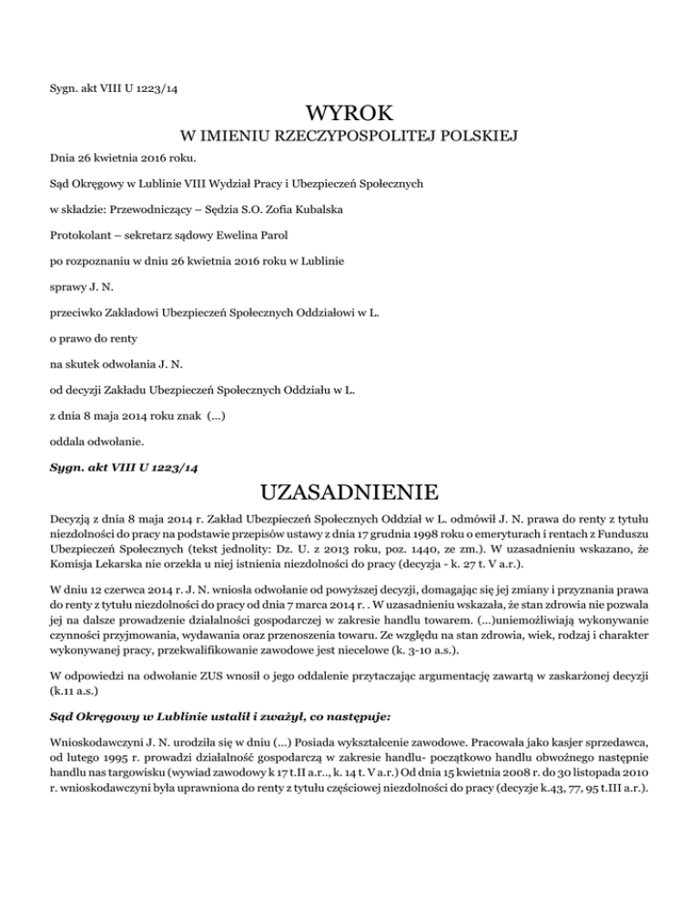 Sygn. akt VIII U 1223/14 WYROK W IMIENIU RZECZYPOSPOLITEJ POLSKIEJ Dnia 26 kwietnia 2016 roku. Sąd Okręgowy w Lublinie VIII Wydział Pracy i Ubezpieczeń Społecznych w składzie: Przewodniczący – Sędzia S.O. Zofia Kubalska Protokolant – sekretarz sądowy Ewelina Parol po rozpoznaniu w dniu 26 kwietnia 2016 roku w Lublinie sprawy J. N. przeciwko Zakładowi Ubezpieczeń Społecznych Oddziałowi w L. o prawo do renty na skutek odwołania J. N. od decyzji Zakładu Ubezpieczeń Społecznych Oddziału w L. z dnia 8 maja 2014 roku znak (...) oddala odwołanie. Sygn. akt VIII U 1223/14 UZASADNIENIE Decyzją z dnia 8 maja 2014 r. Zakład Ubezpieczeń Społecznych Oddział w L. odmówił J. N. prawa do renty z tytułu niezdolności do pracy na podstawie przepisów ustawy z dnia 17 grudnia 1998 roku o emeryturach i rentach z Funduszu Ubezpieczeń Społecznych (tekst jednolity: Dz. U. z 2013 roku, poz. 1440, ze zm.). W uzasadnieniu wskazano, że Komisja Lekarska nie orzekła u niej istnienia niezdolności do pracy (decyzja - k. 27 t. V a.r.). W dniu 12 czerwca 2014 r. J. N. wniosła odwołanie od powyższej decyzji, domagając się jej zmiany i przyznania prawa do renty z tytułu niezdolności do pracy od dnia 7 marca 2014 r. . W uzasadnieniu wskazała, że stan zdrowia nie pozwala jej na dalsze prowadzenie działalności gospodarczej w zakresie handlu towarem. (...)uniemożliwiają wykonywanie czynności przyjmowania, wydawania oraz przenoszenia towaru. Ze względu na stan zdrowia, wiek, rodzaj i charakter wykonywanej pracy, przekwalifikowanie zawodowe jest niecelowe (k. 3-10 a.s.). W odpowiedzi na odwołanie ZUS wnosił o jego oddalenie przytaczając argumentację zawartą w zaskarżonej decyzji (k.11 a.s.) Sąd Okręgowy w Lublinie ustalił i zważył, co następuje: Wnioskodawczyni J. N. urodziła się w dniu (...) Posiada wykształcenie zawodowe. Pracowała jako kasjer sprzedawca, od lutego 1995 r. prowadzi działalność gospodarczą w zakresie handlu- początkowo handlu obwoźnego następnie handlu nas targowisku (wywiad zawodowy k 17 t.II a.r.., k. 14 t. V a.r.) Od dnia 15 kwietnia 2008 r. do 30 listopada 2010 r. wnioskodawczyni była uprawniona do renty z tytułu częściowej niezdolności do pracy (decyzje k.43, 77, 95 t.III a.r.). W dniu 7 marca 2014 roku J. N. wniosła o ustalenie prawa do renty z tytułu niezdolności do pracy (k. 1-4 t.V a.r.). Organ rentowy ustalił, ze wnioskodawczyni legitymuje się okresami składkowymi i nieskładkowymi w wymiarze łącznym 29 lat, 8 miesięcy i 3 dni (karta przebiegu zatrudnienia - k. 25-26 t.V a.r.). Lekarz Orzecznik w dniu 26 marca 2014 roku rozpoznał:(...)Uznał, że wnioskodawczyni jest zdolna do pracy (rozpoznanie – k.14-15 dokumentacji medycznej, orzeczenie - k. 15 t.V a.r.). Komisja Lekarska Zakładu Ubezpieczeń Społecznych, po rozpoznaniu sprzeciwu wnioskodawczyni od orzeczenia Lekarza Orzecznika i stwierdzeniu okresowej(...) uznał badaną za zdolną do pracy (rozpoznanie - k. 16-17 dokumentacji medycznej, orzeczenie - k. 24 t. V a.r.). Na tej podstawie organ rentowy wydał w dniu 8 maja 2014 r. zaskarżoną w niniejszym postępowaniu decyzję (k. 27 t.V a.r.). Biegli sądowi lekarze specjaliści neurolog i chirurg naczyniowy w opinii z dnia 16 września 2014 roku rozpoznali u wnioskodawczyni: (...) i uznali ją za zdolną do pracy. Biegły sądowy lekarz specjalista neurolog stwierdził, że wykonane badanie MR kręgosłupa szyjnego wykazało obecność (...)Nie stwierdzono nawrotów (...) wymagających hospitalizacji. Obecnie w badaniu neurologicznym nie stwierdza się objawów ogniskowego uszkodzenia (...) i objawów(...)Istnieje jedynie(...) Powyższe rozpoznanie wskazuje na poprawę stanu neurologicznego badanej. Niezdolności do pracy nie sprowadzają także(...) W ocenie biegłych opiniowana jest zdolna do pracy (opinia – k. 21-22 a.s.). Pełnomocnik wnioskodawczyni nie zgodziła się z opinią biegłych, nie składając do niej żadnych merytorycznych zarzutów. Złożyła nową dokumentację lekarską- wynik badania RM z 7 maja 2014 r, wnosząc o dopuszczenie dowodu z opinii biegłych neurochirurga i specjalisty medycyny pracy (k. 36 v. a.s.). Sąd dopuścił dowód z opinii biegłych specjalisty neurochirurga i specjalisty medycyny oraz opinii uzupełniającej biegłego specjalisty neurologa, któremu zlecił wydanie opinii po zapoznaniu się z nową złożoną do akt dokumentacją medyczną (k. 36 v-37a.s.). W opinii uzupełniającej z dnia 9 lipca 2015 r. biegły specjalista neurolog w całości podtrzymał opinię główną z dnia 16 września 2014 r.. Podniósł, iż przedstawiona przez opiniowaną dokumentacja medyczna -wynik badania MR z dnia 7 maja 2014 r., w którym stwierdzono (...) zawiera informacje na temat jednostek chorobowych zgodnych z przedstawionym uprzednio przez biegłego rozpoznaniem, bowiem powyższe zmiany radiologiczne zostały już uwzględnione przy wydawaniu opinii głównej. Wnioskodawczyni nie jest niezdolna do pracy (k. 39 a.s.) Biegli sądowi lekarze specjaliści neurochirurg i specjalista medycyny pracy w opinii z dnia 2 listopada 2015 r. rozpoznali u J. N. (...)i uznali ją za zdolną do pracy. Powyższego rozpoznania dokonali po zbadaniu odwołującej się i przeanalizowaniu całości dokumentacji medycznej, w tym również badania MR kręgosłupa z 7 maja 2014 r.. Podnieśli, że stwierdzone schorzenia są przeciwskazaniem do ciężkiej pracy fizycznej- dźwigania , nie stanowią jednak obecnie przeciwskazań do pracy zgodnej z kwalifikacjami zawodowymi opiniowanej. Zaostrzenie dolegliwości może być leczone w ramach czasowej niezdolności do pracy. Z tych względów biegli zgodzili się z opinią lekarzy orzeczników organu rentowego oraz wydanymi w sprawie opiniami biegłych (opinia – k. 50-51a.s.). Pełnomocnik wnioskodawczyni złożyła wniosek o dopuszczenie i przeprowadzenie dowodu z opinii biegłego lekarza ortopedy w celu stwierdzenia czy rozpoznane schorzenia kręg