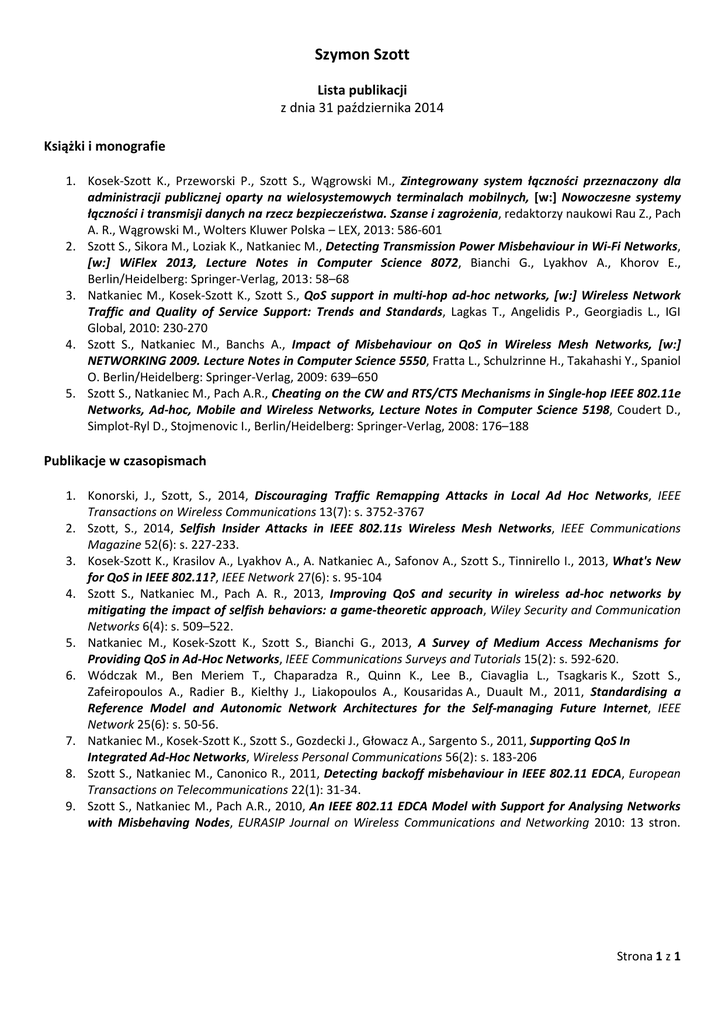 Szymon Szott Lista publikacji z dnia 31 października 2014 Książki i monografie 1. Kosek-Szott K., Przeworski P., Szott S., Wągrowski M., Zintegrowany system łączności przeznaczony dla administracji publicznej oparty na wielosystemowych terminalach mobilnych, [w:] Nowoczesne systemy łączności i transmisji danych na rzecz bezpieczeństwa. Szanse i zagrożenia, redaktorzy naukowi Rau Z., Pach A. R., Wągrowski M., Wolters Kluwer Polska – LEX, 2013: 586-601 2. Szott S., Sikora M., Loziak K., Natkaniec M., Detecting Transmission Power Misbehaviour in Wi-Fi Networks, [w:] WiFlex 2013, Lecture Notes in Computer Science 8072, Bianchi G., Lyakhov A., Khorov E., Berlin/Heidelberg: Springer-Verlag, 2013: 58–68 3. Natkaniec M., Kosek-Szott K., Szott S., QoS support in multi-hop ad-hoc networks, [w:] Wireless Network Traffic and Quality of Service Support: Trends and Standards, Lagkas T., Angelidis P., Georgiadis L., IGI Global, 2010: 230-270 4. Szott S., Natkaniec M., Banchs A., Impact of Misbehaviour on QoS in Wireless Mesh Networks, [w:] NETWORKING 2009. Lecture Notes in Computer Science 5550, Fratta L., Schulzrinne H., Takahashi Y., Spaniol O. Berlin/Heidelberg: Springer-Verlag, 2009: 639–650 5. Szott S., Natkaniec M., Pach A.R., Cheating on the CW and RTS/CTS Mechanisms in Single-hop IEEE 802.11e Networks, Ad-hoc, Mobile and Wireless Networks, Lecture Notes in Computer Science 5198, Coudert D., Simplot-Ryl D., Stojmenovic I., Berlin/Heidelberg: Springer-Verlag, 2008: 176–188 Publikacje w czasopismach 1. Konorski, J., Szott, S., 2014, Discouraging Traffic Remapping Attacks in Local Ad Hoc Networks, IEEE Transactions on Wireless Communications 13(7): s. 3752-3767 2. Szott, S., 2014, Selfish Insider Attacks in IEEE 802.11s Wireless Mesh Networks, IEEE Communications Magazine 52(6): s. 227-233. 3. Kosek-Szott K., Krasilov A., Lyakhov A., A. Natkaniec A., Safonov A., Szott S., Tinnirello I., 2013, What's New for QoS in IEEE 802.11?, IEEE Network 27(6): s. 95-104 4. Szott S., Natkaniec M., Pach A. R., 2013, Improving QoS and security in wireless ad-hoc networks by mitigating the impact of selfish behaviors: a game-theoretic approach, Wiley Security and Communication Networks 6(4): s. 509–522. 5. Natkaniec M., Kosek-Szott K., Szott S., Bianchi G., 2013, A Survey of Medium Access Mechanisms for Providing QoS in Ad-Hoc Networks, IEEE Communications Surveys and Tutorials 15(2): s. 592-620. 6. Wódczak M., Ben Meriem T., Chaparadza R., Quinn K., Lee B., Ciavaglia L., Tsagkaris K., Szott S., Zafeiropoulos A., Radier B., Kielthy J., Liakopoulos A., Kousaridas A., Duault M., 2011, Standardising a Reference Model and Autonomic Network Architectures for the Self-managing Future Internet, IEEE Network 25(6): s. 50-56. 7. Natkaniec M., Kosek-Szott K., Szott S., Gozdecki J., Głowacz A., Sargento S., 2011, Supporting QoS In Integrated Ad-Hoc Networks, Wireless Personal Communications 56(2): s. 183-206 8. Szott S., Natkaniec M., Canonico R., 2011, Detecting backoff misbehaviour in IEEE 802.11 EDCA, European Transactions on Telecommunications 22(1): 31-34. 9. Szott S., Natkaniec M., Pach A.R., 2010, An IEEE 802.11 EDCA Model with Support for Analysing Networks with Misbehaving Nodes, EURASIP Journal on Wireless Communications and Networking 2010: 13 stron. Strona 1 z 1
