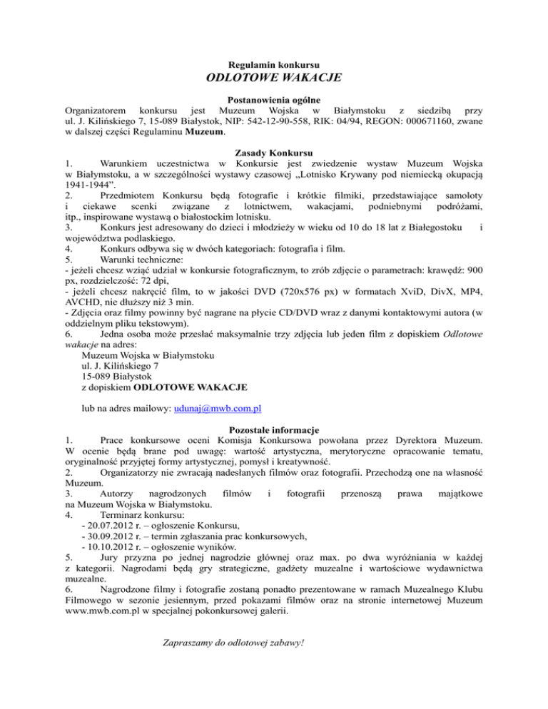 Regulamin konkursu ODLOTOWE WAKACJE Postanowienia ogólne Organizatorem konkursu jest Muzeum Wojska w Białymstoku z siedzibą przy ul. J. Kilińskiego 7, 15-089 Białystok, NIP: 542-12-90-558, RIK: 04/94, REGON: 000671160, zwane w dalszej części Regulaminu Muzeum. Zasady Konkursu 1. Warunkiem uczestnictwa w Konkursie jest zwiedzenie wystaw Muzeum Wojska w Białymstoku, a w szczególności wystawy czasowej „Lotnisko Krywany pod niemiecką okupacją 1941-1944”. 2. Przedmiotem Konkursu będą fotografie i krótkie filmiki, przedstawiające samoloty i ciekawe scenki związane z lotnictwem, wakacjami, podniebnymi podróżami, itp., inspirowane wystawą o białostockim lotnisku. 3. Konkurs jest adresowany do dzieci i młodzieży w wieku od 10 do 18 lat z Białegostoku i województwa podlaskiego. 4. Konkurs odbywa się w dwóch kategoriach: fotografia i film. 5. Warunki techniczne: - jeżeli chcesz wziąć udział w konkursie fotograficznym, to zrób zdjęcie o parametrach: krawędź: 900 px, rozdzielczość: 72 dpi, - jeżeli chcesz nakręcić film, to w jakości DVD (720x576 px) w formatach XviD, DivX, MP4, AVCHD, nie dłuższy niż 3 min. - Zdjęcia oraz filmy powinny być nagrane na płycie CD/DVD wraz z danymi kontaktowymi autora (w oddzielnym pliku tekstowym). 6. Jedna osoba może przesłać maksymalnie trzy zdjęcia lub jeden film z dopiskiem Odlotowe wakacje na adres: Muzeum Wojska w Białymstoku ul. J. Kilińskiego 7 15-089 Białystok z dopiskiem ODLOTOWE WAKACJE lub na adres mailowy: [email protected] Pozostałe informacje 1. Prace konkursowe oceni Komisja Konkursowa powołana przez Dyrektora Muzeum. W ocenie będą brane pod uwagę: wartość artystyczna, merytoryczne opracowanie tematu, oryginalność przyjętej formy artystycznej, pomysł i kreatywność. 2. Organizatorzy nie zwracają nadesłanych filmów oraz fotografii. Przechodzą one na własność Muzeum. 3. Autorzy nagrodzonych filmów i fotografii przenoszą prawa majątkowe na Muzeum Wojska w Białymstoku. 4. Terminarz konkursu: - 20.07.2012 r. – ogłoszenie Konkursu, - 30.09.2012 r. – termin zgłaszania prac konkursowych, - 10.10.2012 r. – ogłoszenie wyników. 5. Jury przyzna po jednej nagrodzie głównej oraz max. po dwa wyróżniania w każdej z kategorii. Nagrodami będą gry strategiczne, gadżety muzealne i wartościowe wydawnictwa muzealne. 6. Nagrodzone filmy i fotografie zostaną ponadto prezentowane w ramach Muzealnego Klubu Filmowego w sezonie jesiennym, przed pokazami filmów oraz na stronie internetowej Muzeum www.mwb.com.pl w specjalnej pokonkursowej galerii. Zapraszamy do odlotowej zabawy!