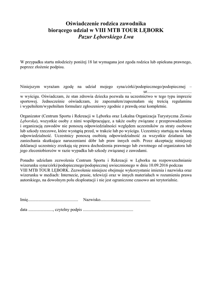 Oświadczenie rodzica zawodnika biorącego udział w VIII MTB TOUR LĘBORK Pazur Lęborskiego Lwa W przypadku startu młodzieży poniżej 18 lat wymagana jest zgoda rodzica lub opiekuna prawnego, poprzez złożenie podpisu. Niniejszym wyrażam zgodę na udział mojego syna/córki/podopiecznego/podopiecznej – ......................................................................................................., ur.......................................... w wyścigu. Oświadczam, że stan zdrowia dziecka pozwala na uczestnictwo w tego typu imprezie sportowej. Jednocześnie oświadczam, że zapoznałem/zapoznałam się treścią regulaminu i wypełniłem/wypełniłam formularz zgłoszeniowy zgodnie z prawdą oraz kompletnie. Organizator (Centrum Sportu i Rekreacji w Lęborku oraz Lokalna Organizacja Turystyczna Ziemia Lęborska), wszystkie osoby z nimi współpracujące, a także osoby związane z przeprowadzeniem i organizacją zawodów nie ponoszą odpowiedzialności względem uczestników za straty osobowe lub szkody rzeczowe, które wystąpią przed, w trakcie lub po wyścigu. Uczestnicy startują na własną odpowiedzialność. Uczestnicy ponoszą osobistą odpowiedzialność za wszystkie działania lub zaniechania skutkujące naruszeniami dóbr lub praw innych osób. Przez akceptację niniejszej deklaracji uczestnicy zrzekają się prawa dochodzenia prawnego lub zwrotnego od organizatora lub jego zleceniobiorców w razie wypadku lub szkody związanej z zawodami. Ponadto udzielam zezwolenia Centrum Sportu i Rekreacji w Lęborku na rozpowszechnianie wizerunku syna/córki/podopiecznego/podopiecznej uwiecznionego w dniu 10.09.2016 podczas VIII MTB TOUR LĘBORK. Zezwolenie niniejsze obejmuje wykorzystanie imienia i nazwiska oraz wizerunku w mediach: Internecie, prasie, telewizji oraz w innych materiałach w rozumieniu prawa autorskiego, na dowolnym polu eksploatacji i nie jest ograniczone czasowo ani terytorialnie. Imię............................................... Nazwisko............................................... data ......................., czytelny podpis ...............................................