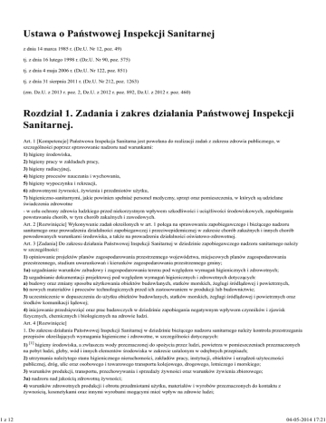 Ustawa o Państwowej Inspekcji Sanitarnej z dnia 14 marca 1985 r. (Dz.U. Nr 12, poz. 49) tj. z dnia 16 lutego 1998 r. (Dz.U. Nr 90, poz. 575) tj. z dnia 4 maja 2006 r. (Dz.U. Nr 122, poz. 851) tj. z dnia 31 sierpnia 2011 r. (Dz.U. Nr 212, poz. 1263) (zm. Dz.U. z 2013 r. poz. 2, Dz.U. z 2012 r. poz. 892, Dz.U. z 2012 r. poz. 460) Rozdział 1. Zadania i zakres działania Państwowej Inspekcji Sanitarnej. Art. 1 [Kompetencje] Państwowa Inspekcja Sanitarna jest powołana do realizacji zadań z zakresu zdrowia publicznego, w szczególności poprzez sprawowanie nadzoru nad warunkami: 1) higieny środowiska, 2) higieny pracy w zakładach pracy, 3) higieny radiacyjnej, 4) higieny procesów nauczania i wychowania, 5) higieny wypoczynku i rekreacji, 6) zdrowotnymi żywności, żywienia i przedmiotów użytku, 7) higieniczno-sanitarnymi, jakie powinien spełniać personel medyczny, sprzęt oraz pomieszczenia, w których są udzielane świadczenia zdrowotne - w celu ochrony zdrowia ludzkiego przed niekorzystnym wpływem szkodliwości i uciążliwości środowiskowych, zapobiegania powstawaniu chorób, w tym chorób zakaźnych i zawodowych. Art. 2 [Rozwinięcie] Wykonywanie zadań określonych w art. 1 polega na sprawowaniu zapobiegawczego i bieżącego nadzoru sanitarnego oraz prowadzeniu działalności zapobiegawczej i przeciwepidemicznej w zakresie chorób zakaźnych i innych chorób powodowanych warunkami środowiska, a także na prowadzeniu działalności oświatowo-zdrowotnej. Art. 3 [Zadania] Do zakresu działania Państwowej Inspekcji Sanitarnej w dziedzinie zapobiegawczego nadzoru sanitarnego należy w szczególności: 1) opiniowanie projektów planów zagospodarowania przestrzennego województwa, miejscowych planów zagospodarowania przestrzennego, studium uwarunkowań i kierunków zagospodarowania przestrzennego gminy; 1a) uzgadnianie warunków zabudowy i zagospodarowania terenu pod względem wymagań higienicznych i zdrowotnych; 2) uzgadnianie dokumentacji projektowej pod względem wymagań higienicznych i zdrowotnych dotyczących: a) budowy oraz zmiany sposobu użytkowania obiektów budowlanych, statków morskich, żeglugi śródlądowej i powietrznych, b) nowych materiałów i procesów technologicznych przed ich zastosowaniem w produkcji lub budownictwie; 3) uczestniczenie w dopuszczeniu do użytku obiektów budowlanych, statków morskich, żeglugi śródlądowej i powietrznych oraz środków komunikacji lądowej; 4) inicjowanie przedsięwzięć oraz prac badawczych w dziedzinie zapobiegania negatywnym wpływom czynników i zjawisk fizycznych, chemicznych i biologicznych na zdrowie ludzi. Art. 4 [Rozwinięcie] 1. Do zakresu działania Państwowej Inspekcji Sanitarnej w dziedzinie bieżącego nadzoru sanitarnego należy kontrola przestrzegania przepisów określających wymagania higieniczne i zdrowotne, w szczególności dotyczących: 1) [1] higieny środowiska, a zwłaszcza wody przeznaczonej do spożycia przez ludzi, powietrza w pomieszczeniach przeznaczonych na pobyt ludzi, gleby, wód i innych elementów środowiska w zakresie ustalonym w odrębnych przepisach; 2) utrzymania należytego stanu higienicznego nieruchomości, zakładów pracy, instytucji, obiektów i urządzeń użyteczności publicznej, dróg, ulic oraz osobowego i towarowego transportu kolejowego, drogowego, lotniczego i morskiego; 3) warunków produkcji, transportu, przechowywania i sprzedaży żywności oraz warunków żywienia zbiorowego; 3a) nadzoru nad jakością zdrowotną żywności; 4) warunków zdrowotnych produkcji i obrotu przedmiotami użytku, materiałów i wyrobów przeznaczonych do kontaktu z żywnością, kosmetykami oraz innymi wyrobami mogącymi mieć wpływ na zdrowie ludzi; 1 z 12 04-05-2014 17:21 5) warunków zdrowotnych środowiska pracy, a zwłaszcza zapobiegania powstawaniu chorób zawodowych i innych chorób związanych z warunkami pracy; 6) higieny pomieszczeń i wymagań w stosunku do sprzętu używanego w szkołach i innych placówkach oświatowowychowawczych, szkołach wyższych oraz w ośrodkach wypoczynku; 7) higieny procesów nauczania; 8) przestrzegania przez producentów, importerów, osoby wprowadzające do obrotu, stosujące lub eksportujące substancje chemiczne, ich mieszaniny lub wyroby w rozumieniu przepisów ustawy z dnia 25 lutego 2011 r. o substancjach chemicznych i ich mieszaninach (Dz.U. Nr 63, poz. 322) obowiązków wynikających z tej ustawy oraz z rozporządzeń Wspólnot Europejskich w niej wymienionych; 8a) (uchylony) 8b) (uchylony) 9) przestrzegania przez podmioty wprowadzające do obrotu prekursory kategorii 2 i 3 obowiązków wynikających z ustawy z dnia 29 lipca 2005 r. o przeciwdziałaniu narkomanii (Dz.U. Nr 179, poz. 1485, z późn. zm.[2]), rozporządzenia (WE) Parlamentu Europejskiego i Rady nr 273/2004 z dnia 11 lutego 2004 r. w sprawie prekursorów narkotykowych oraz rozporządzenia (WE) Rady nr 111/2005 z dnia 22 grudnia 2004 r. określającego zasady nadzorowania handlu prekursorami narkotyków pomiędzy Wspólnotą a państwami trzecimi; 10) wymagań określonych w przepisach o zawartości niektórych substancji w dymie papierosowym. 2. Do zakresu działania Państwowej Inspekcji Sanitarnej w dziedzinie bieżącego nadzoru sanitarnego należy również kontrola przestrzegania przepisów dotyczących wprowadzania do obrotu produktów biobójczych i substancji czynnych oraz ich stosowania w działalności zawodowej. Art. 5 [Rozwinięcie] Do zakresu działania Państwowej Inspekcji Sanitarnej w dziedzinie zapobiegania i zwalczania chorób, o których mowa w art. 2, należy: 1) dokonywanie analiz i ocen epidemiologicznych; 2) opracowywanie programów i planów działalności zapobiegawczej i przeciwepidemicznej, przekazywanie ich do realizacji podmiotom leczniczym w rozumieniu przepisów o działalności leczniczej oraz kontrola realizacji tych programów i planów; 3) ustalanie zakresu i terminów szczepień ochronnych oraz sprawowanie nadzoru w tym zakre