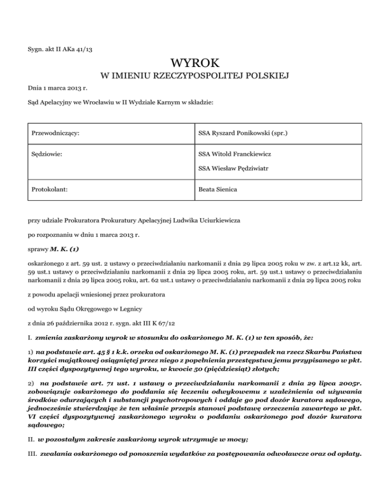 Sygn. akt II AKa 41/13 WYROK W IMIENIU RZECZYPOSPOLITEJ POLSKIEJ Dnia 1 marca 2013 r. Sąd Apelacyjny we Wrocławiu w II Wydziale Karnym w składzie: Przewodniczący: SSA Ryszard Ponikowski (spr.) Sędziowie: SSA Witold Franckiewicz SSA Wiesław Pędziwiatr Protokolant: Beata Sienica przy udziale Prokuratora Prokuratury Apelacyjnej Ludwika Uciurkiewicza po rozpoznaniu w dniu 1 marca 2013 r. sprawy M. K. (1) oskarżonego z art. 59 ust. 2 ustawy o przeciwdziałaniu narkomanii z dnia 29 lipca 2005 roku w zw. z art.12 kk, art. 59 ust.1 ustawy o przeciwdziałaniu narkomanii z dnia 29 lipca 2005 roku, art. 59 ust.1 ustawy o przeciwdziałaniu narkomanii z dnia 29 lipca 2005 roku, art. 62 ust.1 ustawy o przeciwdziałaniu narkomanii z dnia 29 lipca 2005 roku z powodu apelacji wniesionej przez prokuratora od wyroku Sądu Okręgowego w Legnicy z dnia 26 października 2012 r. sygn. akt III K 67/12 I. zmienia zaskarżony wyrok w stosunku do oskarżonego M. K. (1) w ten sposób, że: 1) na podstawie art. 45 § 1 k.k. orzeka od oskarżonego M. K. (1) przepadek na rzecz Skarbu Państwa korzyści majątkowej osiągniętej przez niego z popełnienia przestępstwa jemu przypisanego w pkt. III części dyspozytywnej tego wyroku, w kwocie 50 (pięćdziesiąt) złotych; 2) na podstawie art. 71 ust. 1 ustawy o przeciwdziałaniu narkomanii z dnia 29 lipca 2005r. zobowiązuje oskarżonego do poddania się leczeniu odwykowemu z uzależnienia od używania środków odurzających i substancji psychotropowych i oddaje go pod dozór kuratora sądowego, jednocześnie stwierdzając że ten właśnie przepis stanowi podstawę orzeczenia zawartego w pkt. VI części dyspozytywnej zaskarżonego wyroku o poddaniu oskarżonego pod dozór kuratora sądowego; II. w pozostałym zakresie zaskarżony wyrok utrzymuje w mocy; III. zwalania oskarżonego od ponoszenia wydatków za postępowania odwoławcze oraz od opłaty. UZASADNIENIE Sąd Okręgowy we Wrocławiu po rozpoznaniu sprawy M. K. (1) oskarżonego o to, że: I. w okresie od czerwca 2011r. do początku września 2011r. w G. w wykonaniu z góry powziętego zamiaru, udzielił małoletniemu J. P., lat 16, w zamian za korzyść majątkową w kwocie nie mniejszej niż 500 zł narkotyków w postaci marihuany o łącznej wadze nie mniejszej niż 25 gramów, tj. o czyn z art. 59 ust. 2 ustawy o przeciwdziałaniu narkomanii z dnia 29.07.2005r.w zw. z art. 12 kk. II. w pierwszej połowie stycznia 2012r. w G. udzielił A. M., w zamian za korzyść majątkową w kwocie nie mniejszej niż 90 zł narkotyków w postaci marihuany o łącznej wadze nie mniejszej niż 3 gramy tj. o czyn z art. 59 ust. 1 ustawy o przeciwdziałaniu narkomanii z dnia 29.07.2005r. III. w okresie od października do listopada 2011r. w G. udzielił M. K. (2), w zamian za korzyść majątkową w kwocie nie mniejszej niż 50 zł narkotyków w postaci marihuany o łącznej wadze nie mniejszej niż 1,5 grama tj. o czyn z art. 59 ust. 1 ustawy o przeciwdziałaniu narkomanii z dnia 29.07.2005r. IV. w dniu 30 grudnia 2011r. w G. wspólnie i w porozumieniu z A. W., M. K. (2), M. K. (3) i T. J. posiadał wbrew przepisom ustawy środek odurzający w postaci marihuany o wadze 43,16 gramów tj. o przestępstwo z art. 62 ust. 1 ustawy o przeciwdziałaniu narkomanii z dnia 29.07.2005r. - wyrokiem z dnia 26 października 2012r. podjął rozstrzygnięcia następującej treści: I. uniewinnił oskarżonego M. K. (1) od popełnienia czynów opisanych w punktach I i II części wstępnej wyroku i kosztami w tej części obciążył Skarb Państwa, II. uznał oskarżonego M. K. (1) za winnego popełnienia czynu opisanego w punkcie III części wstępnej wyroku z tym ustaleniem, iż stanowi on wypadek mniejszej wagi z art. 59 ust. 3 ustawy o przeciwdziałaniu narkomanii z dnia 29 lipca 2005r., i za czyn ten na podstawie art. 59 ust. 3 ustawy z dnia 29 lipca 2005r. o przeciwdziałaniu narkomanii wymierzył mu karę 6 (sześciu) miesięcy pozbawienia wolności, III. uznał oskarżonego M. K. (1) za winnego popełnienia czynu opisanego w punkcie IV części wstępnej wyroku stanowiącego przestępstwo z art. 62 ust. 1 ustawy z dnia 29 lipca 2005r. o przeciwdziałaniu narkomanii i za czyn ten na podstawie art. 62 ust. 1 ustawy z dnia 29 lipca 2005r. o przeciwdziałaniu narkomanii wymierzył mu karę 10 (dziesięciu) miesięcy pozbawienia wolności, IV. na podstawie art. 85 kk i art. 86 § 1 kk połączył oskarżonemu M. K. (1) orzeczone wobec niego kary pozbawienia wolności i wymierzył mu karę łączną 1 (jednego) roku pozbawienia wolności, V. na podstawie art. 69 § 1 i 2 kk oraz art. 70 § 2 kk wykonanie orzeczonej wobec oskarżonego M. K. (1) kary łącznej pozbawienia wolności warunkowo zawiesił na okres próby 4 (czterech) lat, VI. na podstawie art. 73 § 2 kk w okresie próby oddał oskarżonego M. K. (1) pod dozór kuratora sądowego, VII. na podstawie art. 70 ust. 1 i 2 ustawy z dnia 29 lipca 2005r. o przeciwdziałaniu narkomanii orzekł przepadek przez zniszczenie dowodów rzeczowych wyszczególnionych w wykazie dowodów rzeczowych znajdującym się w aktach sprawy na k. 23 pod pozycjami: 1, 2, 7, 9, 10, 11, 15, 16 i 17. VIII. zasądził od Skarbu Państwa na rzecz adw. M. S. Kancelaria Adwokacka w L. kwotę 1.034,20 złotych w tym VAT tytułem nieopłaconej, a udzielonej oskarżonemu obrony z urzędu, IX. na podstawie art. 624 § 1 kpk zwolnił oskarżonego M. K. (1) od ponoszenia kosztów sądowych zaliczając je na rachunek Skarbu Państwa. Powyższy wyrok Sądu Okręgowego zaskarżył prokurator w części dotyczącej orzeczenia o karze na niekorzyść M. K. (1), wyrokowi temu zarzucając: • „obrazę przepisu art.45 § 1 k.k. poprzez nieorzeczenie obligatoryjnego przepadku korzyści majątkowej uzyskanej z popełnienia przestępstwa z art. 59 ust. 1 ustawy o przeciwdziałaniu narkomanii opisanego w pkt. 1 III części wstępnej wyroku; • obrazę przepisu art. 71 ust. 1 ustawy o przeciwdziałaniu narkomanii z dn