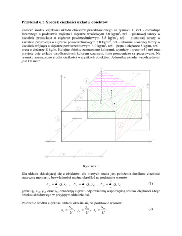 3U]\NáDGURGHNFL *NRFLXNáDGXRELHNWyZ =QDOH(ü URGHN FL *NRFL XNáDGX RELHNWyZ SU]HGVWDZLRQHJR QD U\VXQNX QU RVWURVáXSD 3 IRUHPQHJR R SRGVWDZLH WUyMNWD L FL *DU]H ZáDFLZ\P NJP 2 NV]WDáFLH SURVWRNWD R FL *DU]H SRZLHU]FKQLRZ\P NJP , nr2 – pionowej tarczy w , nr3 – pionowej tarczy w 2 NV]WDáFLHSURVWRNWDRFL *DU]HSRZLHU]FKQLRZ\PNJP QU±XNRQLHXáR*RQHMWDUF]\Z 2 NV]WDáFLHWUyMNWDRFL *DU]HSRZLHU]FKQLRZ\PNJP QU±SU WDRFL *DU]H kg/m, nr6 – SU WDRFL *DU]HNJP.ROHMQHRELHNW\]D]QDF]RQRNRORUDPLZ\PLDU\LSU W\QULQURUD] SU]\M WH RVLH XNáDGX ZVSyáU] GQ\FK NRORUHP F]DUQ\P OLQLH SRPRFQLF]H V SU]HU\ZDQH 1D U\VXQNX ]D]QDF]RQR URGNL FL *NRFL ZV]\VWNLFK RELHNWyZ -HGQRVWN XNáDGX ZVSyáU] GQ\FK jest 1.0 metr. Rysunek 1 'OD XNáDGX VNáDGDMFHM VL ] RELHNWyZ GOD NWyU\FK ]QDQH MHVW SRáR*HQLH URGNyZ FL *NRFL VWDW\F]QHPRPHQW\EH]ZáDGQRFLPR*QDRNUHODüQDSRGVWDZLHZ]RUyZ Q 6 \] = ∑4 L = L Q [ & 6 [] = ∑4 L L = Q \ & 6 [\ = ∑4 L = L ] & (1) gdzie Qi, xCi, yCi oraz zCiR]QDF]DMFL *DULRGSRZLHGQLZVSyáU] GQURGNDFL *NRFLLWHJR RELHNWXVNáDGRZHJRZSU]\M W\PXNáDG]LHRVL 3RáR*HQLHURGNDFL *NRFLXNáDGXRNUHODVL QDSRGVWDZLHZ]RUyZ [ F = 6 \] 4 \ F = 6 [] 4 ] F = 6 [\ 4 , (2) *G]LH4R]QDF]DáF]Q\FL *DUZV]\VWNLFKRELHNWyZ 2EOLF]DP\ QDMSLHUZ NROHMQR FL *DU\ SRV]F]HJyOQ\FK RELHNWyZ PQR*F LFK FL *DU\ ZáDFLZH SU]H] RGSRZLHGQLR REM WRü EU\á\ SRZLHU]FKQL ILJXU\ L GáXJRü NU]\ZHM =D Z\MWNLHP ZLHONRFLZ\VRNRFLWDUF]\QUZV]\VWNLHZ\PLDU\RELHNWyZPR*QDRGF]\WDüEH]SRUHGQLR] U\VXQNX :\VRNRü WUyMNWD WDUF]\ QU PR*QD REOLF]\ü ] WUyMNWD SURVWRNWQHJR R ZLHU]FKRáNDFK./L0 = + K P = P ≅ P &L *DU\NROHMQ\FKRELHNWyZZ\QRV]RGSRZLHGQLR 4 = 4 = P P 4 = P 4 = 4 = P 4 = P P P P P NJ P NJ P P NJ P P = NJ = NJ = NJ P P NJ NJ NJ P = NJ = NJ = NJ 2NUHOP\ WHUD] SRáR*HQLH URGNyZ FL *NRFL NROHMQ\FK RELHNWyZ Z SU]\M W\P XNáDG]LH ZVSyáU] GQ\FK URGHN FL *NRFL RVWURVáXSD QU RGGDORQ\ MHVW RG MHJR SR]LRPHM SRGVWDZ\ R MHGQ F]ZDUW Z\VRNRFL ± RGFLQND ./ RUD] RG ERF]QHM SLRQRZHM SRGVWDZ\ R MHGQ F]ZDUW Z\VRNRFL±RGFLQND/1:VSyáU] GQHWHZ\QRV]]DWHP [ & \ ] & & P = + P = = + P = P = + P = P URGHNFL *NRFLWUyMNWQHMUyZQRUDPLHQQHMWDUF]\QUOH*\QDRGFLQNX.0LMHVWRGGDORQ\RG ERNXSRGVWDZ\RMHGQWU]HFLZ\VRNRFLK4:VSyáU] GQHURGNDFL *NRFLWDUF]\Z\QRV] [ & \ ] & & = P = P = P = + P = P 3RáR*HQLH URGNyZ FL *NRFL SR]RVWDá\FK RELHNWyZ MHVW áDWZH GR RGF]\WDQLD ] Z\PLDUyZ XNáDGX 2 'DQH GRW\F]FH SRV]F]HJyOQ\FK RELHNWyZ RUD] REOLF]HQLD VWDW\F]Q\FK PRPHQWyZ EH]ZáDGQRFLPR*QDZáDWZ\VSRVyESU]HGVWDZLüWDEHODU\F]QLH Numer &L *DU obiektu obiektu – Qi [kg] 1 30 :VSyáU] GQHURGNyZ 6WDW\F]QHPRPHQW\EH]ZáDGQRFL FL *NRFLRELHNWyZ xCi [m] 3.125 yCi [m] 2.5 zCi [m] 3.75 Qi xCi [kgm] 93.75 obiektów Qi yCi [kgm] Qi zCi [kgm] 75 112.5 2 42 5 2 1.5 210 84 63 3 30 2.5 4 1.5 75 120 45 4 31.28 0.833 2 4 26.06 62.56 125.12 5 25 2.5 0 3 62.5 0 75 6 24 0 0 1.5 0 0 36 Suma 182.28 467.31 341.56 456.62 : RVWDWQLHM JUXSLH NROXPQ SROLF]RQR LORF]\Q\ FL *DUX RELHNWyZ L NROHMQ\FK ZVSyáU] GQ\FK LFK URGNyZ FL *NRFL : RVWDWQLP ZLHUV]X WDEHOL SU]HGVWDZLRQR VXP Z\UD]yZ ] SRV]F]HJyOQ\FK NROXPQ FL *DUX RELHNWyZ L LFK VWDW\F]Q\FK PRPHQWyZ EH]ZáDGQRFL 6WDW\F]QH PRPHQW\ EH]ZáDGQRFL Z]JO GHP NROHMQ\FK SáDV]F]\]Q Z\QRV] ]DWHP odpowiednio: 6 \] 6 [] 6 [\ = NJP = NJP = NJP 2EOLF]DMFZVSyáU] GQHURGNDFL *NRFLRWU]\PXMHP\ [ F \ ] F F = = = 6 \] 4 6 [] 4 6 [\ 4 = ≅ ≅ NJP NJ NJP NJ NJP NJ ≅ P ≅ P ≅ P 1D U\VXQNX SU]HGVWDZLRQR SU]HU\ZDQ\PL OLQLDPL RGPLHU]HQLH NROHMQ\FK ZVSyáU] GQ\FK URGNDFL *NRFLXNáDGXRELHNWyZ]U\VXQNX 3 Rysunek 2 4