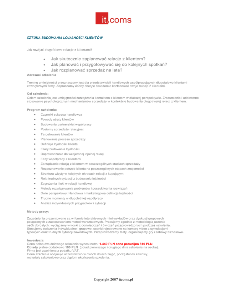SZTUKA BUDOWANIA LOJALNOŚCI KLIENTÓW Jak rowijać długofalowe relacje z klientami? • • • Jak skutecznie zaplanować relacje z klientem? Jak planować i przygotowywać się do kolejnych spotkań? Jak rozplanować sprzedaż na lata? Adresaci szkolenia Trening umiejętności przeznaczony jest dla przedstawicieli handlowych współpracujących długofalowo klientami zewnętrznymi firmy. Zapraszamy osoby chcące świadomie kształtować swoje relacje z klientami. Cel szkolenia: Celem szkolenia jest umiejętności zarządzania kontaktem z klientem w dłuższej perspektywie. Zrozumienie i adekwatne stosowanie psychologicznych mechanizmów sprzedaży w kontekście budowania długotrwałej relacji z klientem. Program szkolenia: • • • • • • • • • • • • • • • • • • • Czynniki sukcesu handlowca Powody utraty klientów Budowaniu partnerskiej współpracy Poziomy sprzedaży relacyjnej Targetowanie klientów Planowanie procesu sprzedaży Definicja lojalności klienta Filary budowania lojalności Doprowadzanie do wzajemnej lojalnej relacji Fazy współpracy z klientami Zarządzanie relacją z klientem w poszczególnych stadiach sprzedaży Rozpoznawanie potrzeb klienta na poszczególnych etapach znajomości Struktura wizyty w kolejnych okresach relacji z kupującym Rola trudnych sytuacji z budowaniu lojalności Zagrożenia i luki w relacji handlowej Metody rozwiązywania problemów i poszukiwania rozwiązań Dwie perspektywy: Handlowa i marketingowa definicja lojalności Trudne momenty w długoletniej współpracy Analiza indywidualnych przypadków i sytuacji Metody pracy: Zagadnienia prezentowane są w formie interaktywnych mini-wykładów oraz dyskusji grupowych połączonych z zastosowaniem metod warsztatowych. Pracujemy zgodnie z metodologią uczenia osób dorosłych: wyciągamy wnioski z doświadczeń i ćwiczeń przeprowadzonych podczas szkolenia. Stosujemy ćwiczenia indywidualne i grupowe, scenki rejestrowane na kamerę video z symulacjami typowych oraz trudnych sytuacji zawodowych. Przeprowadzamy testy, organizujemy gry i zabawy biznesowe. Inwestycja: Cena pełna dwudniowego szkolenia wynosi netto: 1.440 PLN cena prounijna 810 PLN Obiady płatne dodatkowo 100 PLN (obiad pierwszego i drugiego dnia szkolenia na osobę). Firma jest zwolniona z podatku VAT. Cena szkolenia obejmuje uczestnictwo w dwóch dniach zajęć, poczęstunek kawowy, materiały szkoleniowe oraz dyplom ukończenia szkolenia. Copyright 2007 itcoms.pl