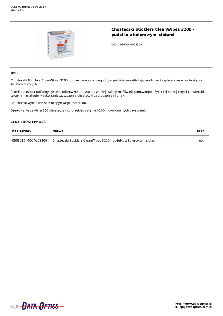 Data wydruku: 08-03-2017 strona 1/1 Chusteczki Sticklers CleanWipes 3200 pudełko z kolorowymi slotami 0601216-MCC-WCS800 OPIS Chusteczki Sticklers CleanWipes 3200 dostarczane są w wygodnym pudełku umożliwiającym łatwe i szybkie czyszczenie złączy światłowodowych. Pudełko posiada unikalny system kolorowych prowadnic zmniejszający możliwość ponownego użycia tej samej części chusteczki a także minimalizuje ryzyko zanieczyszczenia chusteczki zabrudzeniami z rąk. Chusteczki wykonane są z bezpyłowego materiału. Opakowanie zawiera 800 chusteczek co przekłada się na 3200 indywidualnych czyszczeń. CENY I DOSTĘPNOŚĆ Kod towaru Nazwa 0601216-MCC-WCS800 Chusteczki Sticklers CleanWipes 3200 - pudełko z kolorowymi slotami Jedn. op. http://www.dataoptics.pl [email protected] Powered by TCPDF (www.tcpdf.org)