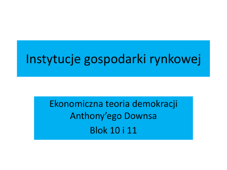 Instytucje gospodarki rynkowej Ekonomiczna teoria demokracji Anthony’ego Downsa Blok 10 i 11 Koncepcje badawcze A. Downs’a 1. Jak przekładają się interesy jednostek na interes społeczeństwa? 2. Krytyka założenia, że państwo jest altruistycznym jednorodnym podmiotem. 3. Założenia dot. sektora prywatnego (np. egoizm jednostek, interes własny, max. użyteczności) powinno stosować się do analizy dot. rządu. 4. Postulat zespolenia ekonomii i polityki w teorię „działania społecznego”. 5. Niemożność stworzenia jednej teorii rządu ze względu na różne systemy rządzenia. Założenia Modelu A. Downsa WYBORCA = KONSUMENT PARTIA = PRZEDSIĘBIORSTWO POLITYK = PRODUCENT PROGRAMY POLIT. i DZIAŁANIA WŁ. = PRODUKTY GŁOSY = PIENIĄDZE Partie i wyborcy kierują się zasadami maksymalizacji użyteczności i racjonalnego wyboru Homo oeconomicus – rozciąga się na sferę zachowań politycznych Założenia Modelu A. Downsa 1. Partia lub koalicja sprawuje władzę przez 1 kadencję. 2. Każdy obywatel ma 1 głos. 3. Nielegalne przejęcie władzy lub ograniczenie prawa wyborczego jest niedopuszczalne. 4. Istnieją co najmniej 2 konkurencyjne partie. 5. Preferencje polityczne obywateli można uszeregować od lewicowych do prawicowych. 6. Preferencje wyborców są ściśle określone na skali polit. 7. Partie znają preferencje polityczne wyborców. 8. Wyborcy znają preferencje polityczne partii. Racjonalne głosowanie 1. „Racjonalny wyborca” – użyteczność danej polityki ma decydujący wpływ na decyzje wyborcy. …(???). 2. Dodatnia zależność pomiędzy pożytkiem z danej polityki, a poparciem. … (???). 3. Obywatel-wyborca tworzy własny obraz rynku politycznego. Szereguje partie na skali politycznej wg korzyści jakie uzyska z realizacji ich polityki. Skala polityczna Korzyści dla max wyborcy z realizacji programu danej partii 0 Partia 1 Partia 2 Partia3 Partia 4 „Oczekiwane zróżnicowanie partii” (OZP) Jakie korzyści zapewni wyborcy rząd prowadząc dotychczasową politykę (Krz t+1)? Rząd Opozycja OZP = H(Krz t+1) – H(Kop t+1) Wyborca jest świadom, że partie składają obietnice bez pokrycia. Jeśli OZP < 0, to wyborca wybierze opozycję lub zagłosuje tak, aby partia, którą ocenia najgorzej, nie objęła rządów. Bieżące zróżnicowanie partii (BZP) Porównanie bieżących działań rządu z hipotetycznymi wynikami, gdyby rządziła opozycja Rząd Opozycja BZP = (Krz t) – H(Kop t) Dodatkowo wyborcy oceniają: - Czynniki trendu (trend factors). - Ocenę działalności w praktyce (performance ratings) Gdy BZP oscyluje wokół „0” wówczas podstawą oddania głosu jest ocena praktyki rządzenia (zachowania) poszczególnych partii teraz i w przeszłości. Racjonalny wyborca a wielopartyjność Ocena jak głosują inni i wybór preferowanej partii Korzyści wyborcy Wielkość poparcia Partia 1 Partia 2 Partia 3 Partia 4 - korzyści wyborcy … a jeśli prawdopodobna jest - prawdopodobne poparcie koalicja …..? Niepewność i koszty udziału w wyborach WYBORCA NIEPEWNOŚĆ DECYZJA Trzy poziomy zaufania: 1. Rozwaga (logiczne myślenie). 2. Wiedza kontekstowa (to świadomość idei głoszonych przez partie wraz z ich kontekstem). 3. Informacja (wiedza o bieżących wydarzeniach) Przywództwo a informacja Przywództwo – zdolność do takiego wpływania na wyborców, by przyjęli pewne opinie jako ich własne. Przywództwo możliwe jest jedynie w świecie niepewności, gdzie przywódcy zdobywają wyborców w mniejszej lub większej proporcji do ich braku informacji. Poparcie dla przywódcy 0 Wiedza Rodzaje przywódców Partie polityczne – org. społ. mające programy polityczne i biorące udział w wyborach w celu ich wygrania. Grupy interesu – zorganizowane grupy reprezentujące określone cele (gospodarcze, społeczne, itp.) promujące własne interesy, tak aby zostały one uwzględnione w programach partii. Agenci medialni – podmioty, które za wynagrodzeniem ze strony danej partii wpływają na opinię publiczną w celu zwiększenia szans wyborczych Przywódcy a ideologie IDEOLOGIE – werbalne obrazy społeczeństwa (odcień normatywny: wyobrażenia o prawidłowym kształcie społeczeństwa). Służą do identyfikacji partii na konkurencyjnym rynku politycznym. PARTIE TWORZĄ IDEOLOGIE Partia A Partia B Partia C Ideologia A Ideologia B Ideologia C „REKLAMA” „REKLAMA” „REKLAMA” „REKLAMA” wyborcy, wyborcy, wyborcy, wyborcy, wyborcy wyborcy Wyborca a ideologie Koszty uzyskania informacji + Brak wyraźnych różnic pomiędzy partiami w zakresie konkretnych spraw Wyborca głosuje na podstawie różnic ideologicznych Zróżnicowanie programów partii zostaje zastąpione zróżnicowaniem ideologicznym (ideology differencial) Udział w wyborach Czynniki determinujące oczekiwaną użyteczność udziału w wyborach: 1. Zróżnicowanie partii / ideologii – im większe, tym większa motywacja do udziału w wyborach. 2. Ocena wpływu „głosu” na wynik wyborów. 3. Znaczenie, jakie przywiązuje wyborca do życia w demokracji. 4. Wielkość ogólnej frekwencji. „Długookresowa wartość z partycypacji” a problem „gapowicza” (Long-run participation value) (free-riding) Model wyborów Koszty udziału w wyborach: -bezpośrednie, -Informacji (zbierania i przetwarzania) Spodziewane korzyści od partii, na którą głosuje GŁOS WYBORCA Udział w wyborach to transakcja „kupna-sprzedaży” Wyborca ma słabe bodźce do zdobywania i przetwarzania kolejnych informacji, gdyż krańcowa użyteczność z ich pozyskiwania jest bliska zeru. Większość wyborców ma niewielkie bodźce do powiększania informacji – to tzw. „racjonalna ignorancja” Konkurujące partie (podażowa strona polityki) „Głównym motywem polityków jest zdobycie władzy w celu osiągania związanych z nią korzyści. Zatem politycy formułują programy w celu zdobycia władzy, a nie dążą do władzy w celu wprowadzania swoich programów w ży