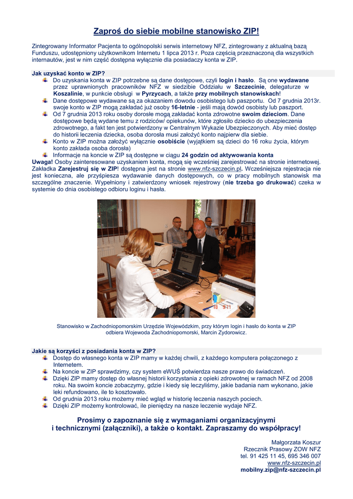 Zaproś do siebie mobilne stanowisko ZIP! Zintegrowany Informator Pacjenta to ogólnopolski serwis internetowy NFZ, zintegrowany z aktualną bazą Funduszu, udostępniony użytkownikom Internetu 1 lipca 2013 r. Poza częścią przeznaczoną dla wszystkich internautów, jest w nim część dostępna wyłącznie dla posiadaczy konta w ZIP. Jak uzyskać konto w ZIP? Do uzyskania konta w ZIP potrzebne są dane dostępowe, czyli login i hasło. Są one wydawane przez uprawnionych pracowników NFZ w siedzibie Oddziału w Szczecinie, delegaturze w Koszalinie, w punkcie obsługi w Pyrzycach, a także przy mobilnych stanowiskach! Dane dostępowe wydawane są za okazaniem dowodu osobistego lub paszportu. Od 7 grudnia 2013r. swoje konto w ZIP mogą zakładać już osoby 16-letnie - jeśli mają dowód osobisty lub paszport. Od 7 grudnia 2013 roku osoby dorosłe mogą zakładać konta zdrowotne swoim dzieciom. Dane dostępowe będą wydane temu z rodziców/ opiekunów, które zgłosiło dziecko do ubezpieczenia zdrowotnego, a fakt ten jest potwierdzony w Centralnym Wykazie Ubezpieczonych. Aby mieć dostęp do historii leczenia dziecka, osoba dorosła musi założyć konto najpierw dla siebie. Konto w ZIP można założyć wyłącznie osobiście (wyjątkiem są dzieci do 16 roku życia, którym konto zakłada osoba dorosła) Informacje na koncie w ZIP są dostępne w ciągu 24 godzin od aktywowania konta Uwaga! Osoby zainteresowane uzyskaniem konta, mogą się wcześniej zarejestrować na stronie internetowej. Zakładka Zarejestruj się w ZIP! dostępna jest na stronie www.nfz-szczecin.pl. Wcześniejsza rejestracja nie jest konieczna, ale przyśpiesza wydawanie danych dostępowych, co w pracy mobilnych stanowisk ma szczególne znaczenie. Wypełniony i zatwierdzony wniosek rejestrowy (nie trzeba go drukować) czeka w systemie do dnia osobistego odbioru loginu i hasła. Stanowisko w Zachodniopomorskim Urzędzie Wojewódzkim, przy którym login i hasło do konta w ZIP odbiera Wojewoda Zachodniopomorski, Marcin Zydorowicz. Jakie są korzyści z posiadania konta w ZIP? Dostęp do własnego konta w ZIP mamy w każdej chwili, z każdego komputera połączonego z Internetem. Na koncie w ZIP sprawdzimy, czy system eWUŚ potwierdza nasze prawo do świadczeń. Dzięki ZIP mamy dostęp do własnej historii korzystania z opieki zdrowotnej w ramach NFZ od 2008 roku. Na swoim koncie zobaczymy, gdzie i kiedy się leczyliśmy, jakie badania nam wykonano, jakie leki refundowano, ile to kosztowało. Od grudnia 2013 roku możemy mieć wgląd w historię leczenia naszych pociech. Dzięki ZIP możemy kontrolować, ile pieniędzy na nasze leczenie wydaje NFZ. Prosimy o zapoznanie się z wymaganiami organizacyjnymi i technicznymi (załączniki), a także o kontakt. Zapraszamy do współpracy! Małgorzata Koszur Rzecznik Prasowy ZOW NFZ tel. 91 425 11 45, 695 346 007 www.nfz-szczecin.pl [email protected]