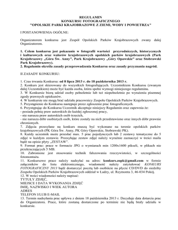 REGULAMIN KONKURSU FOTOGRAFICZNEGO "OPOLSKIE PARKI KRAJOBRAZOWE Z ZIEMI, WODY I POWIETRZA" I POSTANOWIENIA OGÓLNE: Organizatorem konkursu jest Zespół Opolskich Parków Krajobrazowych zwany dalej Organizatorem. 1. Celem konkursu jest pokazanie w fotografii wartości przyrodniczych, historycznych i kulturowych oraz walorów krajobrazowych opolskich parków krajobrazowych (Park Krajobrazowy „Góra Św. Anny”, Park Krajobrazowy „Góry Opawskie” oraz Stobrawski Park Krajobrazowy). 2. Regulamin określa zasady przeprowadzenia Konkursu oraz zasady przyznania nagród. II ZASADY KONKURSU: 1. Czas trwania Konkursu: od 8 lipca 2013 r. do 18 października 2013 r. 2. Konkurs jest skierowany do wszystkich fotografujących. Uczestnikiem Konkursu (zwanym dalej Uczestnikiem) może być każda osoba, która spełni wymogi niniejszego regulaminu. 3. W Konkursie biorą udział osoby pełnoletnie lub też niepełnoletnie po wyrażeniu pisemnej zgody prawnych opiekunów. 4. W konkursie nie mogą brać udziału pracownicy Zespołu Opolskich Parków Krajobrazowych. 5. Przystąpienie do Konkursu następuje przez zgłoszenie prac fotograficznych. 6. Przystępując do Konkursu Uczestnik akceptuje niniejszy Regulamin oraz zapewnia że: - posiada pełnię praw autorskich do każdej zgłoszonej pracy, - nie narusza praw autorskich osób trzecich, - nie narusza dóbr osobistych osób, które zostały na nich przedstawione oraz innych dóbr prawnie chronionych. 7. Zdjęcia przesyłane na konkurs muszą być wykonane na terenie opolskich parków krajobrazowych (PK Góra Św. Anny, PK Góry Opawskie, Stobrawski PK). 8. Każdy uczestnik może przesłać max. 5 prac pojedynczych lub 2 zestawy tematyczne do 5 zdjęć w każdym zestawie. Przesyłając zestaw zdjęć należy wyraźnie zaznaczyć w treści maila bądź na opisie płyty „ZESTAW”. 9. Format prac: prace w formacie JPG o wymiarach min 1200x1600 pikseli, w plikach nie przekraczających 5 MB. 10. Zabronione jest stosowanie technik fałszowania rzeczywistości, w szczególności fotomontażu. 11. Konkursowe prace należy nadsyłać na adres: [email protected] w formie załączników do listu elektronicznego, wiadomość należy zatytułować KONKURS FOTOGRAFICZNY 2013 bądź dostarczyć pocztą lub osobiście na płycie CD/DVD do siedziby Zespołu Opolskich Parków Krajobrazowych oddział w Ładzy, ul. Reymonta 3, 46-034 Pokój. 12. W treści wiadomości należy napisać: TYTUŁY ZDJĘĆ, MIEJSCE I DATA WYKONANIA ZDJĘĆ IMIĘ, NAZWISKO I WIEK AUTORA ADRES TELEFON I/LUB E-MAIL 13. Termin nadsyłania prac upływa z dniem 18 października 2013 r. Decyduje data dotarcia prac do Organizatora. Prace, które zostaną dostarczone po terminie nie będą brały udziału w konkursie. III. NAGRODY, SPOSÓB I TERMIN REALIZACJI WYGRANYCH 1. Prace zostaną ocenione przez jury w składzie powołanym przez Organizatora. Decyzja jury jest ostateczna. 2. W konkursie do wygrania są nagrody rzeczowe, m.in. cyfrowe aparaty fotograficzne o łącznej wartości ok. 4 000 zł. 3. Jury zastrzega sobie prawo przyznania wyróżnień. 4. Informację o wynikach konkursu oraz o miejscu i terminie wręczenia nagród zostaną zamieszczone na stronie Organizatora: www.zopk.pl 5. Nadesłane prace mogą zostać zaprezentowane na wystawie pokonkursowej w siedzibach Organizatora, lub w innych wybranych miejscach oraz na stronie internetowej Organizatora: www.zopk.pl. 6. Organizator zastrzega sobie ponadto prawo do nieodpłatnej publikacji zgłoszonych do konkursu zdjęć w materiałach związanych z konkursem, materiałach edukacyjnych i promocyjnych Zespołu Opolskich Parków Krajobrazowych, z zaznaczeniem imienia i nazwiska autora. 7. Uczestnik Konkursu wyraża zgodę na postanowienia określone w Regulaminie konkursu. 8. Organizator nie zwraca nadesłanych prac. 9. Nadesłanie prac oznacza akceptację warunków konkursu. IV. POSTANOWIENIA KOŃCOWE 1. Wzięcie udziału w Konkursie (przesłanie prac) jest równoznaczne z wyrażeniem zgody na wykorzystywanie danych osobowych Uczestnika zgodnie z art. 24 ust. 1 Ustawy z dnia 29 sierpnia 1997 r. o ochronie danych osobowych (Dz. U. Nr 133, poz. 883). 2. Uczestnicy ponoszą pełną odpowiedzialność za zgodność z prawdą danych nadesłanych wraz z pracami. Organizator nie ponosi odpowiedzialności prawnej za skutki podania przez Uczestnika nieprawdziwych bądź cudzych danych. 3. Organizator nie ponosi odpowiedzialności prawnej za naruszenie praw autorskich innych osób przez Uczestników Konkursu. 4. Wzięcie udziału w Konkursie (przesłanie prac) jest równoznaczne z wyrażeniem zgody na wykorzystanie wizerunku osób widniejących na nadesłanych zdjęciach, przez Organizatora konkursu - Zespół Opolskich Parków Krajobrazowych, do celów informacyjnych poprzez zamieszczenie na stronie internetowej ZOPK, oraz w innych materiałach związanych z konkursem, w tym dotyczących publikacji, których zadaniem jest szeroko rozumiana promocja i edukacja. 5. Organizator zastrzega sobie prawo do skrócenia, przedłużenia, przerwania lub odwołania Konkursu bez podania przyczyn. 6. Niniejszy regulamin jest jedynym dokumentem określającym zasady Konkursu i może on być zmieniany przez Organizatora w dowolnym czasie poprzez zamieszczenie zmian na stronie internetowej www.zopk.pl. Wszelkie zmiany do regulaminu stają się skuteczne w chwili ich zamieszczenia na ww. stronie internetowej, o ile nie zastrzeżono inaczej. 7. We wszystkich sprawach nieobjętych niniejszym regulaminem decyduje Organizator. 8. Niniejszy Konkurs nie jest „grą losową” w rozumieniu ustawy z 29 lipca 1992 r. o grach losowych i zakładach wzajemnych (Dz. U. Nr 68, poz. 341 z późn. zm.).