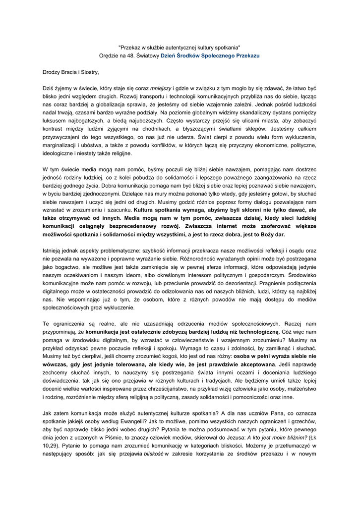 "Przekaz w służbie autentycznej kultury spotkania" Orędzie na 48. Światowy Dzień Środków Społecznego Przekazu Drodzy Bracia i Siostry, Dziś żyjemy w świecie, który staje się coraz mniejszy i gdzie w związku z tym mogło by się zdawać, że łatwo być blisko jedni względem drugich. Rozwój transportu i technologii komunikacyjnych przybliża nas do siebie, łącząc nas coraz bardziej a globalizacja sprawia, że jesteśmy od siebie wzajemnie zależni. Jednak pośród ludzkości nadal trwają, czasami bardzo wyraźne podziały. Na poziomie globalnym widzimy skandaliczny dystans pomiędzy luksusem najbogatszych, a biedą najuboższych. Często wystarczy przejść się ulicami miasta, aby zobaczyć kontrast między ludźmi żyjącymi na chodnikach, a błyszczącymi światłami sklepów. Jesteśmy całkiem przyzwyczajeni do tego wszystkiego, co nas już nie uderza. Świat cierpi z powodu wielu form wykluczenia, marginalizacji i ubóstwa, a także z powodu konfliktów, w których łączą się przyczyny ekonomiczne, polityczne, ideologiczne i niestety także religijne. W tym świecie media mogą nam pomóc, byśmy poczuli się bliżej siebie nawzajem, pomagając nam dostrzec jedność rodziny ludzkiej, co z kolei pobudza do solidarności i lepszego poważnego zaangażowania na rzecz bardziej godnego życia. Dobra komunikacja pomaga nam być bliżej siebie oraz lepiej poznawać siebie nawzajem, w byciu bardziej zjednoczonymi. Dzielące nas mury można pokonać tylko wtedy, gdy jesteśmy gotowi, by słuchać siebie nawzajem i uczyć się jedni od drugich. Musimy godzić różnice poprzez formy dialogu pozwalające nam wzrastać w zrozumieniu i szacunku. Kultura spotkania wymaga, abyśmy byli skłonni nie tylko dawać, ale także otrzymywać od innych. Media mogą nam w tym pomóc, zwłaszcza dzisiaj, kiedy sieci ludzkiej komunikacji osiągnęły bezprecedensowy rozwój. Zwłaszcza internet może zaoferować większe możliwości spotkania i solidarności między wszystkimi, a jest to rzecz dobra, jest to Boży dar. Istnieją jednak aspekty problematyczne: szybkość informacji przekracza nasze możliwości refleksji i osądu oraz nie pozwala na wyważone i poprawne wyrażanie siebie. Różnorodność wyrażanych opinii może być postrzegana jako bogactwo, ale możliwe jest także zamknięcie się w pewnej sferze informacji, które odpowiadają jedynie naszym oczekiwaniom i naszym ideom, albo określonym interesom politycznym i gospodarczym. Środowisko komunikacyjne może nam pomóc w rozwoju, lub przeciwnie prowadzić do dezorientacji. Pragnienie podłączenia digitalnego może w ostateczności prowadzić do odizolowania nas od naszych bliźnich, ludzi, którzy są najbliżej nas. Nie wspominając już o tym, że osobom, które z różnych powodów nie mają dostępu do mediów społecznościowych grozi wykluczenie. Te ograniczenia są realne, ale nie uzasadniają odrzucenia mediów społecznościowych. Raczej nam przypominają, że komunikacja jest ostatecznie zdobyczą bardziej ludzką niż technologiczną. Cóż więc nam pomaga w środowisku digitalnym, by wzrastać w człowieczeństwie i wzajemnym zrozumieniu? Musimy na przykład odzyskać pewne poczucie refleksji i spokoju. Wymaga to czasu i zdolności, by zamilknąć i słuchać. Musimy też być cierpliwi, jeśli chcemy zrozumieć kogoś, kto jest od nas różny: osoba w pełni wyraża siebie nie wówczas, gdy jest jedynie tolerowana, ale kiedy wie, że jest prawdziwie akceptowana. Jeśli naprawdę zechcemy słuchać innych, to nauczymy się postrzegania świata innymi oczami i doceniania ludzkiego doświadczenia, tak jak się ono przejawia w różnych kulturach i tradycjach. Ale będziemy umieli także lepiej docenić wielkie wartości inspirowane przez chrześcijaństwo, na przykład wizję człowieka jako osoby, małżeństwo i rodzinę, rozróżnienie między sferą religijną a polityczną, zasady solidarności i pomocniczości oraz inne. Jak zatem komunikacja może służyć autentycznej kulturze spotkania? A dla nas uczniów Pana, co oznacza spotkanie jakiejś osoby według Ewangelii? Jak to możliwe, pomimo wszystkich naszych ograniczeń i grzechów, aby być naprawdę blisko jedni wobec drugich? Pytania te można podsumować w tym pytaniu, które pewnego dnia jeden z uczonych w Piśmie, to znaczy człowiek mediów, skierował do Jezusa: A kto jest moim bliźnim? (Łk 10,29). Pytanie to pomaga nam zrozumieć komunikację w kategoriach bliskości. Możemy je przetłumaczyć w następujący sposób: jak się przejawia bliskość w zakresie korzystania ze środków przekazu i w nowym środowisku stworzonym przez technologie digitalne? Odpowiedź znajduję w przypowieści o miłosiernym Samarytaninie, która jest także przypowieścią o człowieku przekazu. Ten bowiem, kto przekazuje, staje się bliźnim. A miłosierny Samarytanin nie tylko czyni siebie bliźnim, ale troszczy się o tego człowieka, którego widzi na wpół umarłego obok drogi. Jezus odwraca perspektywę: nie chodzi o rozpoznanie innego jako podobnego do mnie, ale o moją zdolność uczynienia siebie podobnym do drugiego. Przekazywanie oznacza więc uświadomienie sobie, że jesteśmy ludźmi, Bożymi dziećmi. Lubię nazywać tę moc komunikacji jako bliskość. Kiedy dominującym celem komunikacji jest nakłonienie do konsumpcji lub manipulacja osobami, to mamy do czynienia z gwałtowną agresją, jak ta której doznał człowiek, który wpadł w ręce zbójców i został porzucony przy drodze, jak czytamy w przypowieści. Lewita i kapłan nie widzieli w nim bliźniego, lecz obcego, od którego lepiej było trzymać się z daleka. W tamtym czasie oddziaływały na nich zasady czystości rytualnej. Dziś grozi nam, że niektóre media tak na nas wpłyną, iż zapomnimy o naszym realnym bliźnim. Nie wystarczy przechodzić wzdłuż alei cyfrowych, to znaczy zwyczajnie być podłączonymi: trzeba, aby połączeniu towarzyszyło prawdziwe spotkanie.